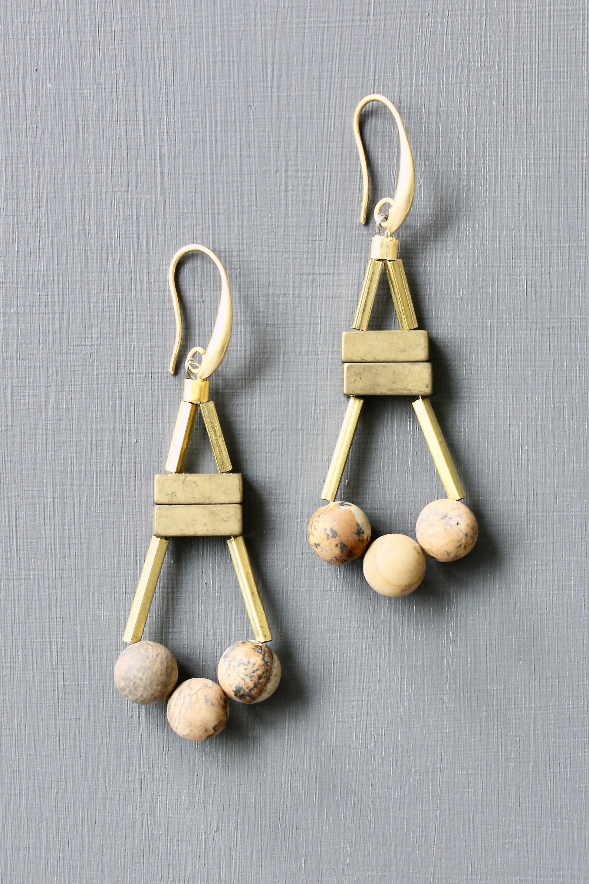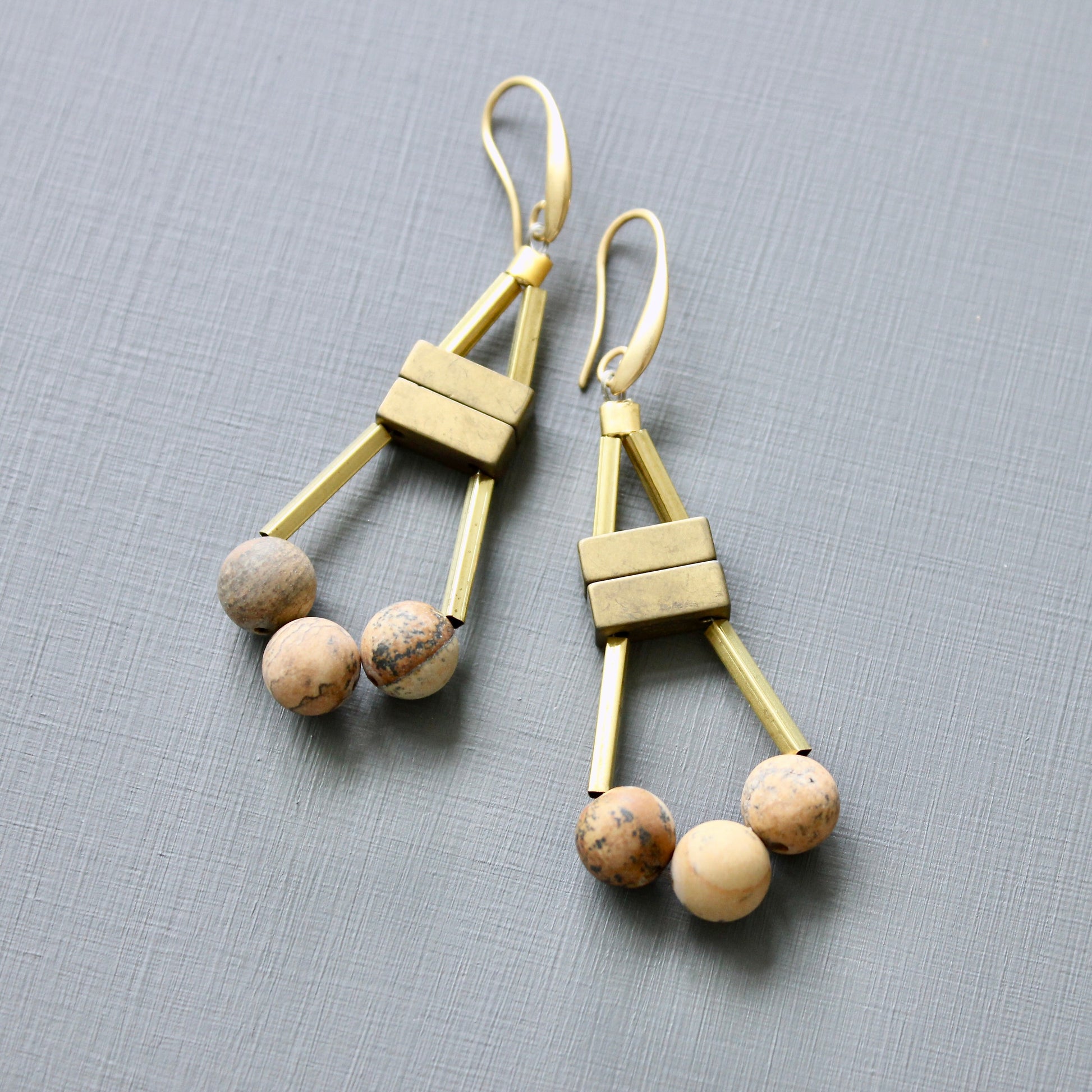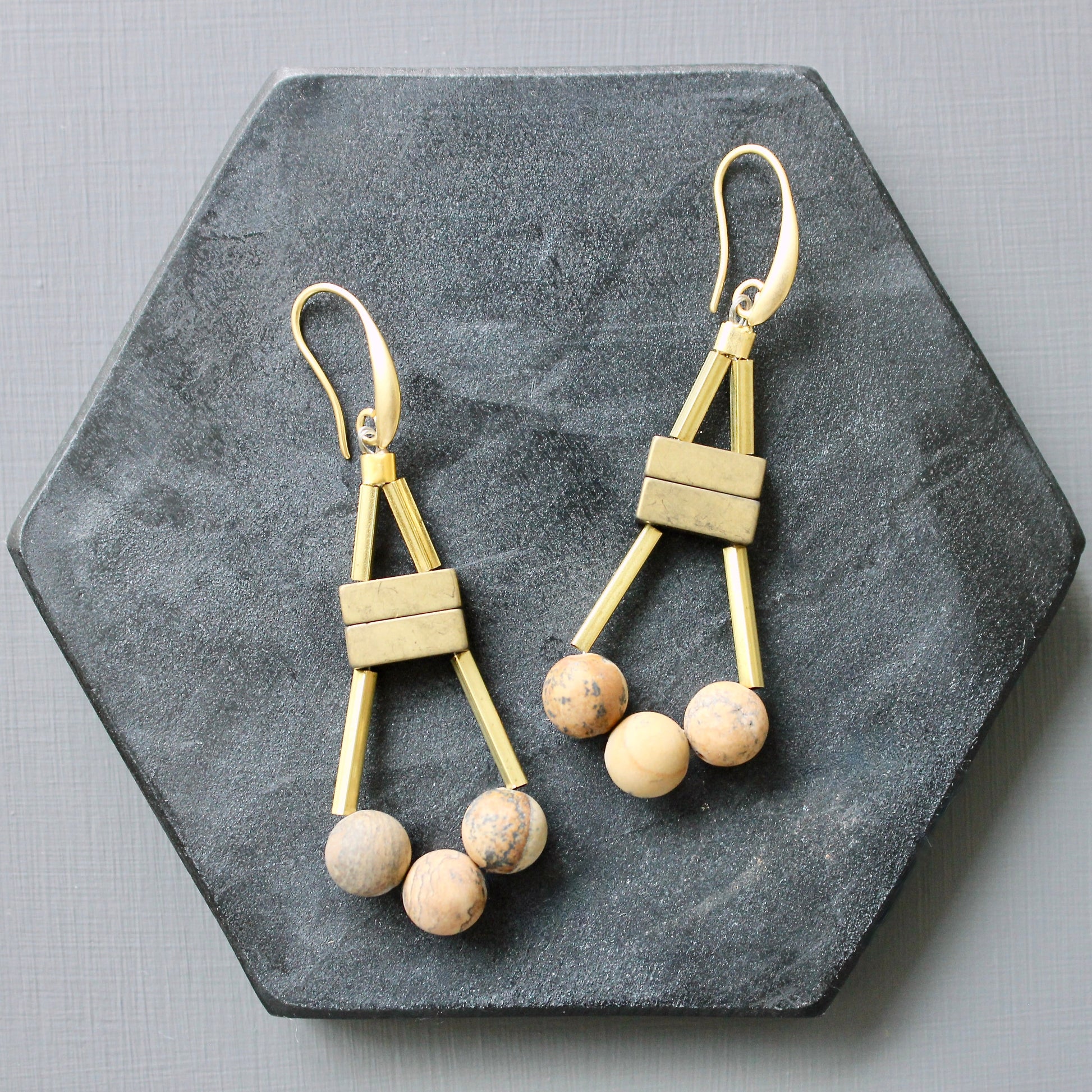 18k Gold plated brass hooks with hematite and jasper. Each earring weighs .215 oz. and measures 2.75 inches in length from top to bottom.