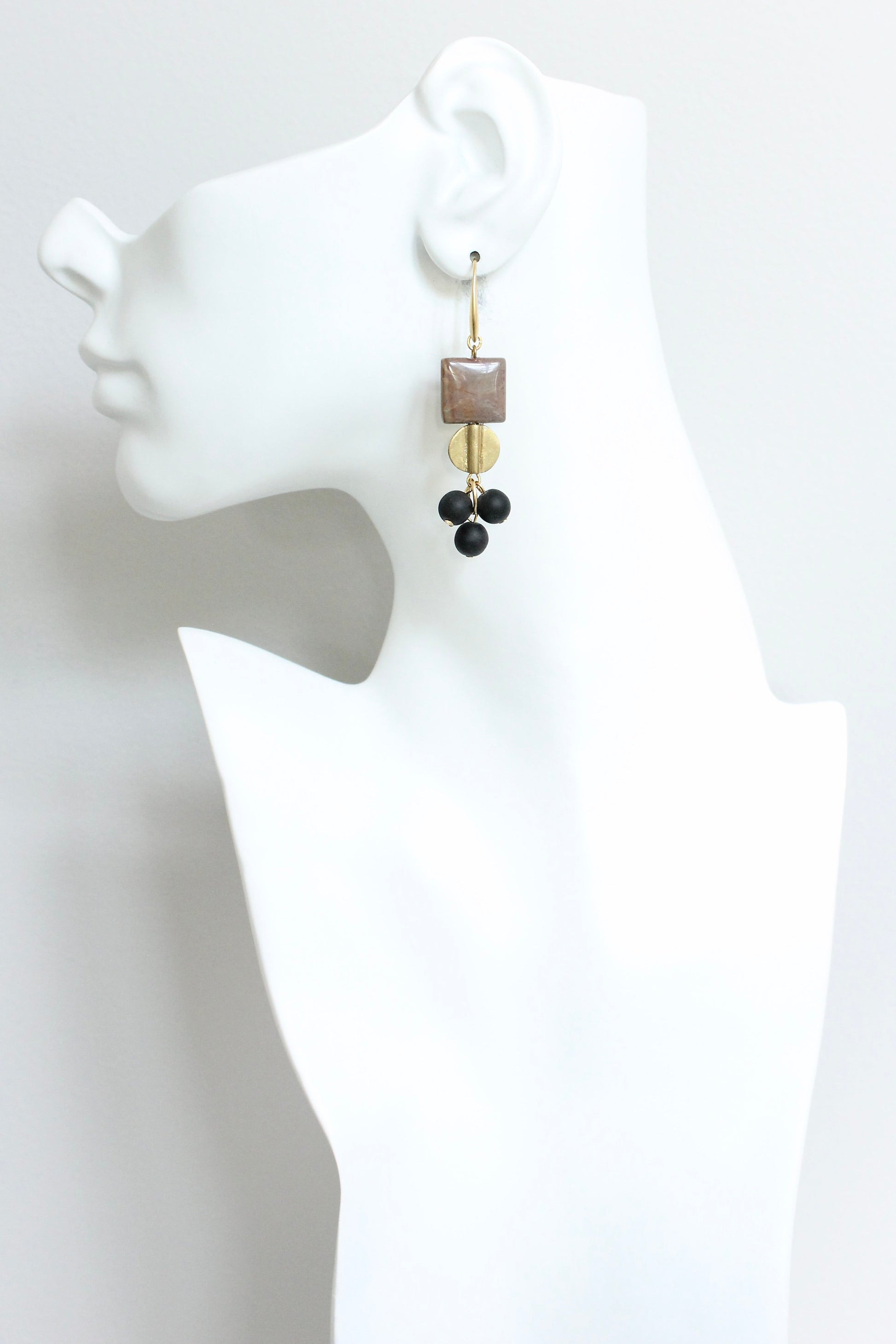 18k Gold plated brass hooks with purple aventurine, brass, and black glass. Each earring weighs .275 oz. and measures 2.75 inches in length from top to bottom.