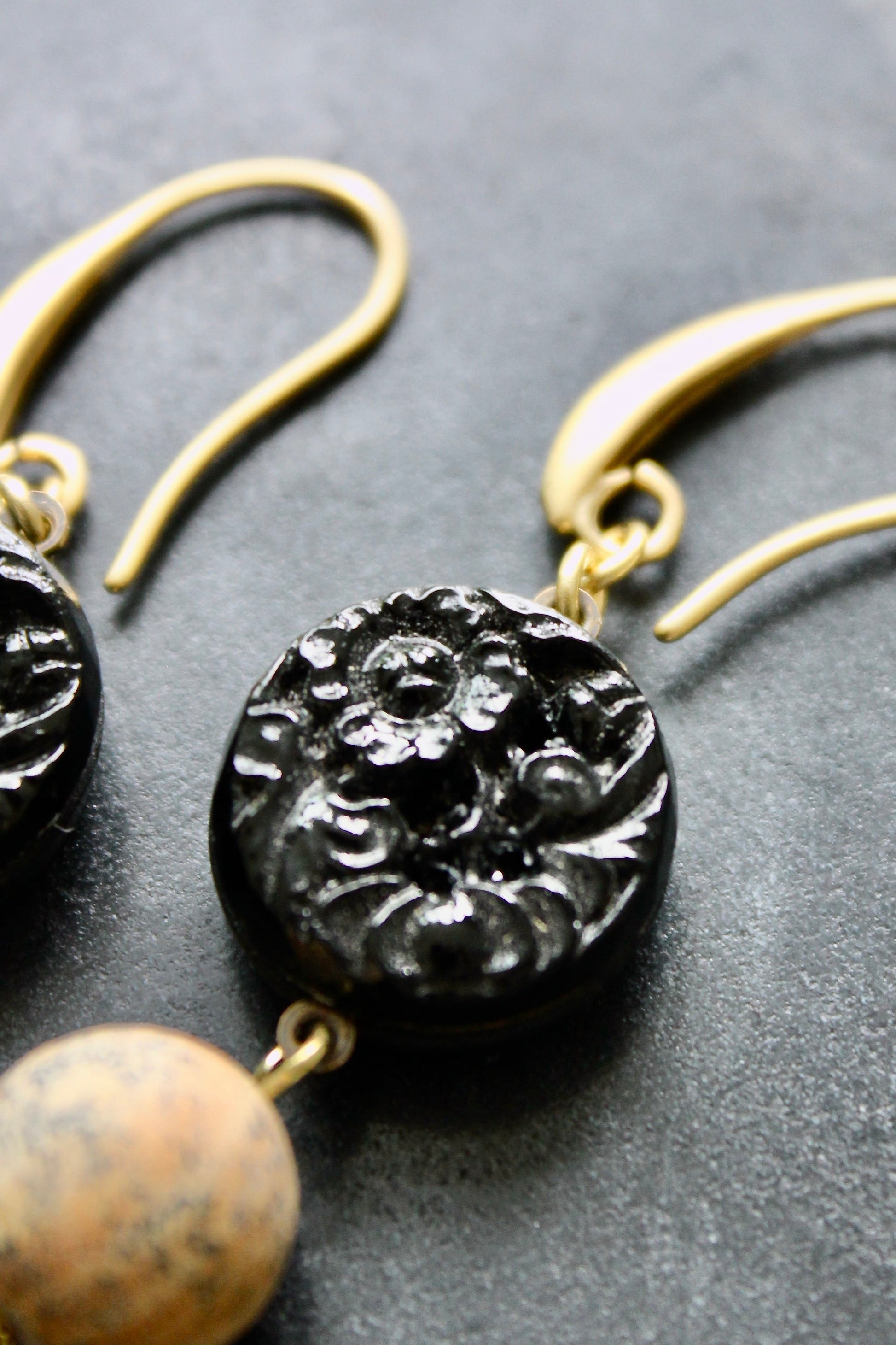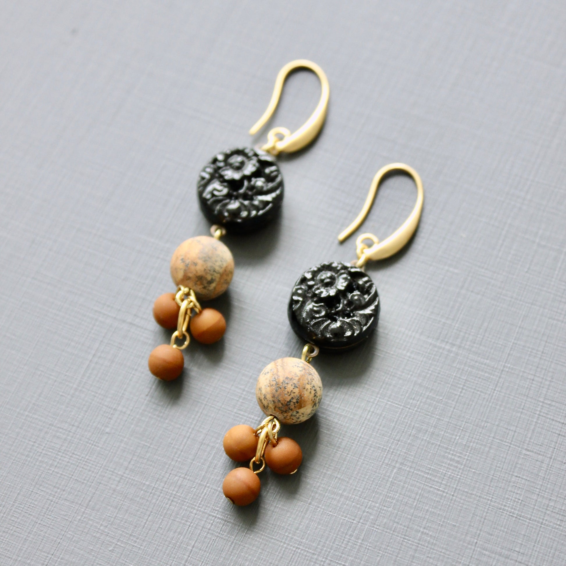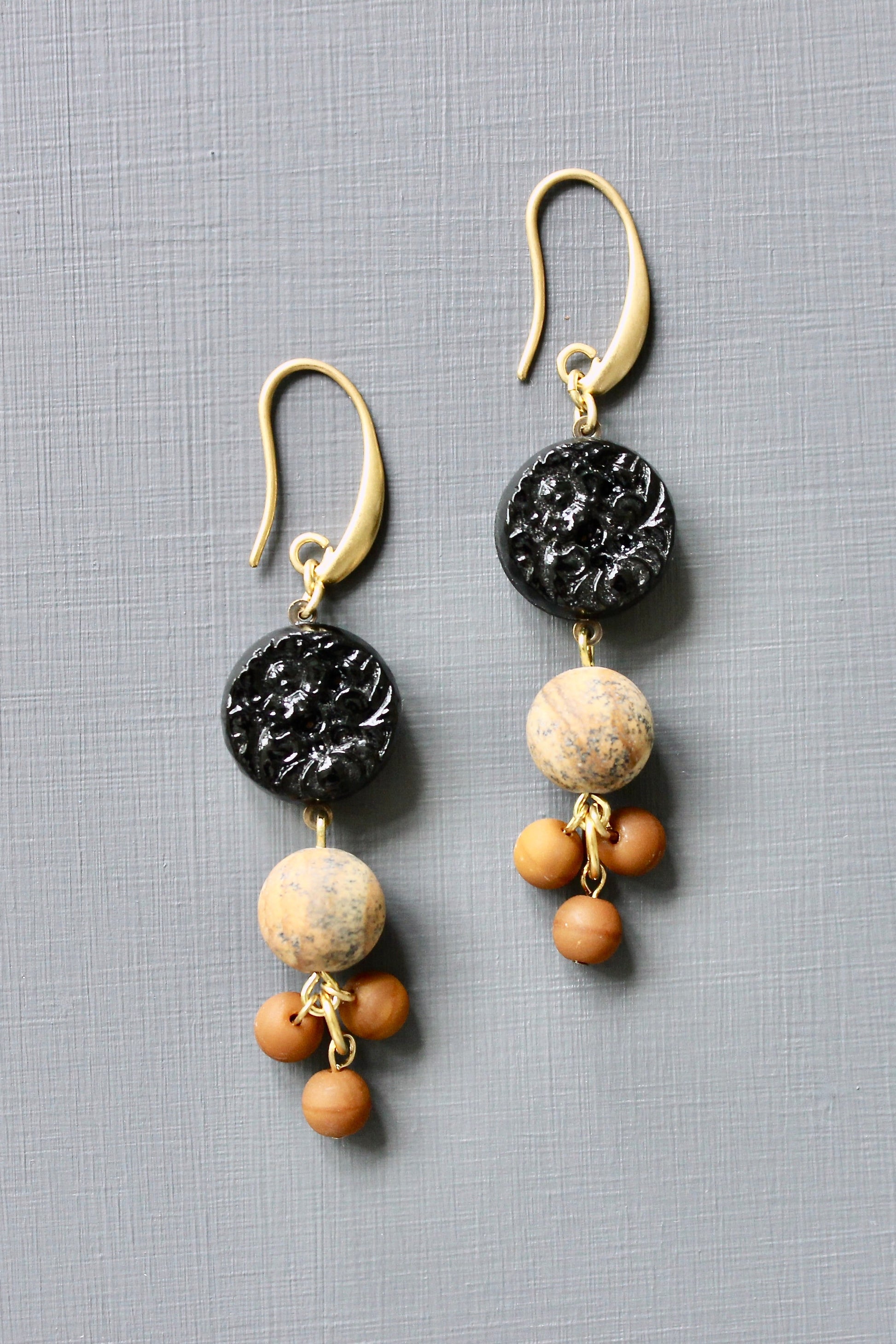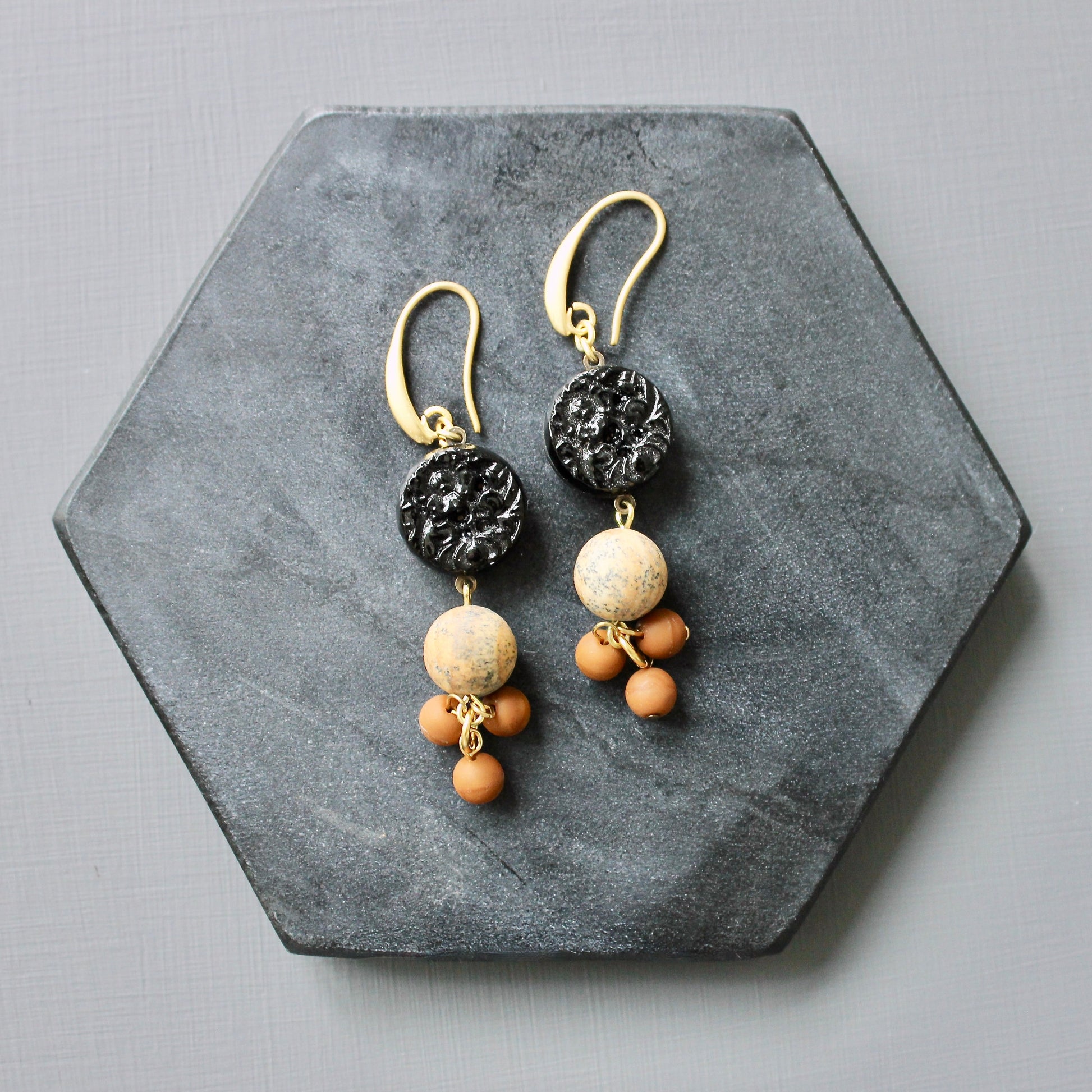 18k Gold plated brass hooks with vintage Japanese pressed glass, jasper, and glass. Each earring weighs .225 oz. and measures 2.75 inches in length from top to bottom.