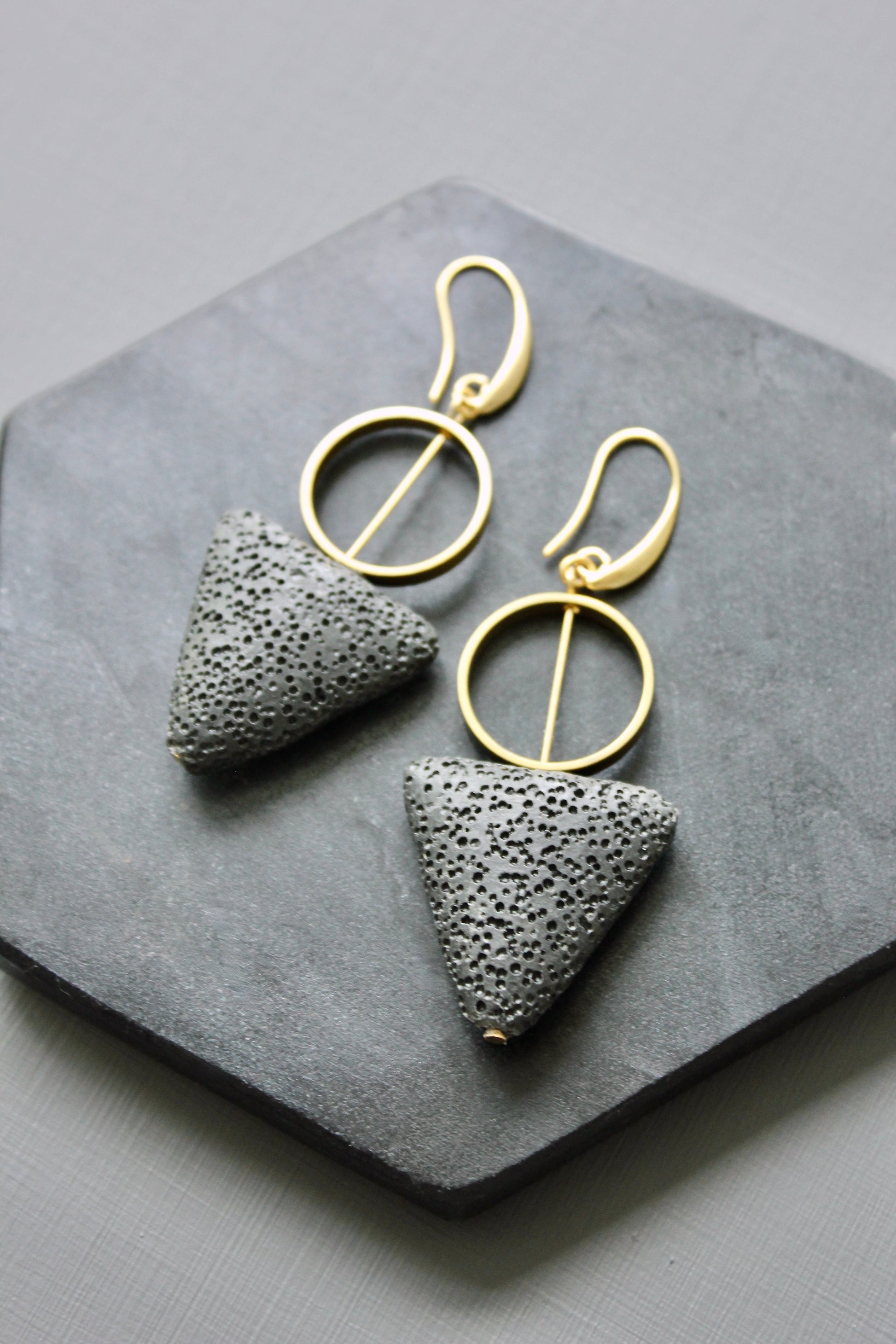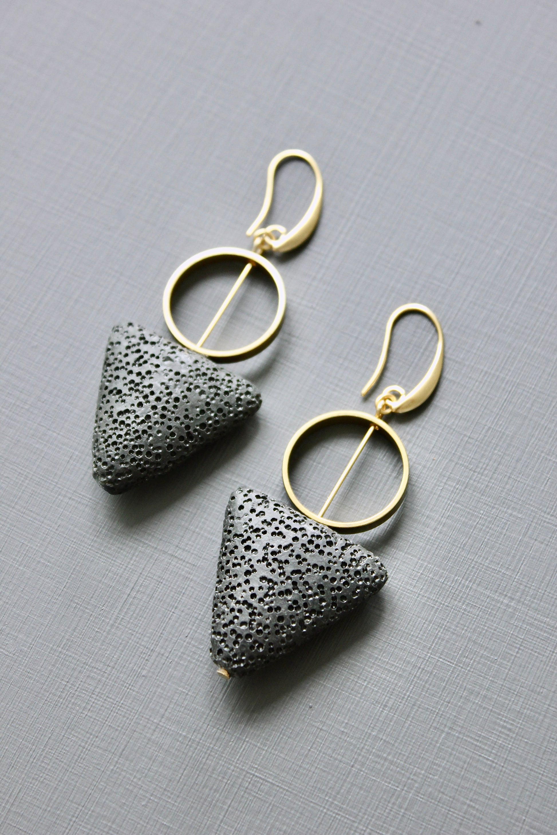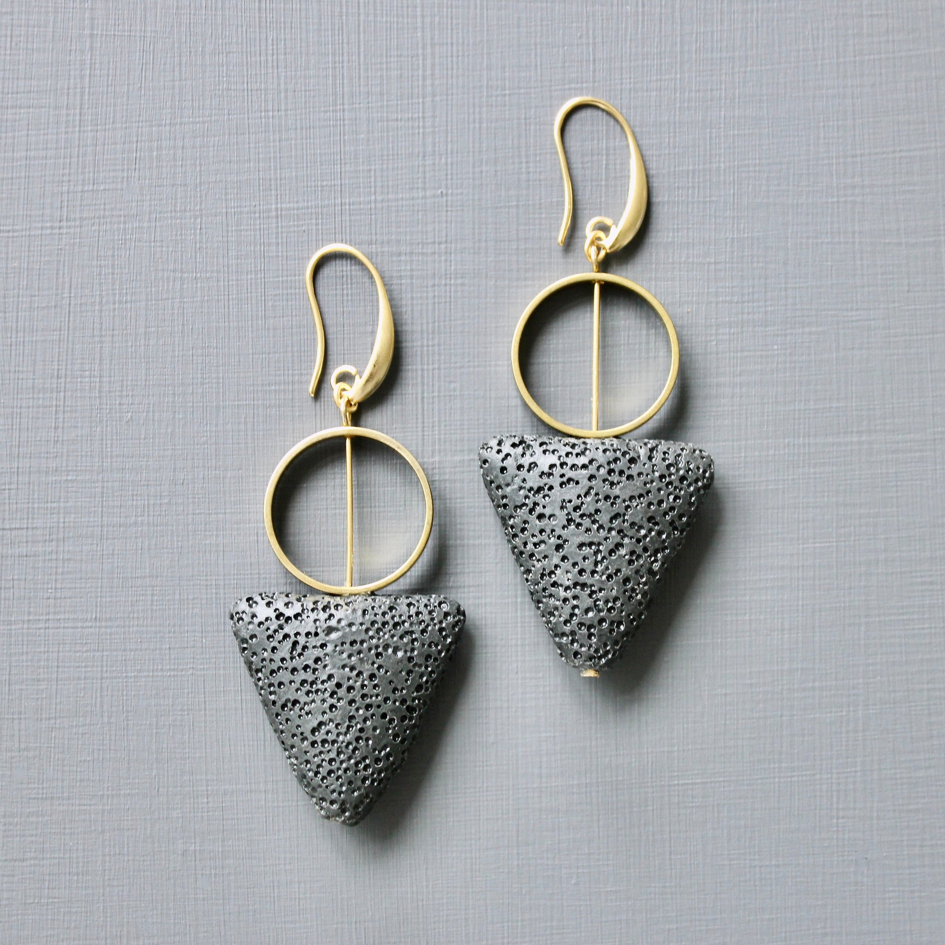 18k Gold plated brass hooks with lava triangle drop and brass. Each earring weighs .24 oz. and measures 2.875 inches in length from top to bottom.