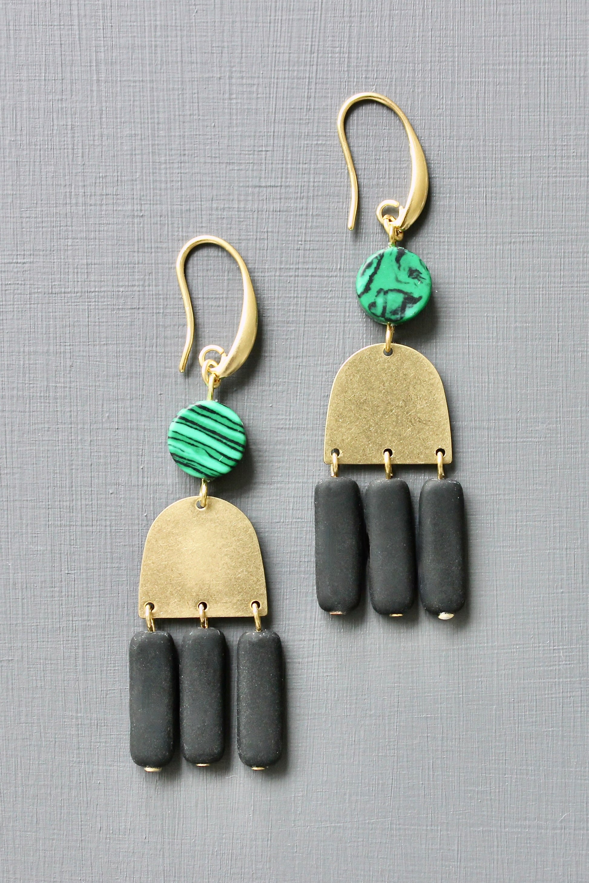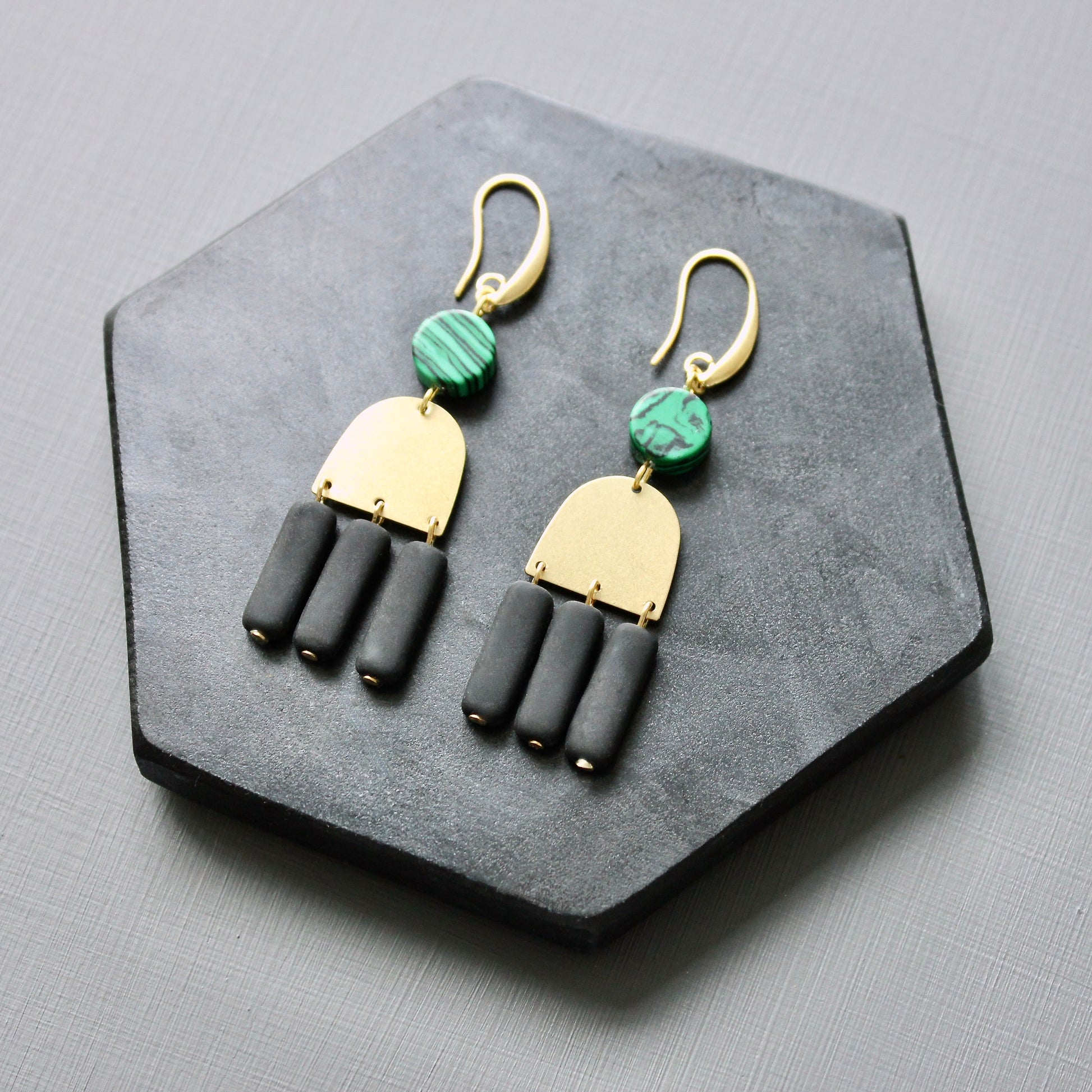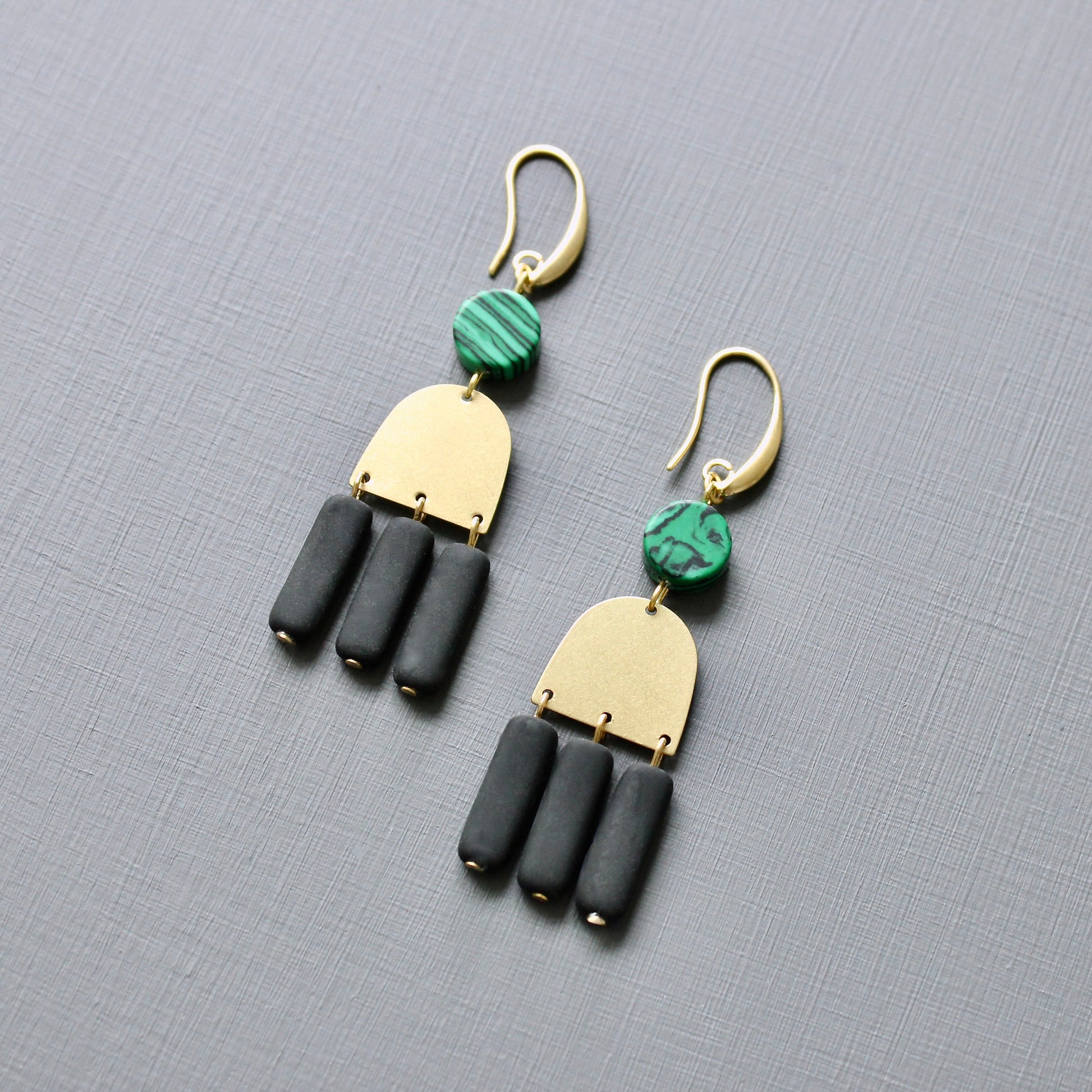 18k Gold plated brass hooks with synthetic malachite and matte black glass. Each earring weighs .165 oz. and measures 2.75 inches in length from top to bottom.