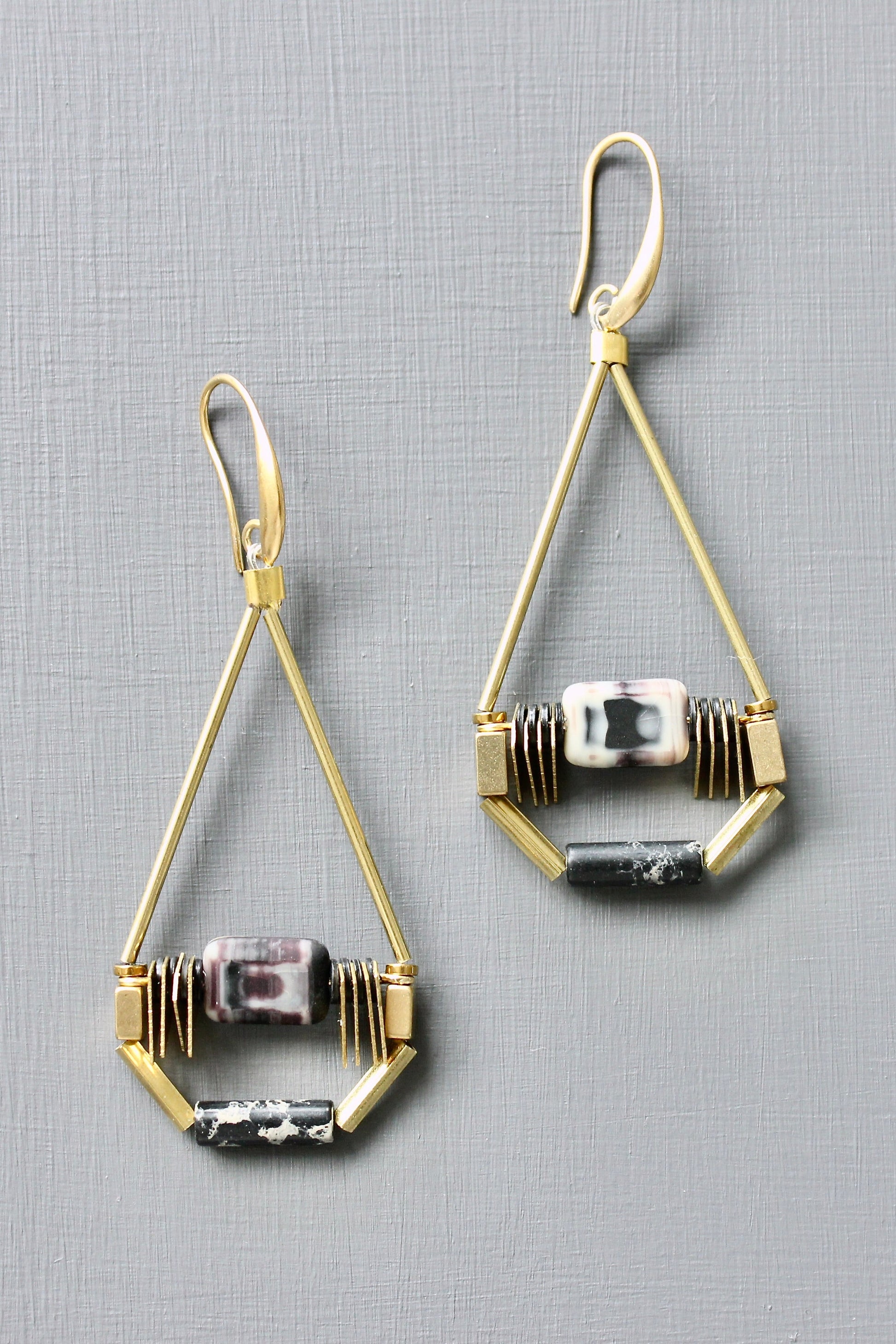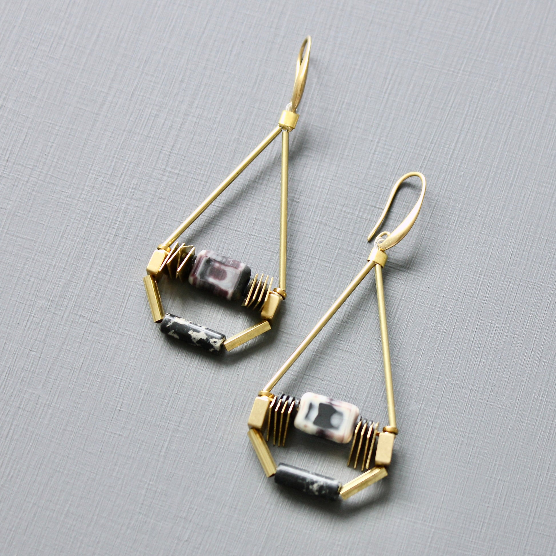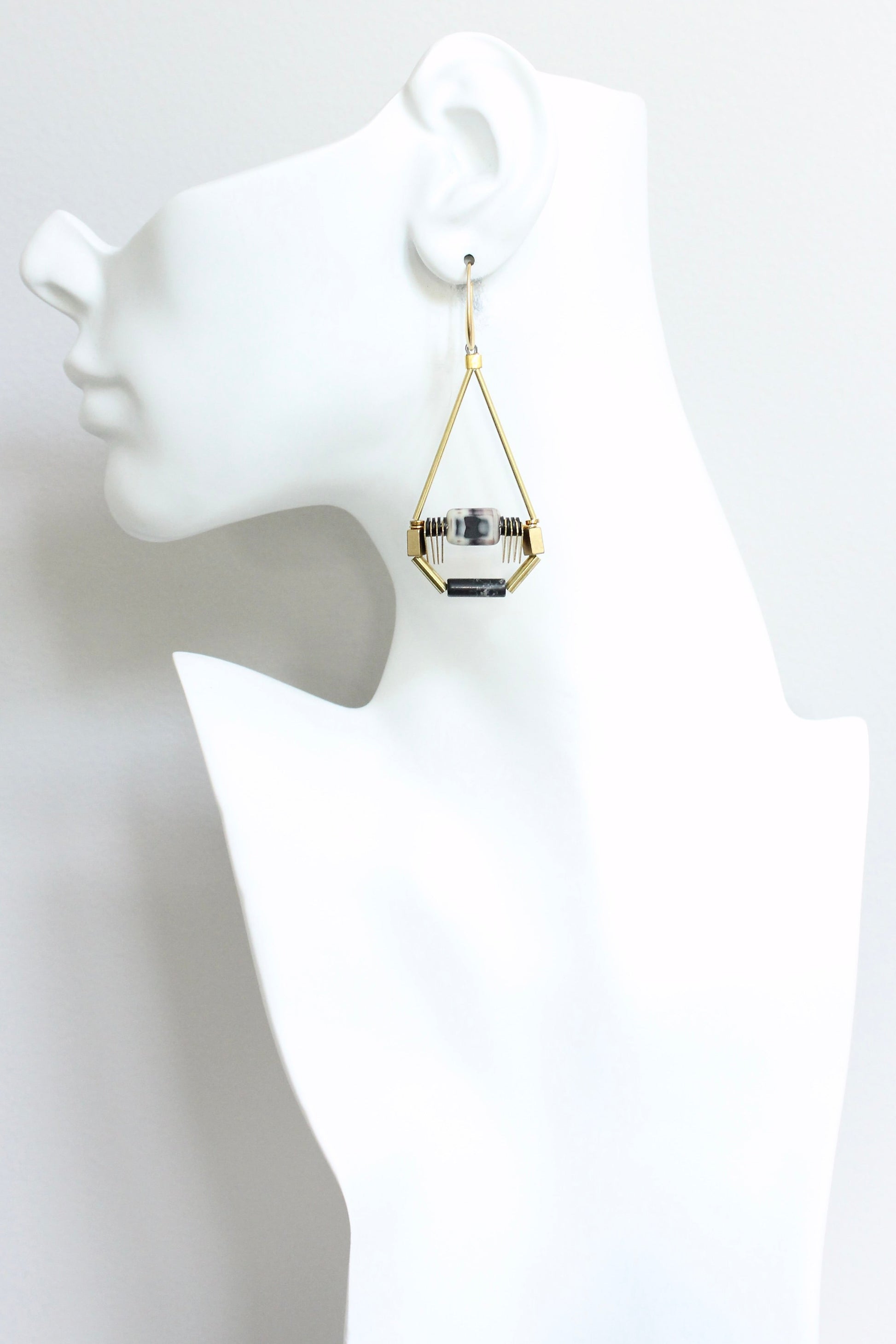 18k Gold plated brass hooks with synthetic black emperor stone and glass. Each earring weighs .17 oz. and measures 2.87 inches in length from top to bottom.