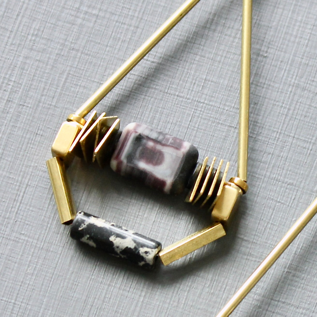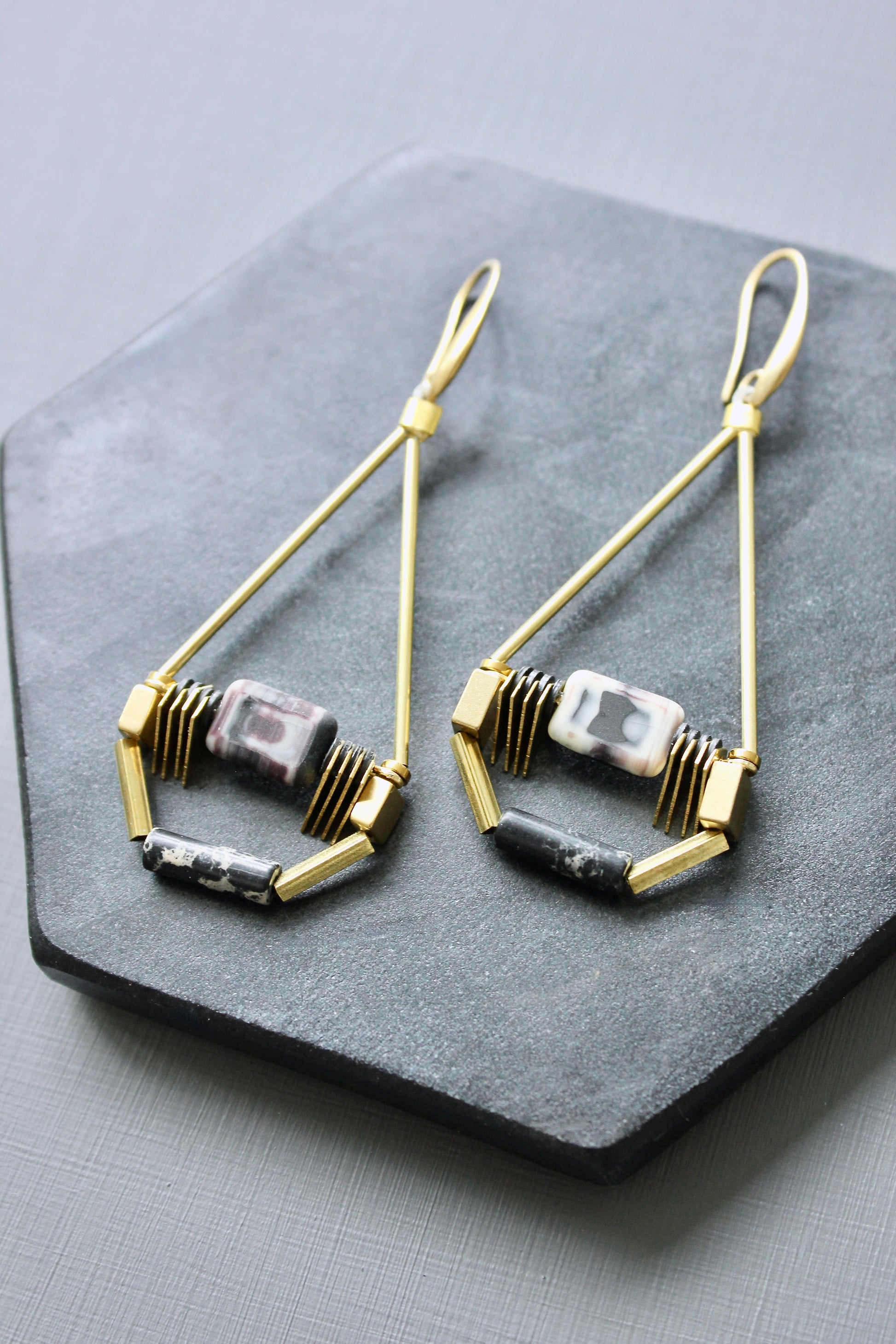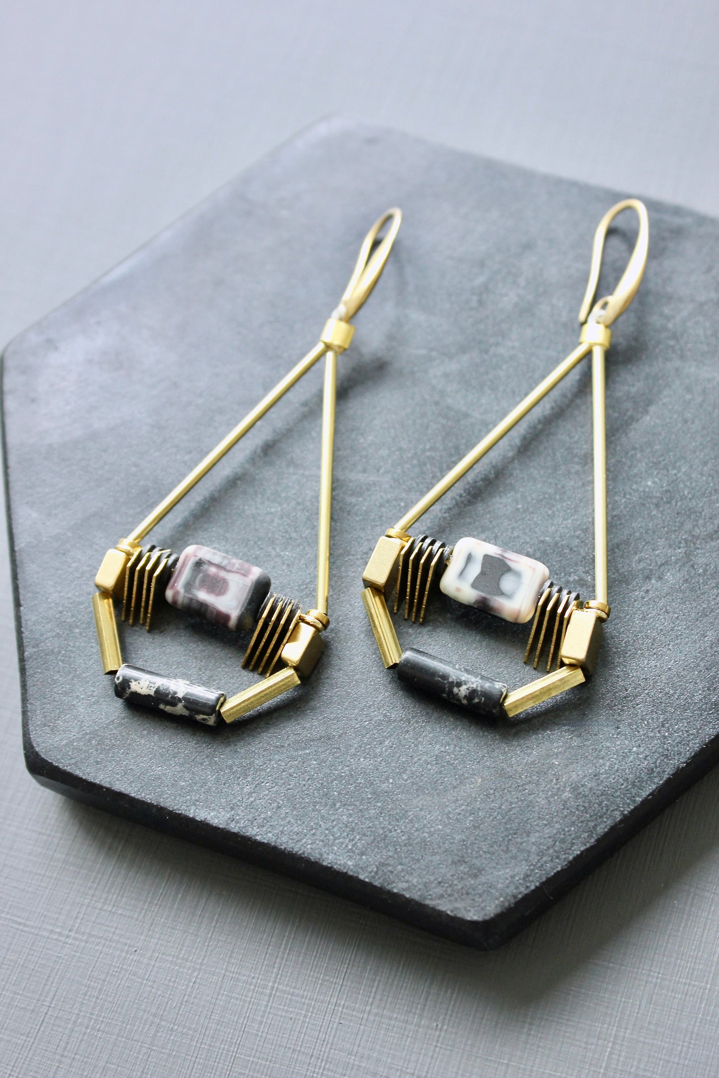 18k Gold plated brass hooks with synthetic black emperor stone and glass. Each earring weighs .17 oz. and measures 2.87 inches in length from top to bottom.