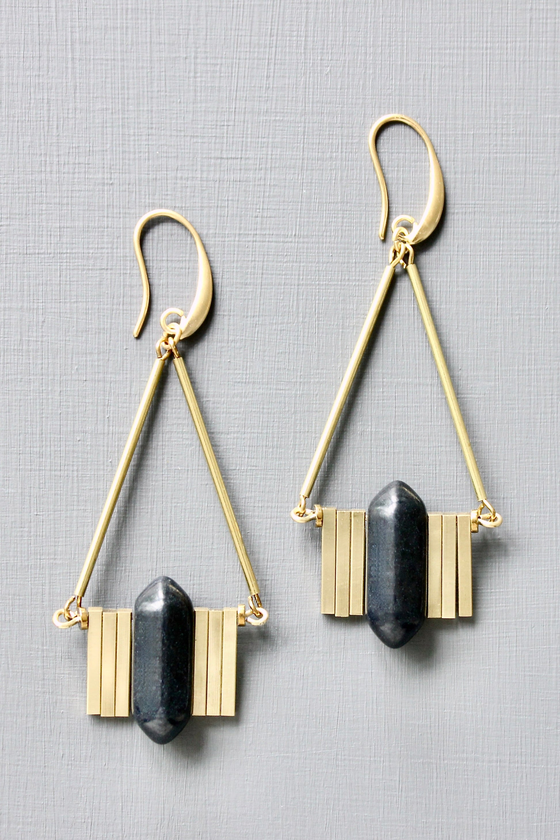 18k Gold plated brass hooks with magnesite and brass. Each earring weighs .24 oz. and measures 3 inches in length from top to bottom.