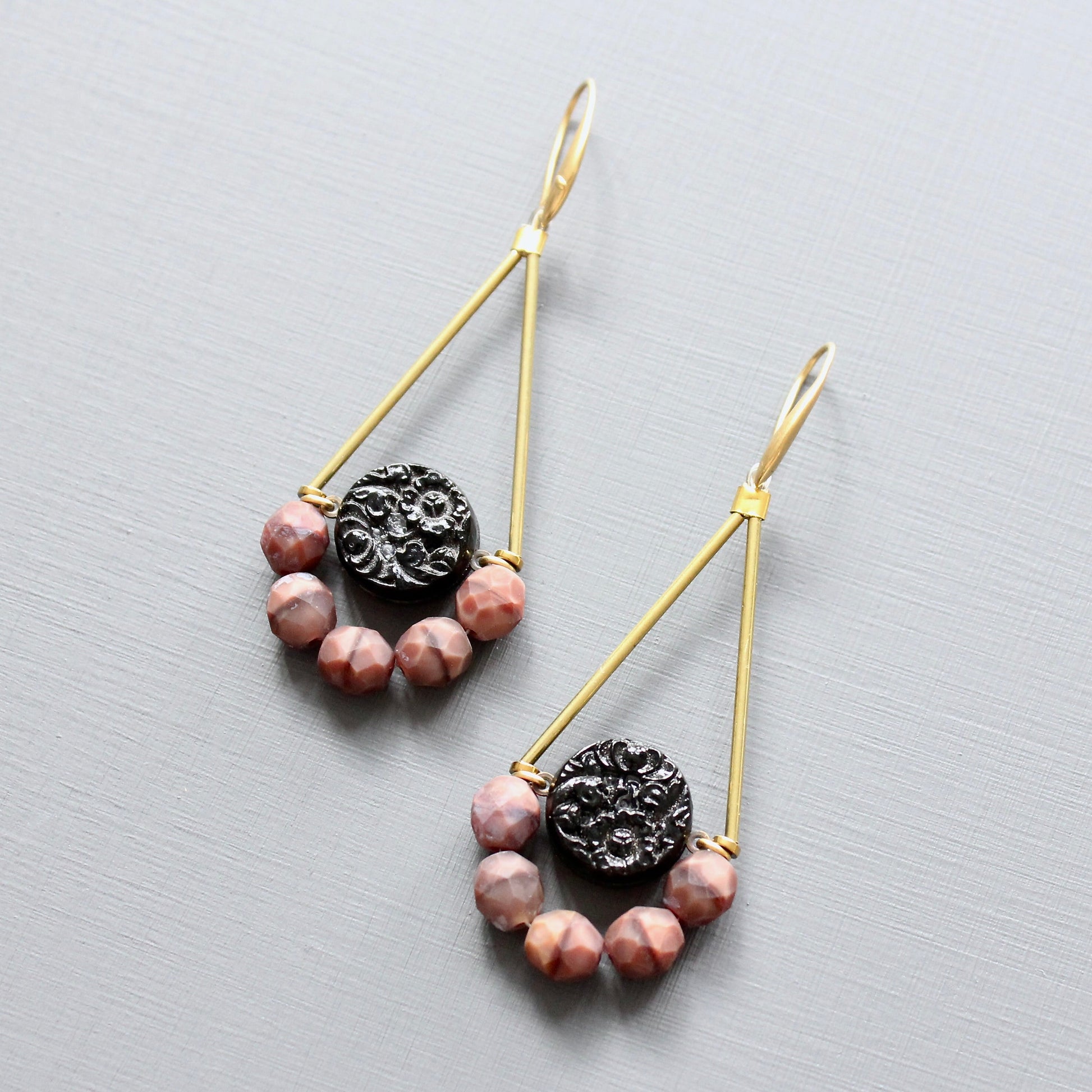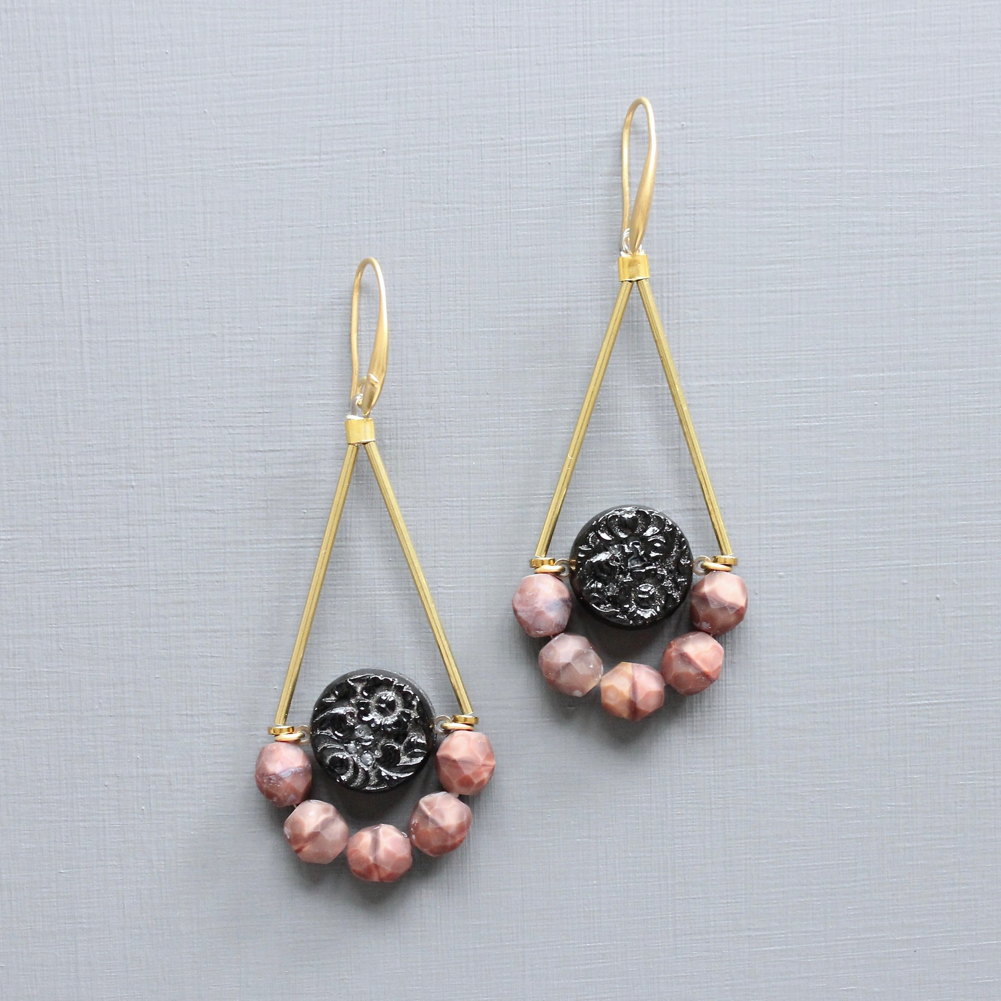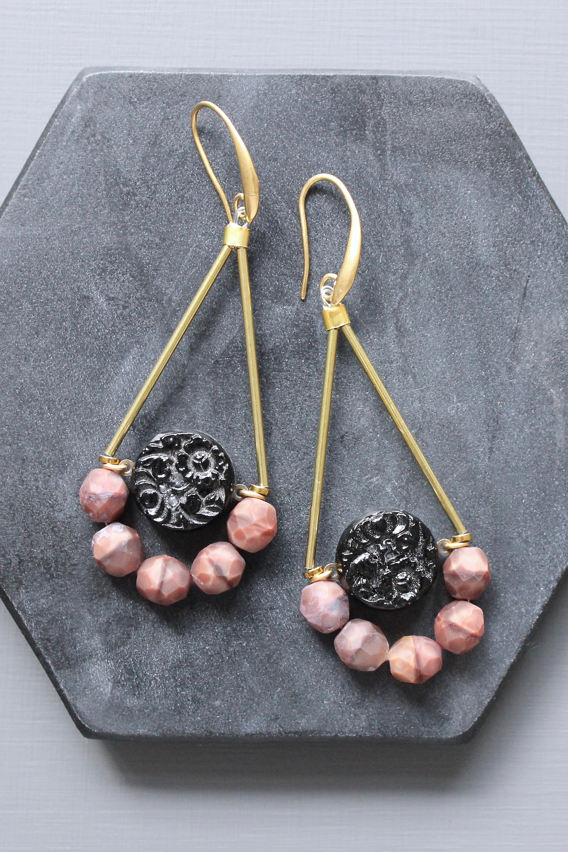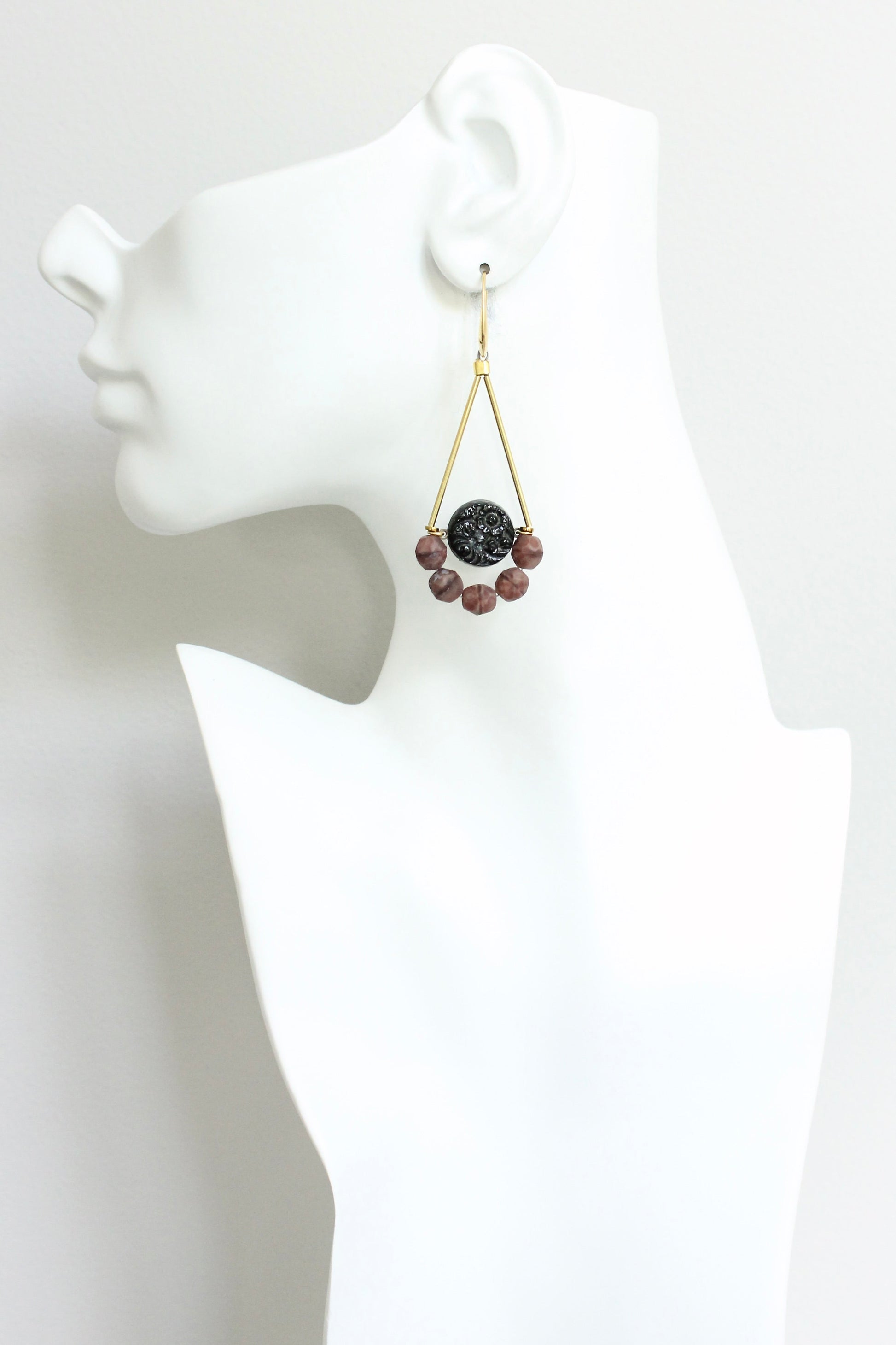 18k Gold plated brass hooks with vintage black Japanese pressed glass. Each earring weighs .235 oz. and measures 3.125 inches in length from top to bottom.