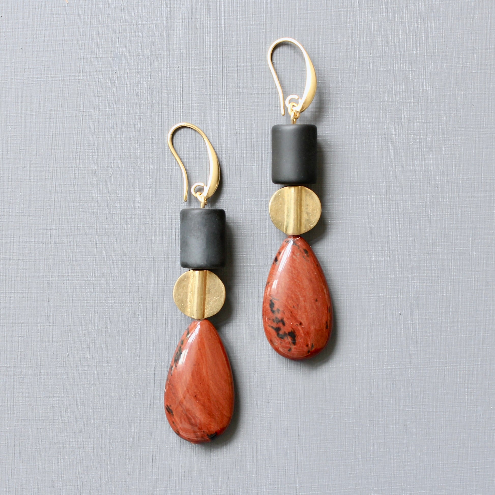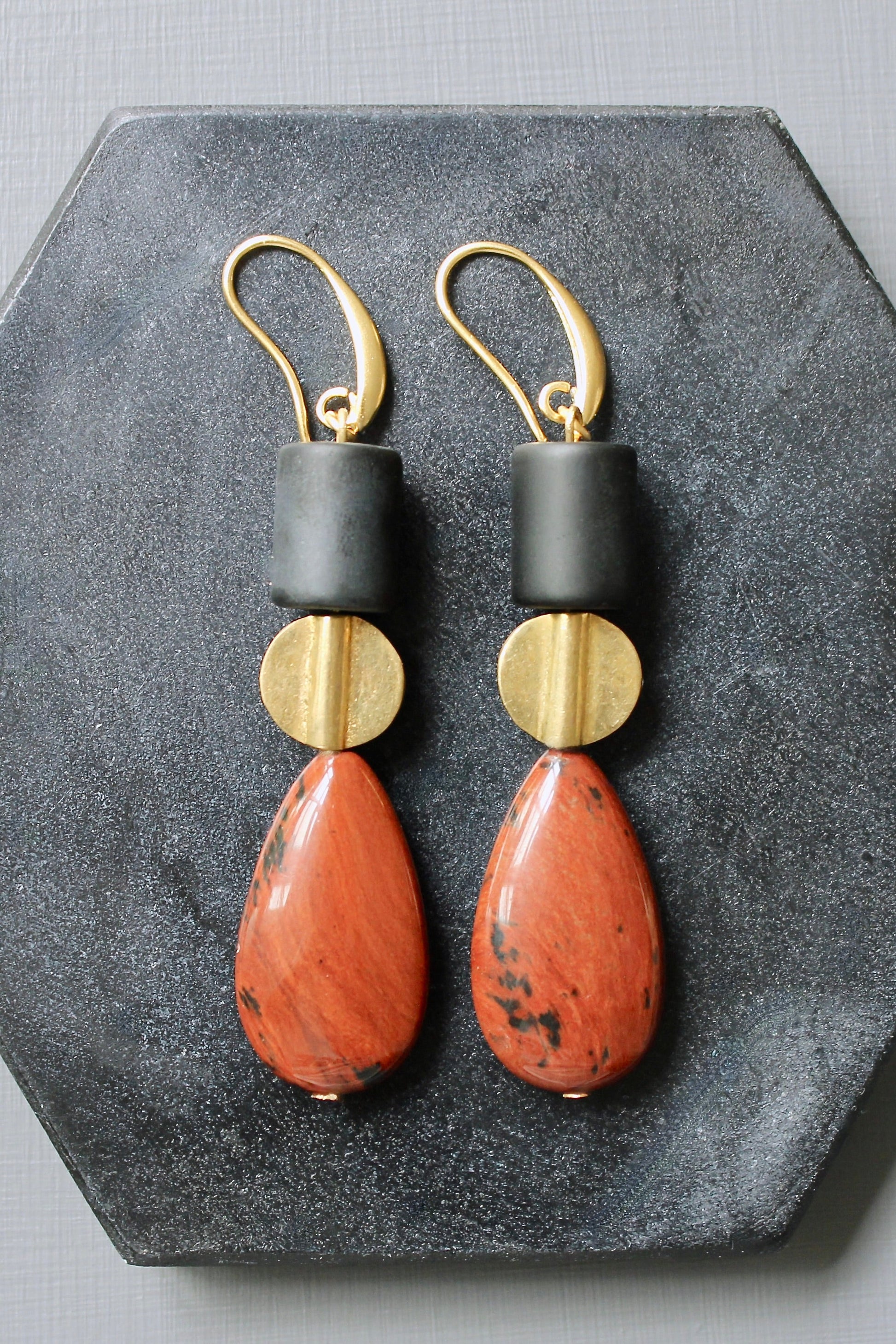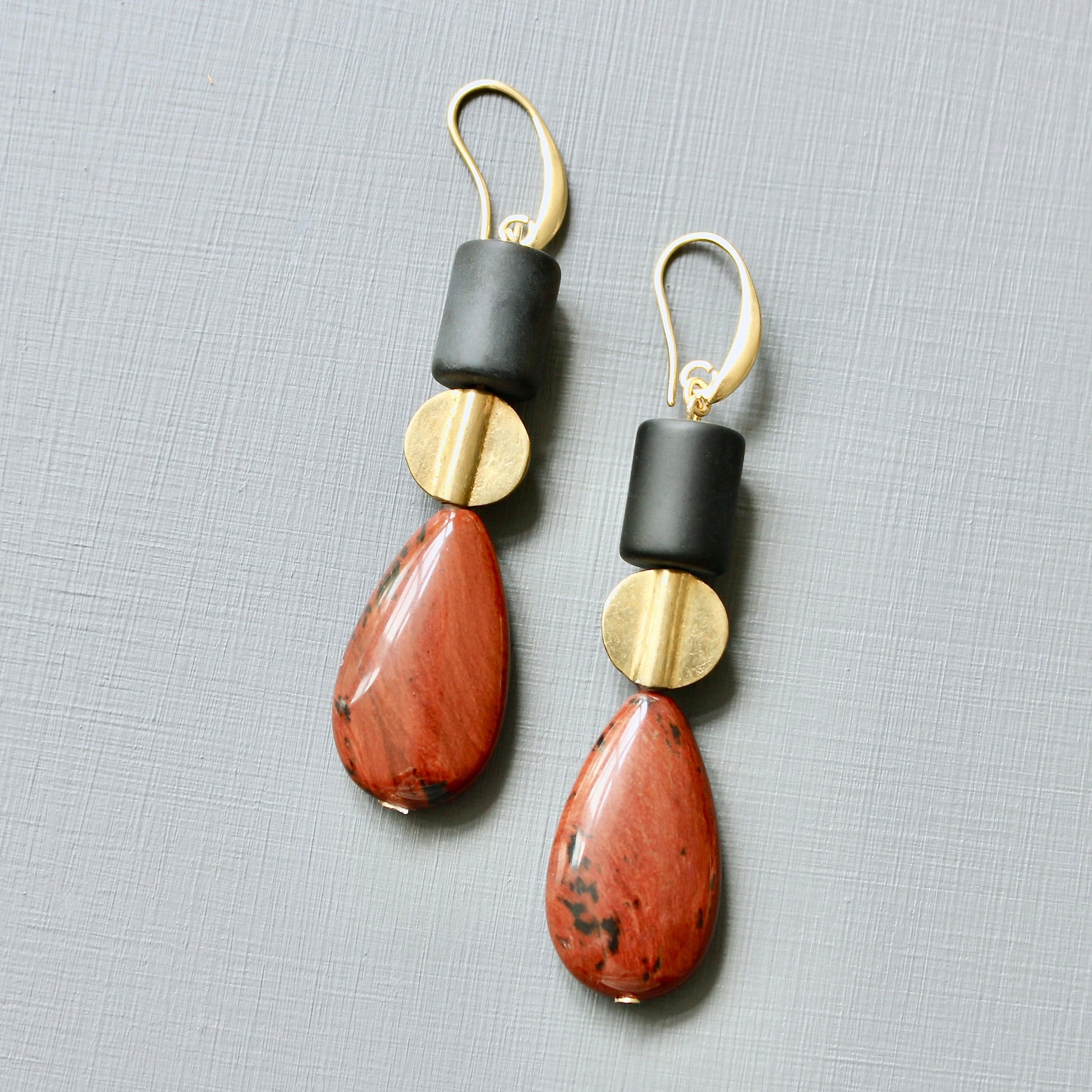 18k Gold plated brass hooks with black glass and mahogany jasper. Each earring weighs .335 oz. and measures 3 inches in length from top to bottom.