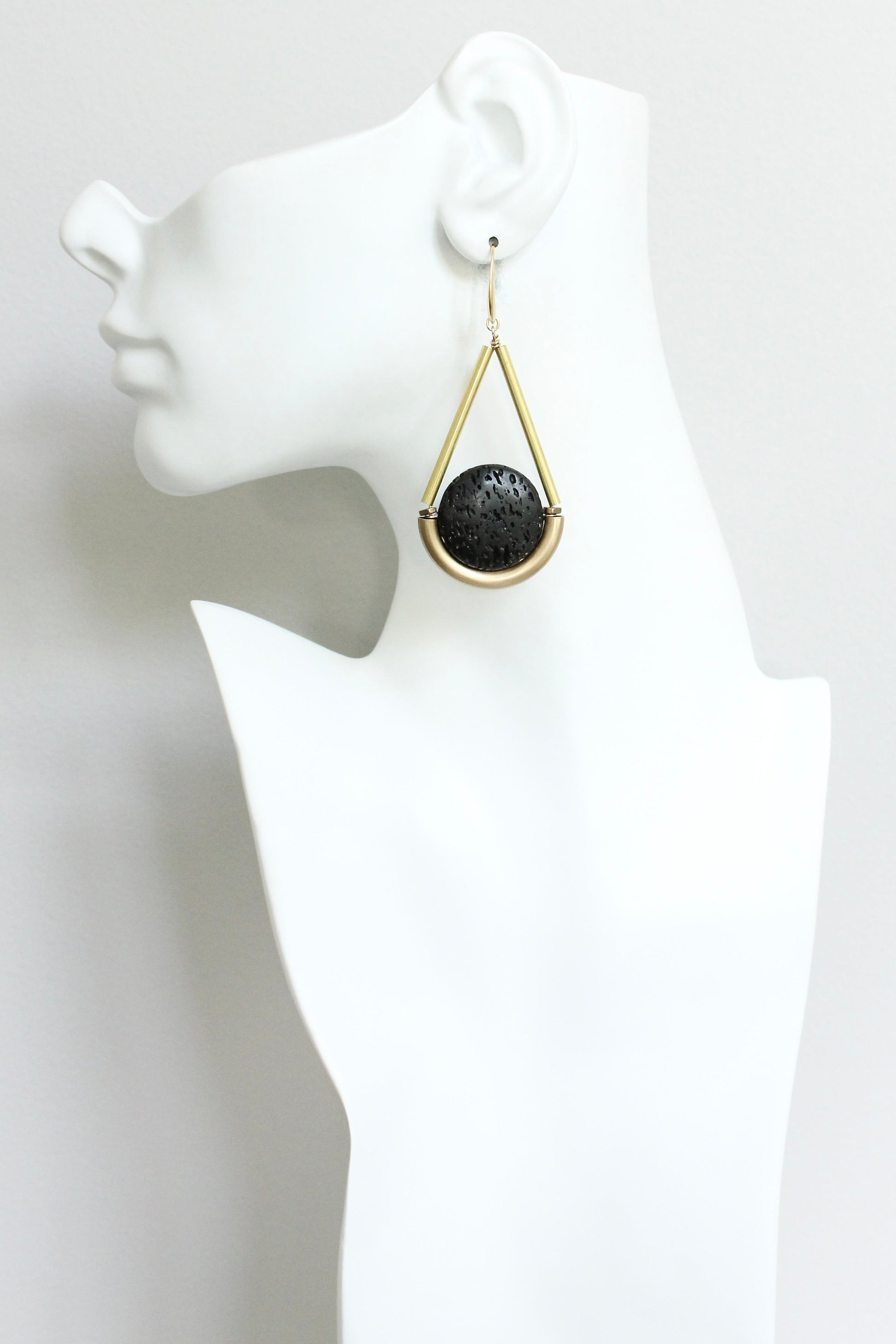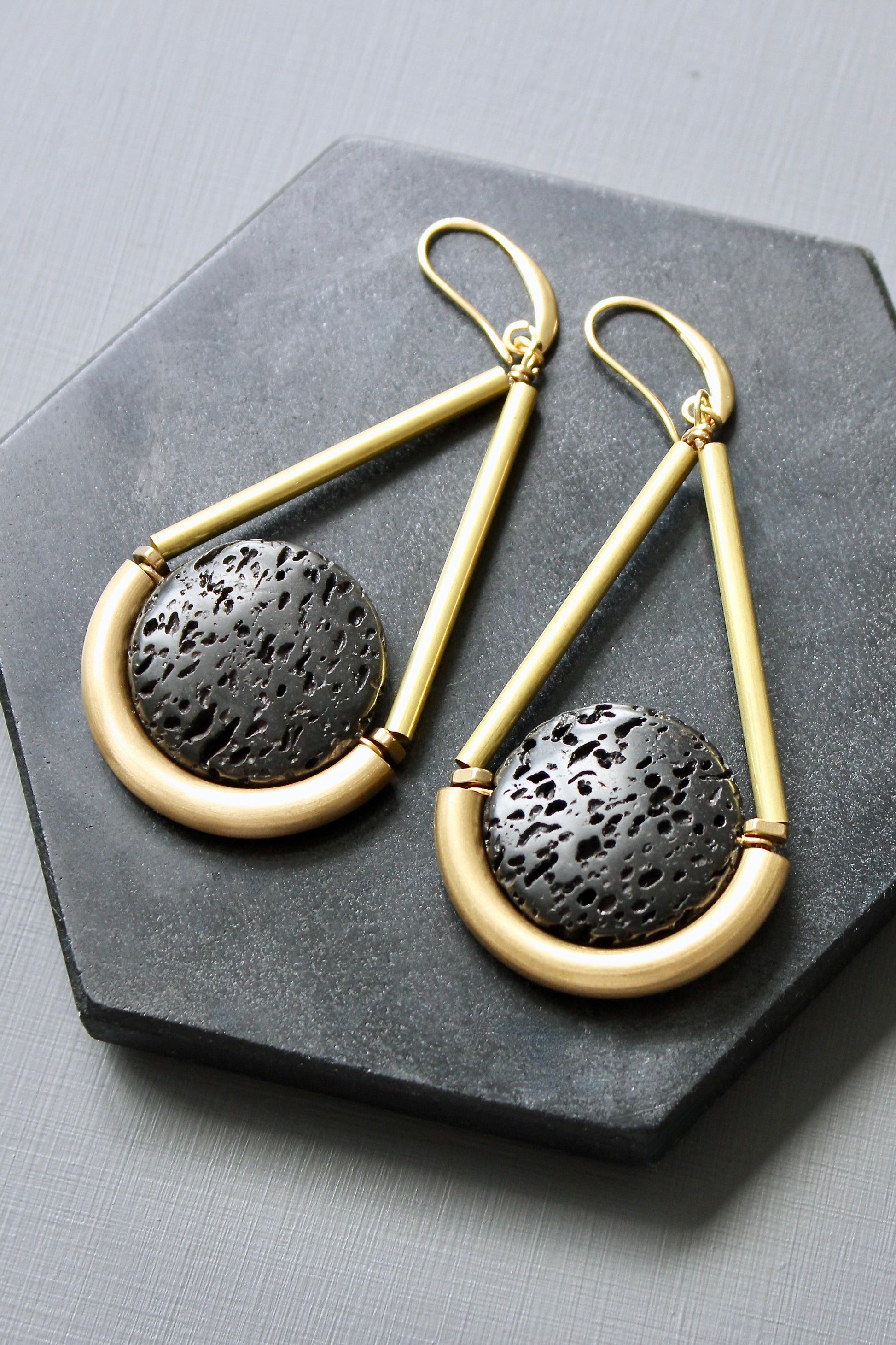 18k Gold plated brass hooks with lava rock and brass. Each earring weighs .365 oz. and measures 3.25 inches in length from top to bottom.