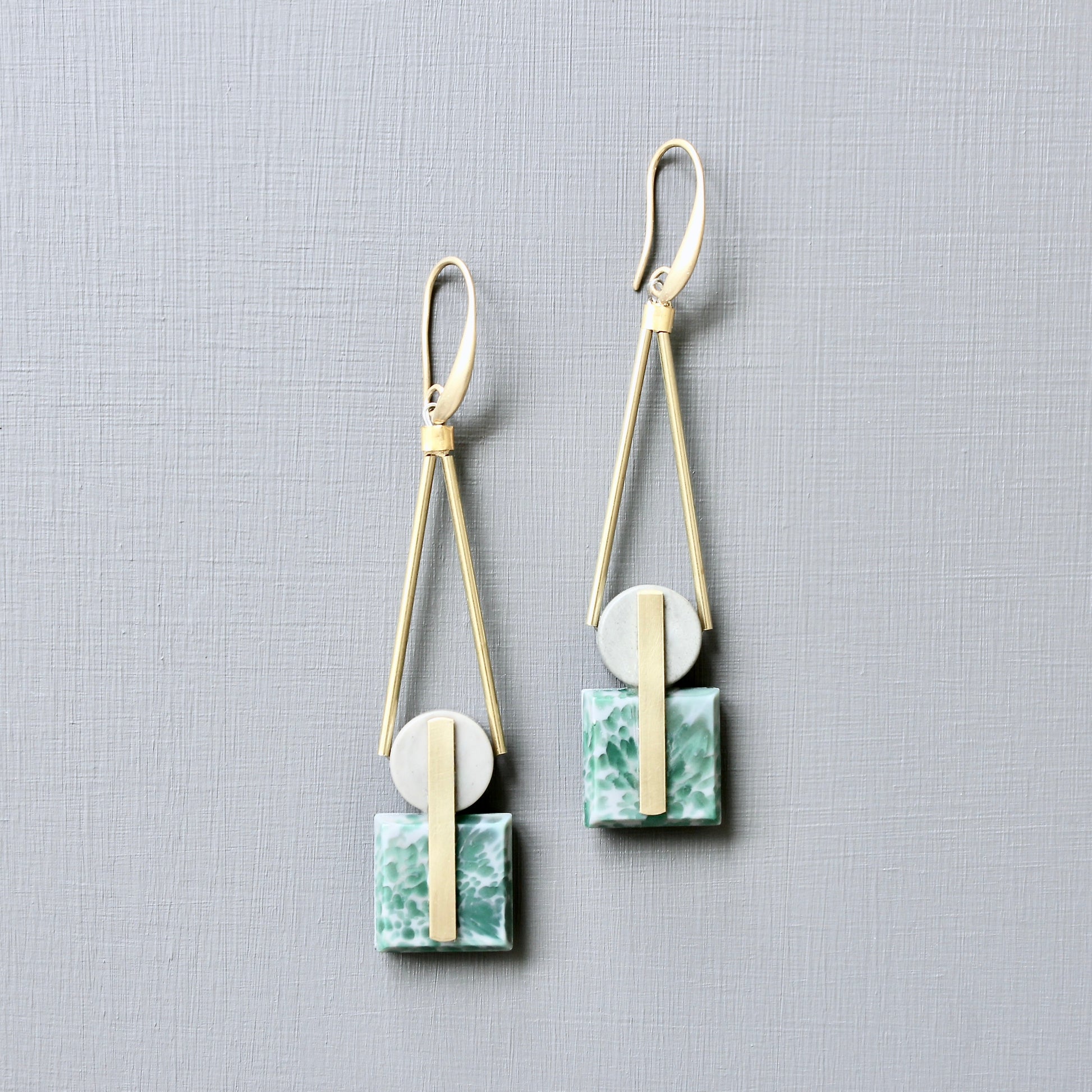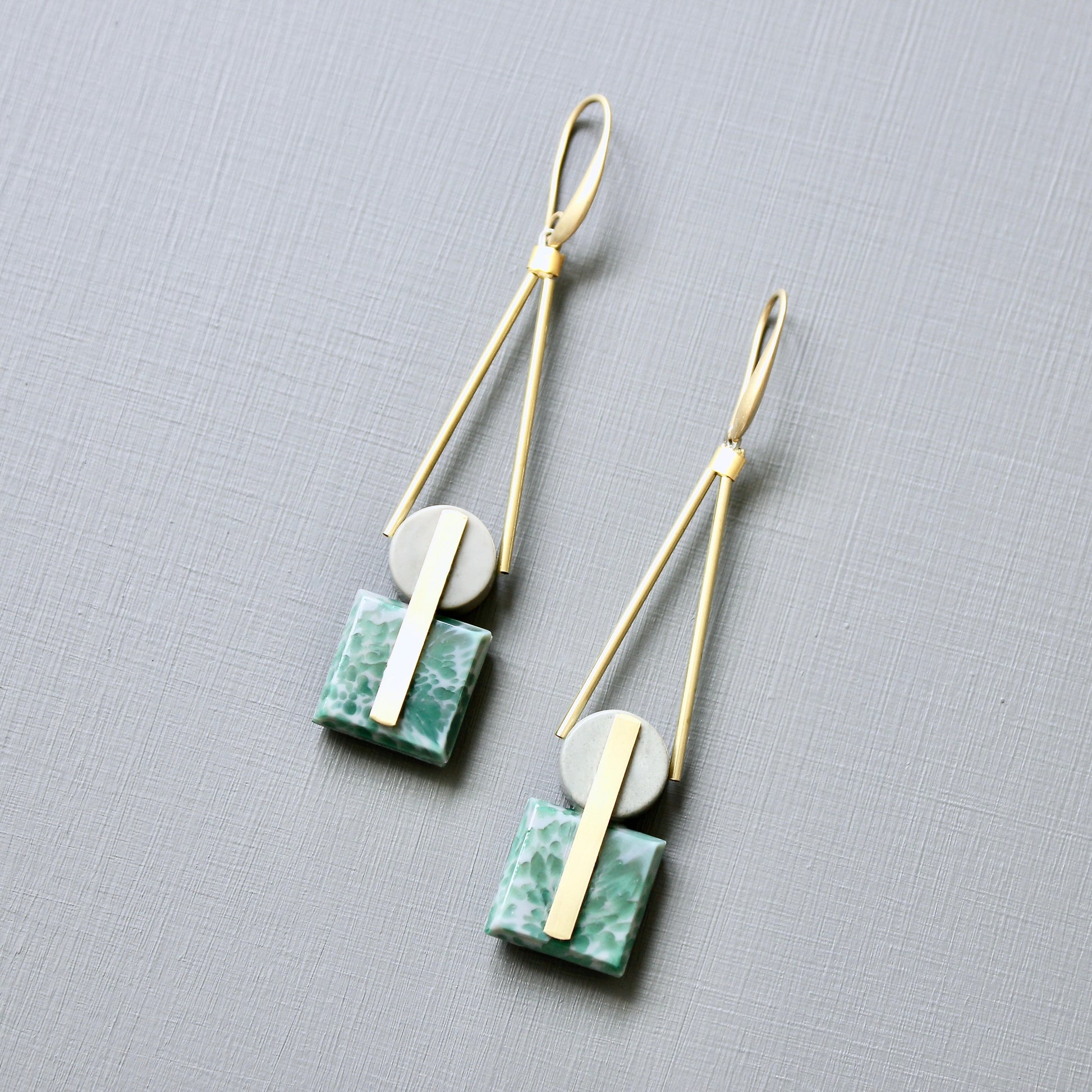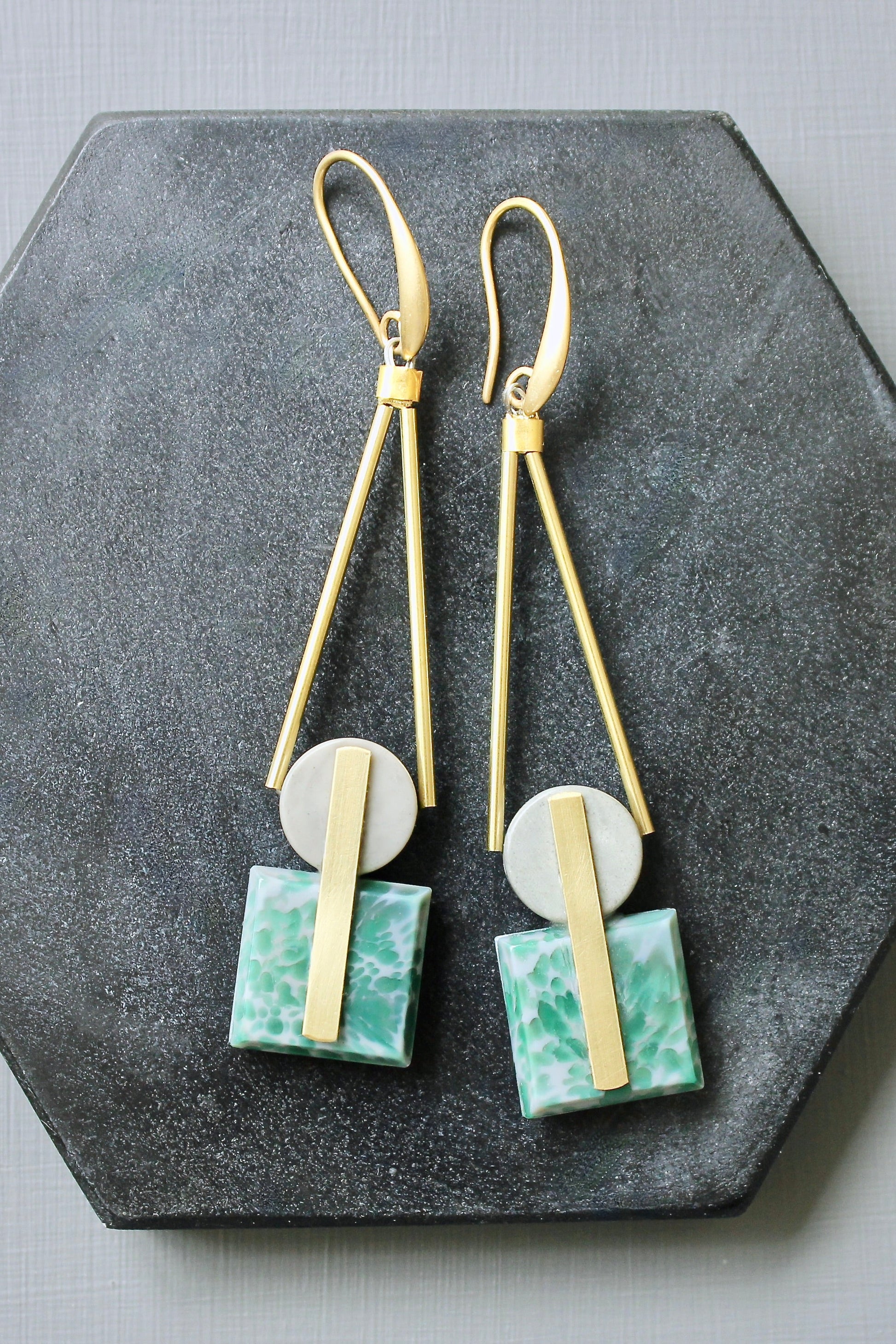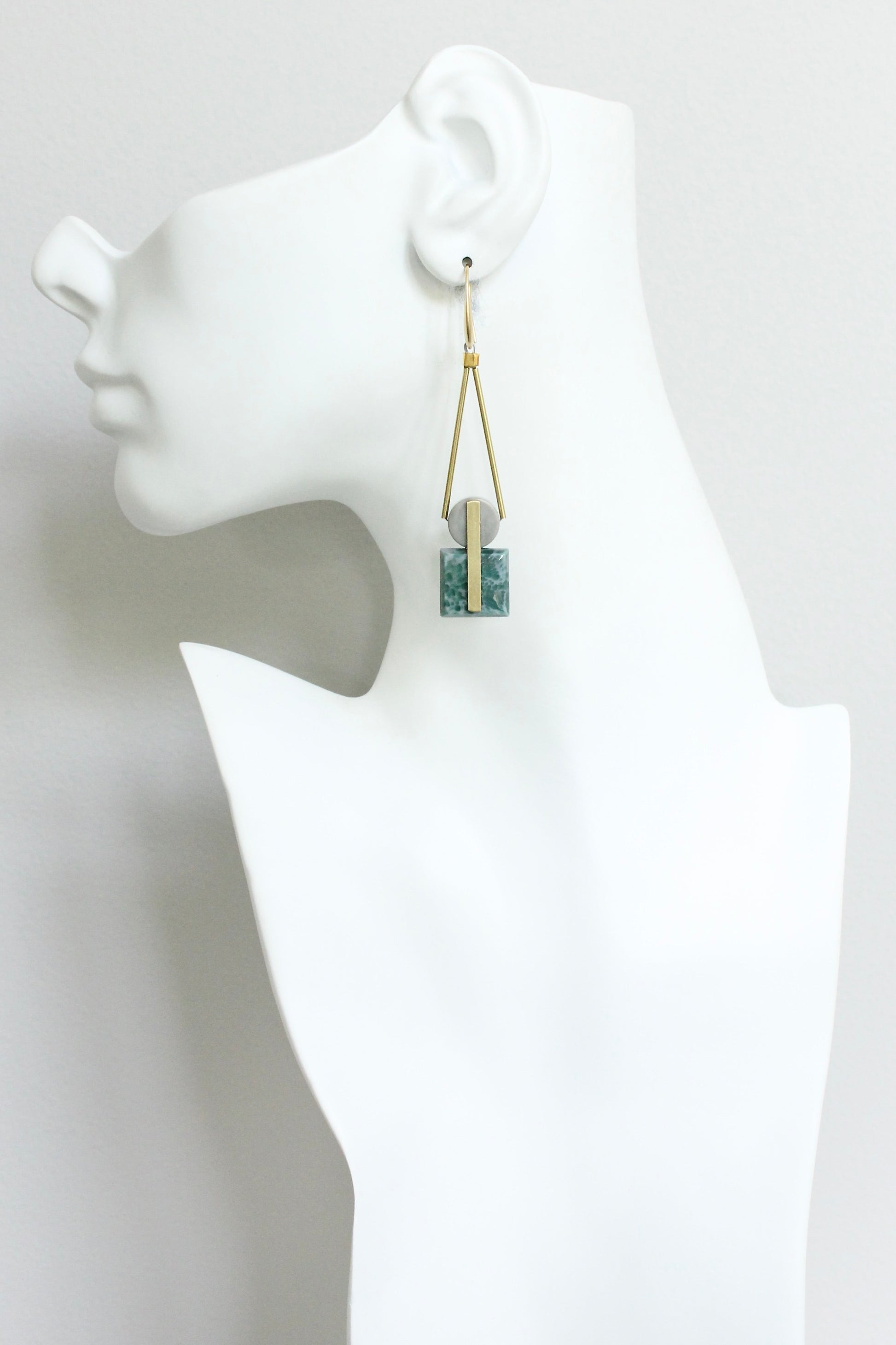 18k Gold plated brass hooks with jasper and vintage glass. Each earring weighs .28 oz. and measures 3.125 inches in length from top to bottom.