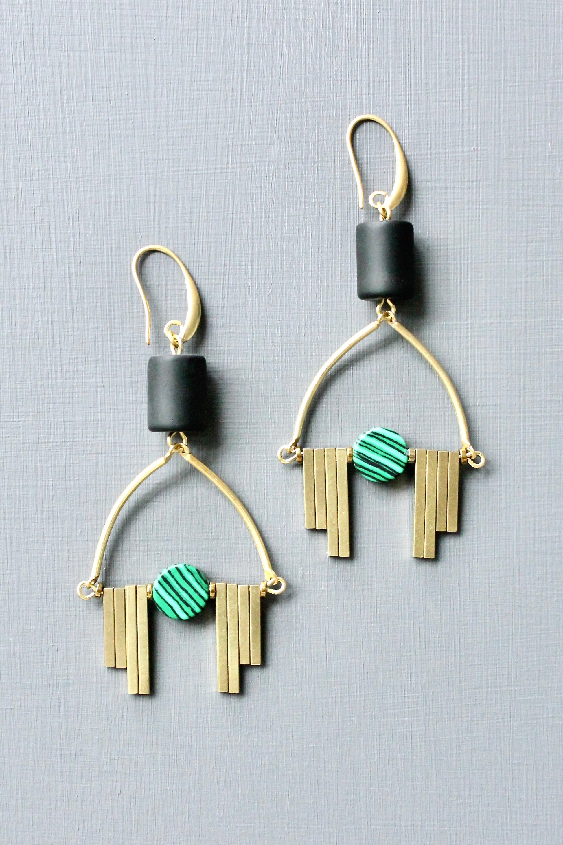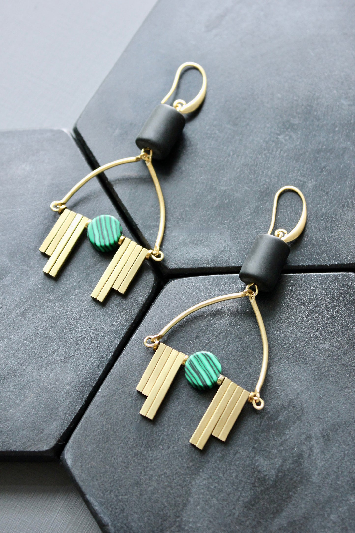 18k Gold plated brass hooks with black glass, synthetic malachite, and brass. Each earring weighs .345 oz. and measures 3.375 inches in length from top to bottom.