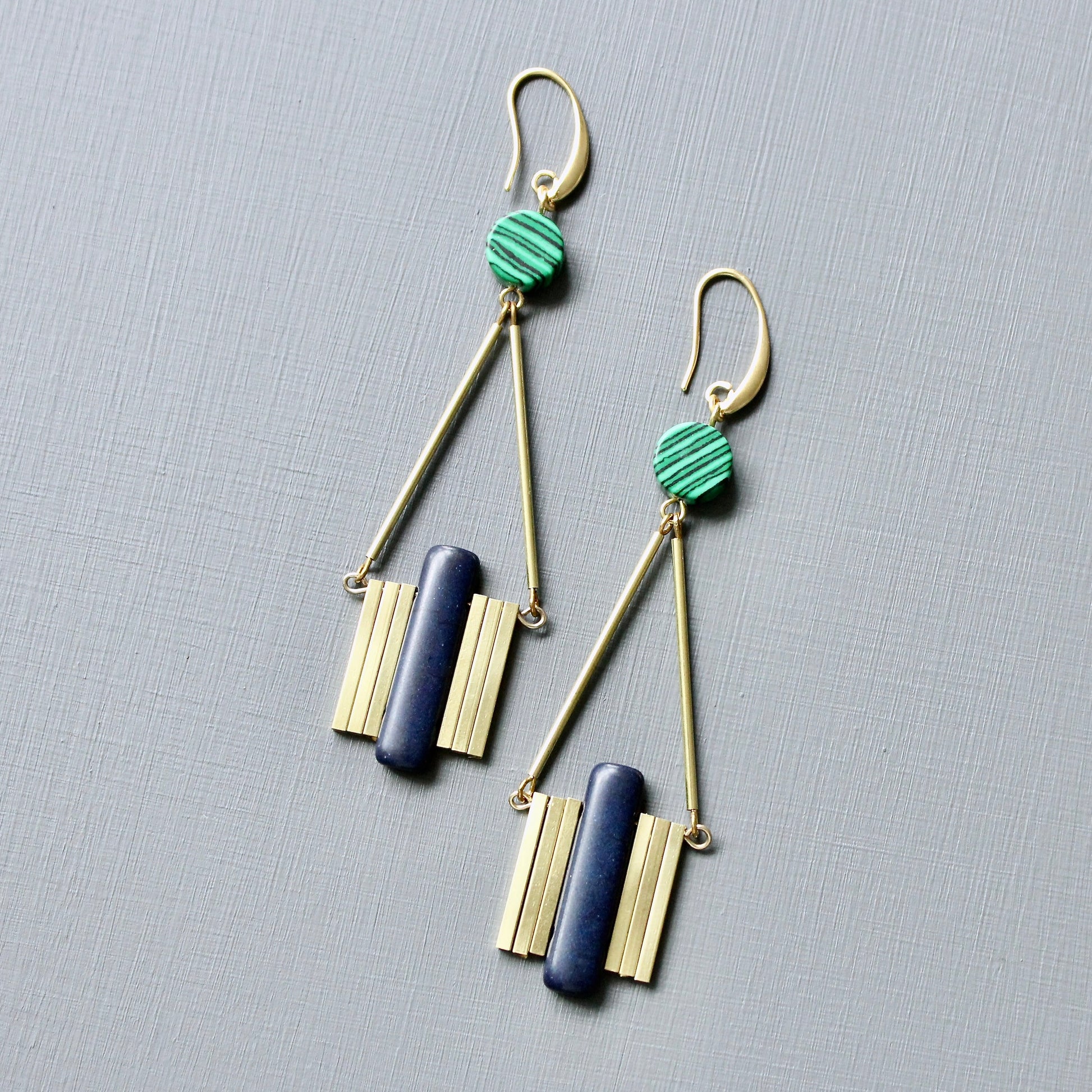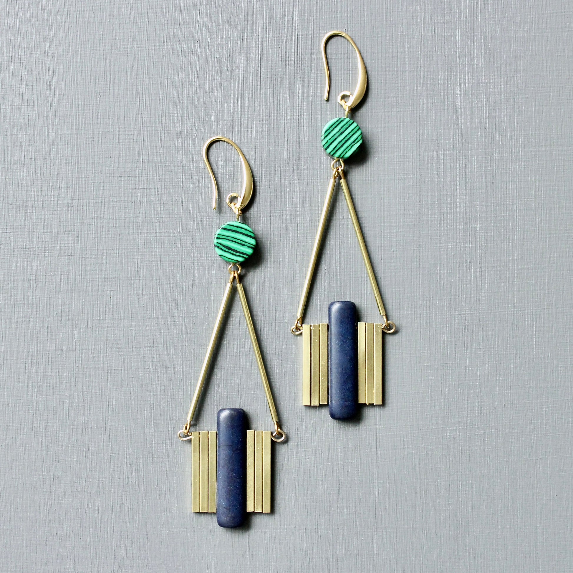 18k Gold plated brass hooks with navy magnesite, synthetic malachite, and brass. Each earring weighs .27 oz. and measures 3.875 inches in length from top to bottom.