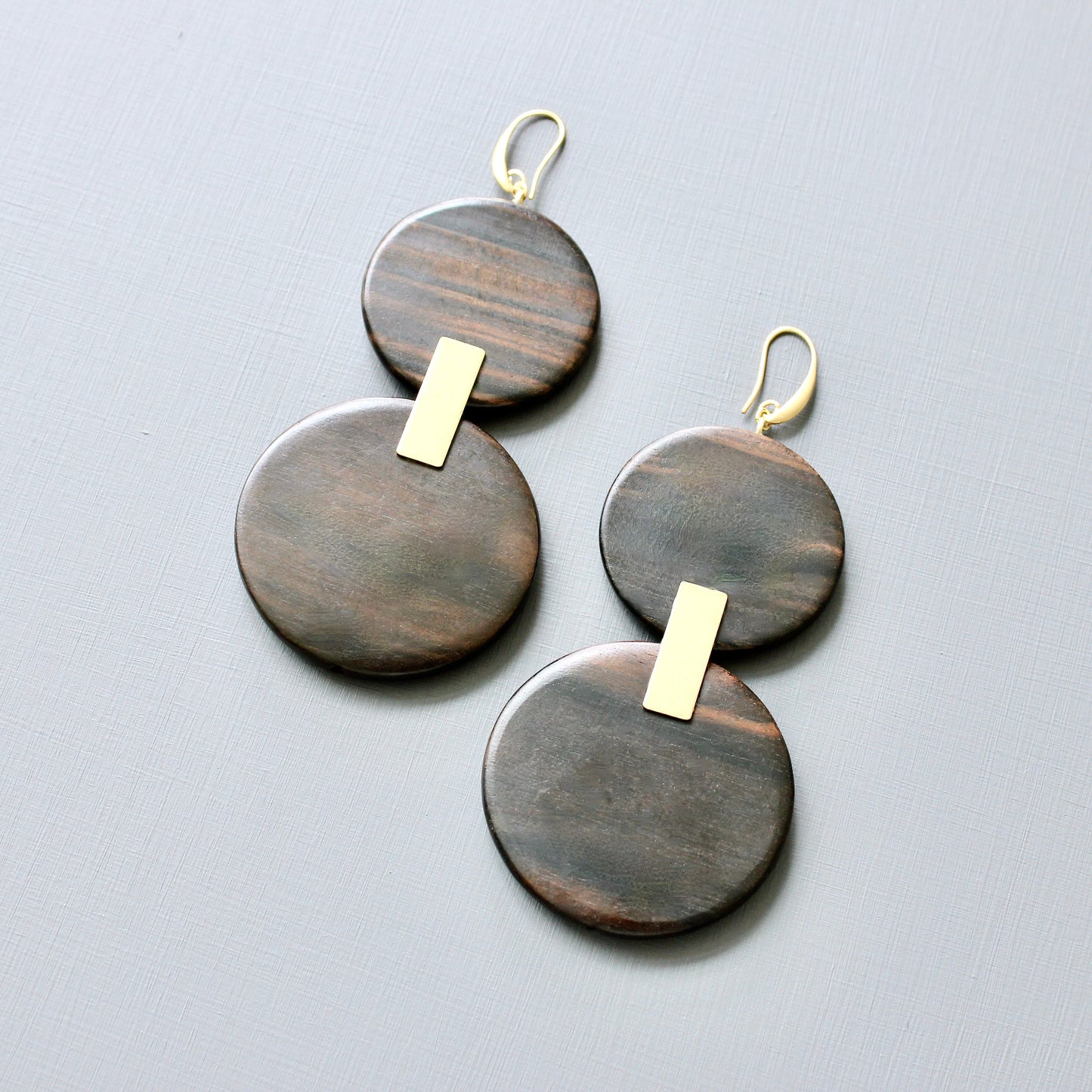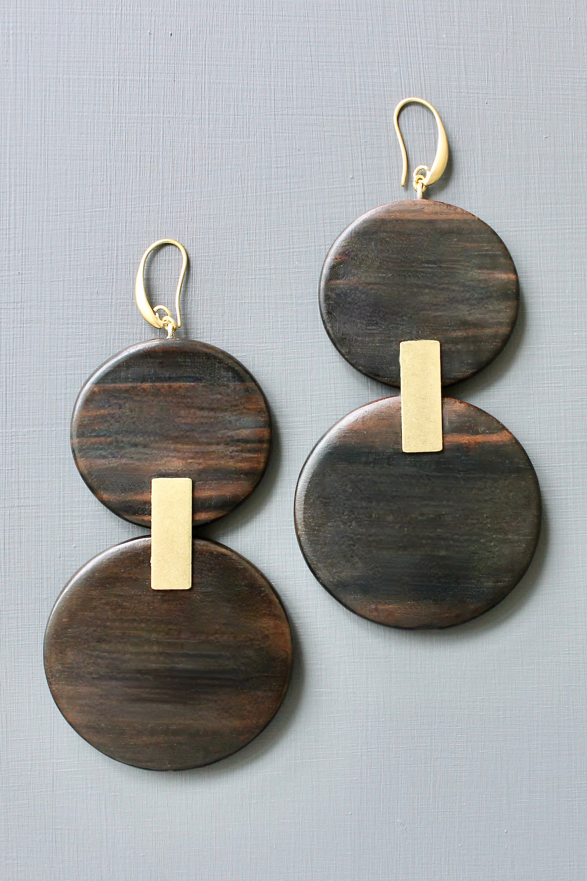 18k Gold plated brass hooks with ebony wood. Each earring weighs .69 oz. and measures 4.25 inches in length from top to bottom.