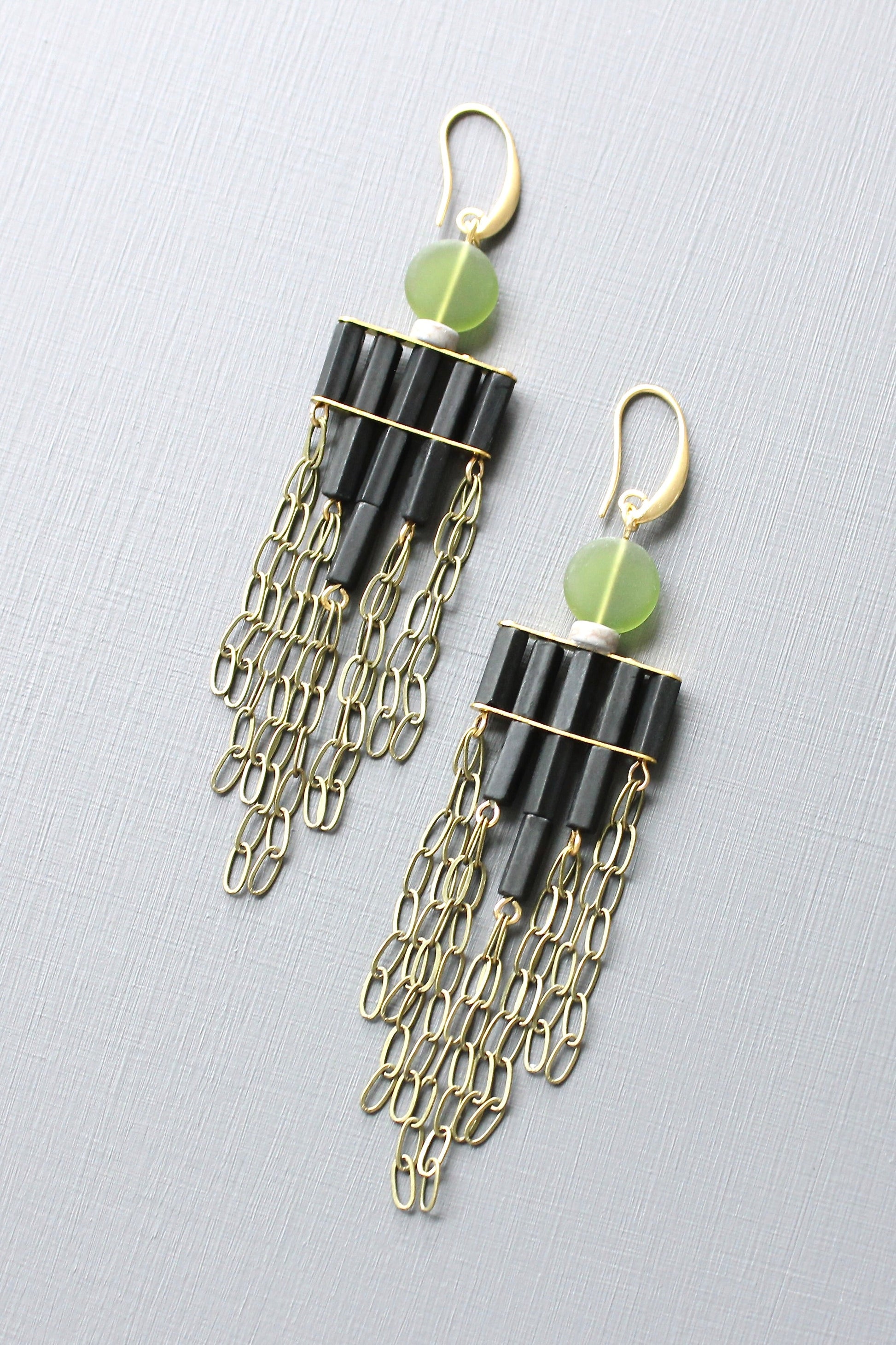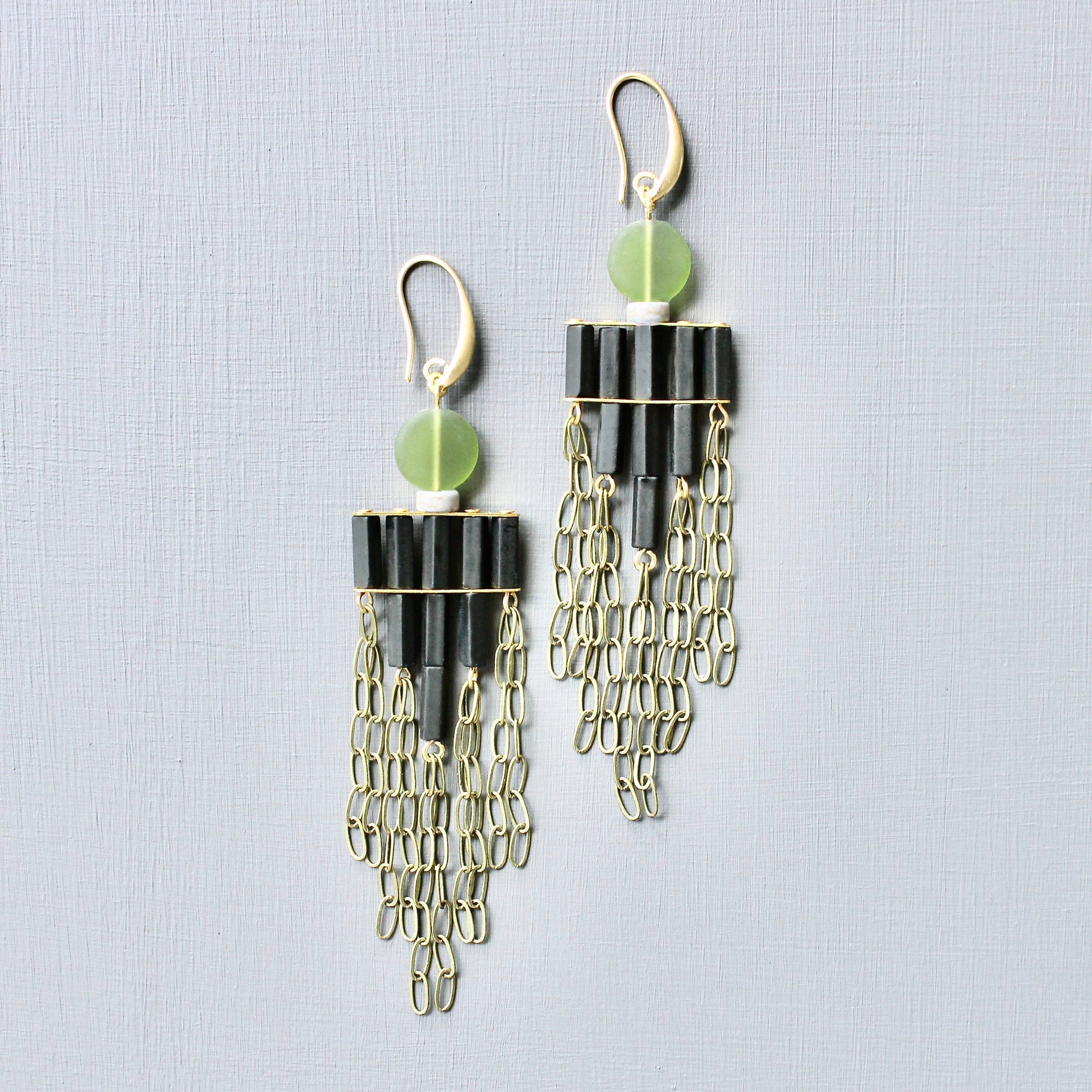 18k Gold plated brass hooks with glass, magnesite, and brass-ox chain. Each earring weighs .24 oz. and measures 4.375 inches in length from top to bottom.