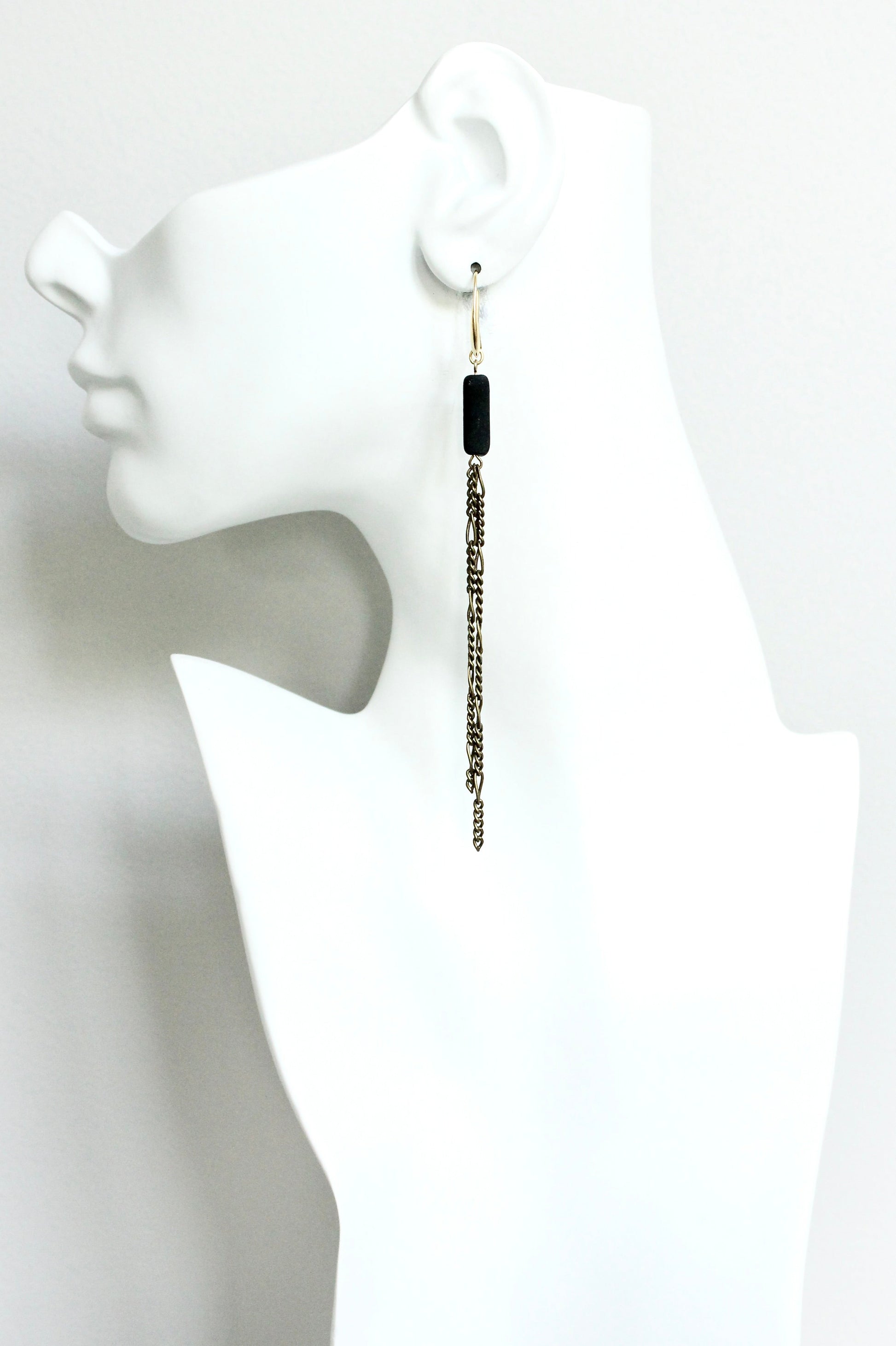 18k Gold plated brass hooks with black glass and brass. Each earring weighs .125 oz. and measures 5 inches in length from top to bottom.