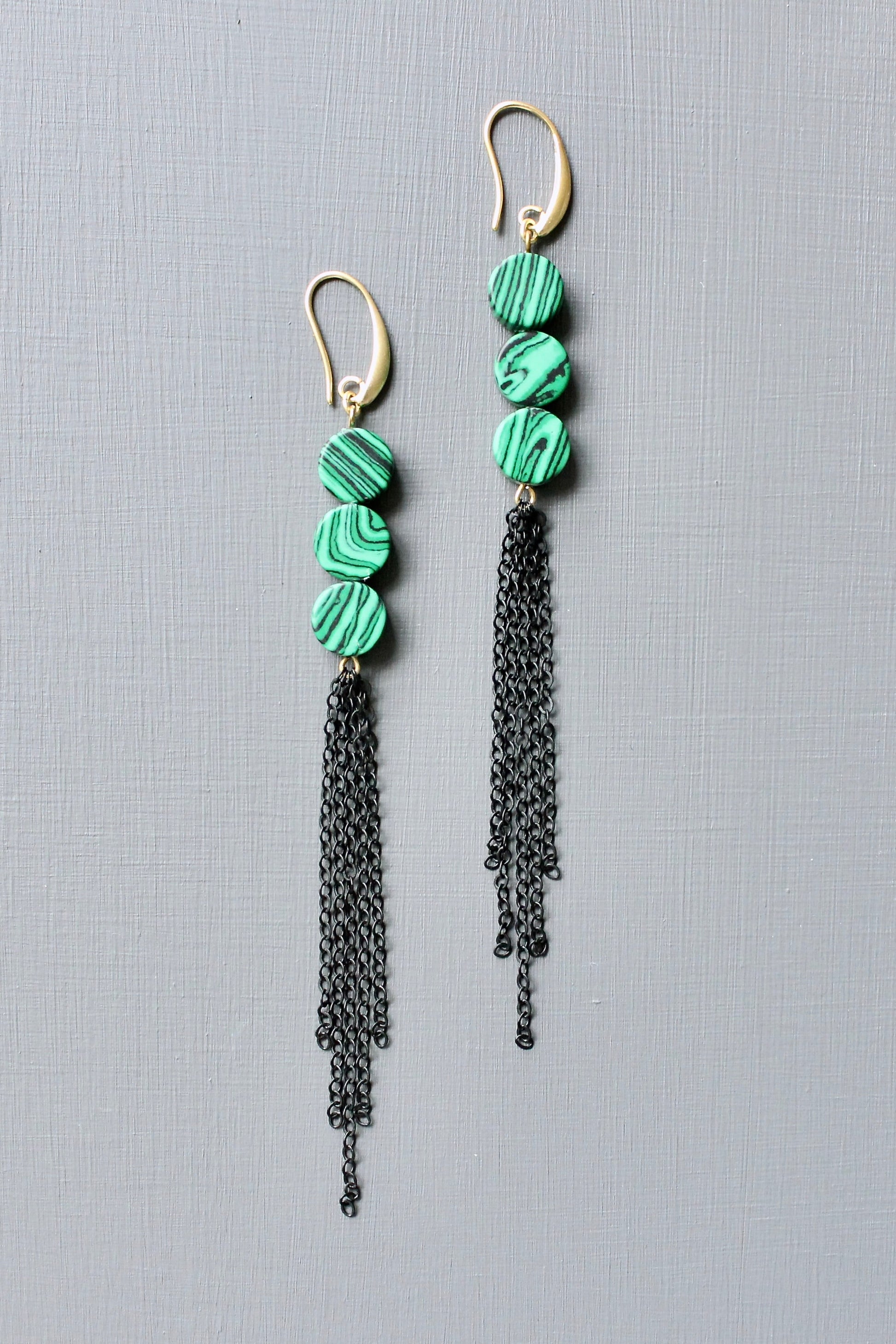 18k Gold plated brass hooks with synthetic malachite and black plated chain. Each earring weighs .135 oz. and measures 5.25 inches in length from top to bottom.