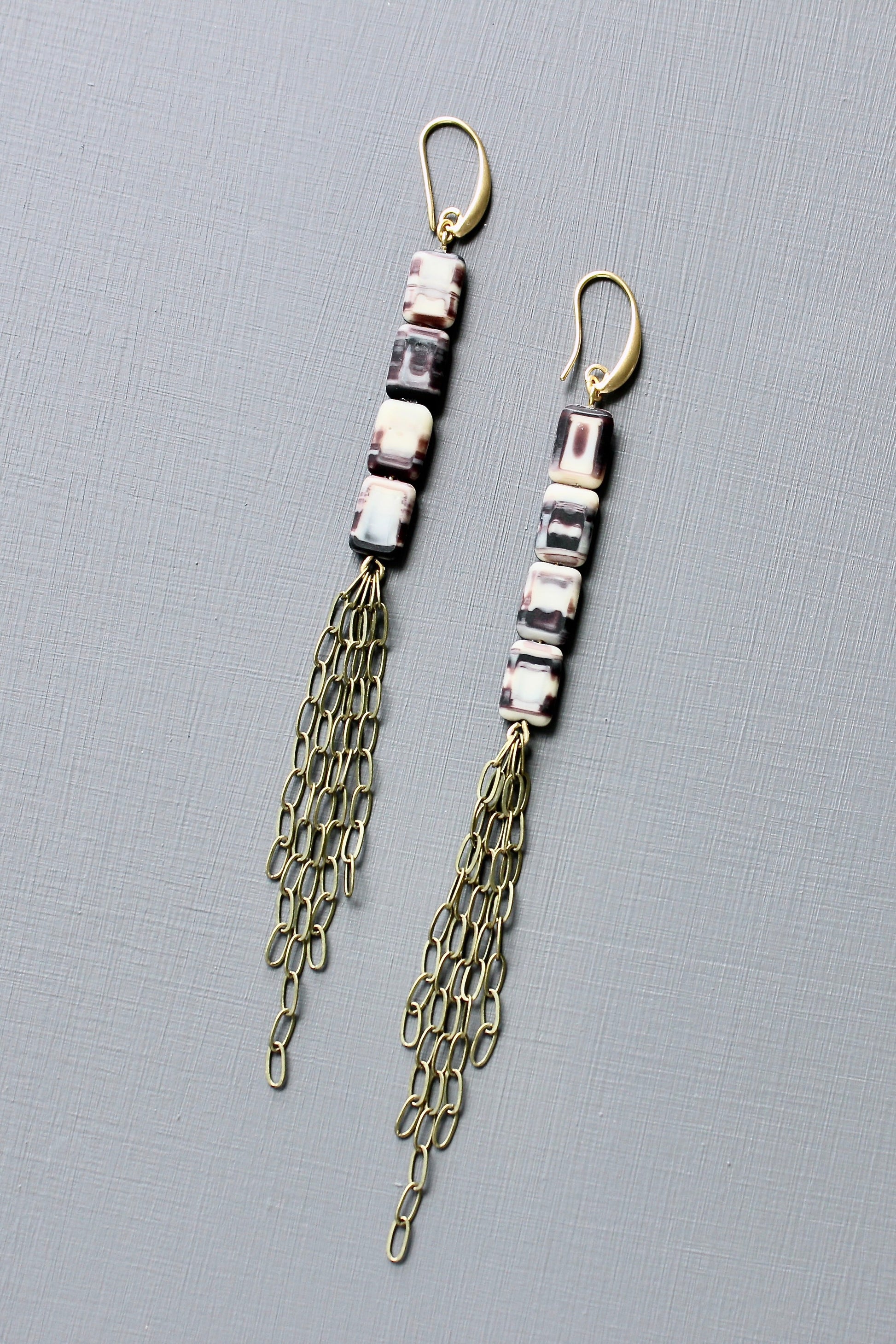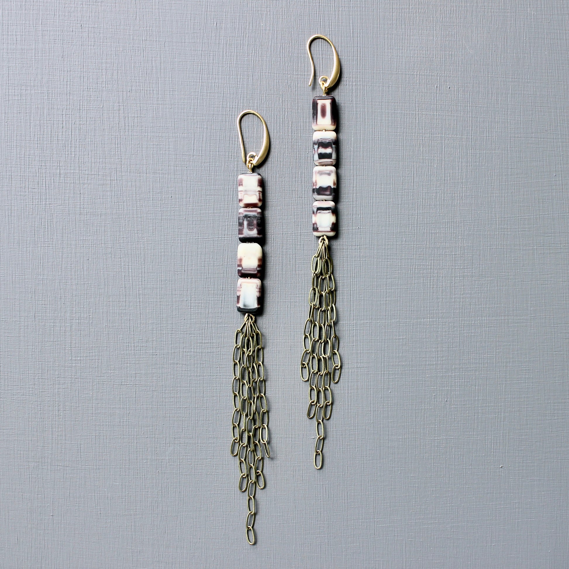 18k Gold plated brass hooks with glass and brass-ox chain. Each earring weighs .17 oz. and measures 5.875 inches in length from top to bottom.