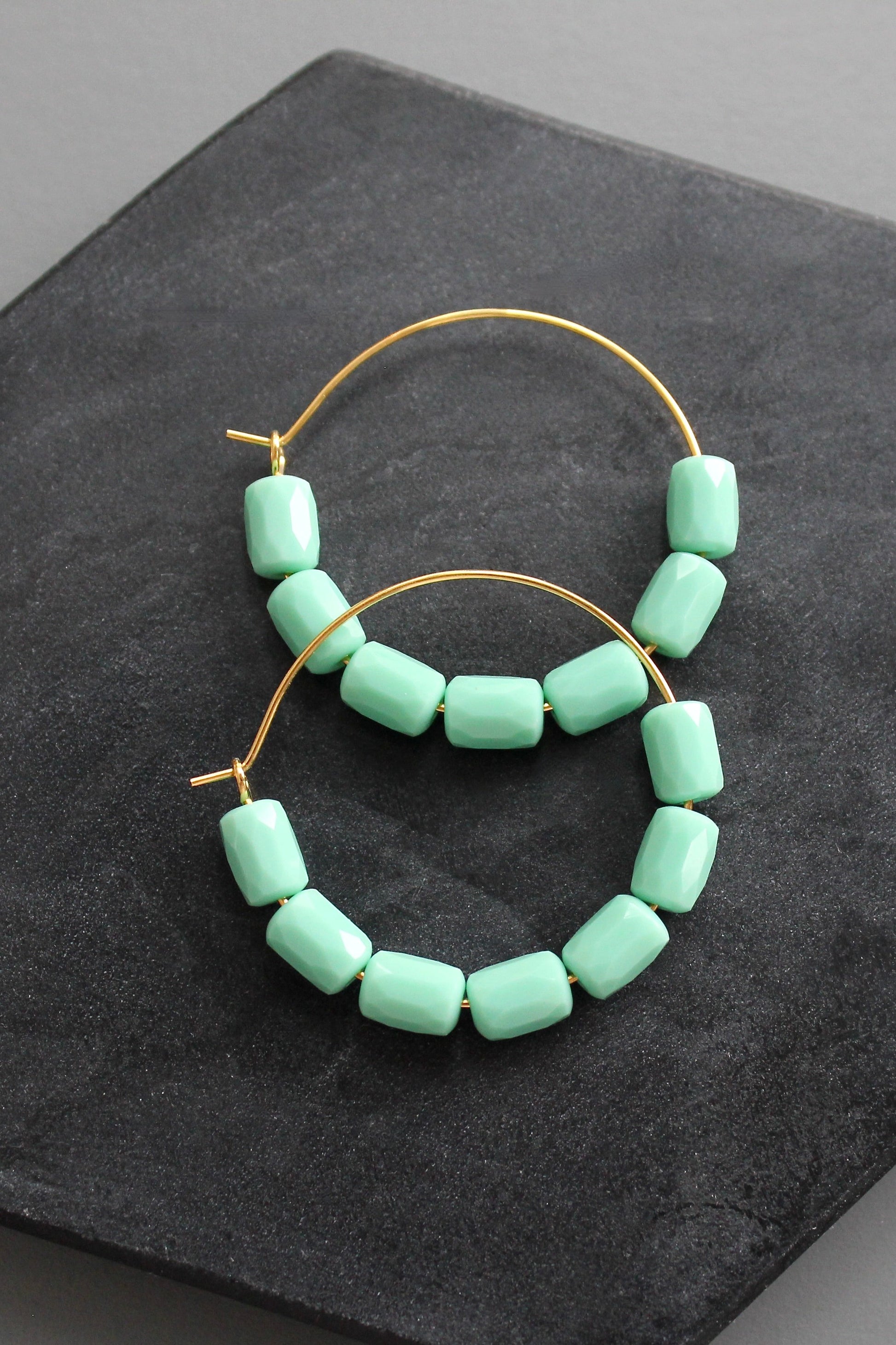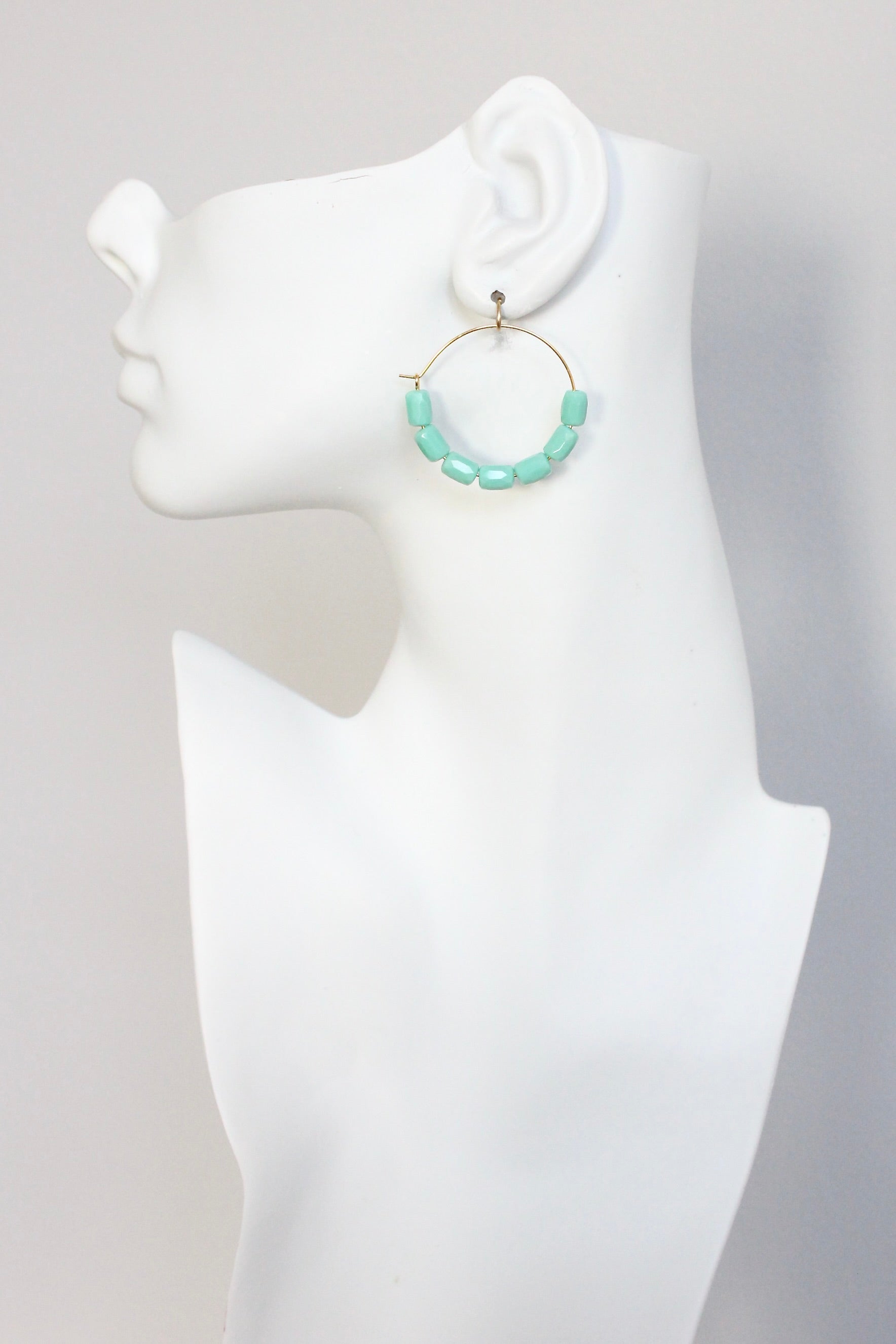 Hoop earrings with turquoise glass beads. Each earring weighs .11 oz. and measures 1.5 inches in length from top to bottom.