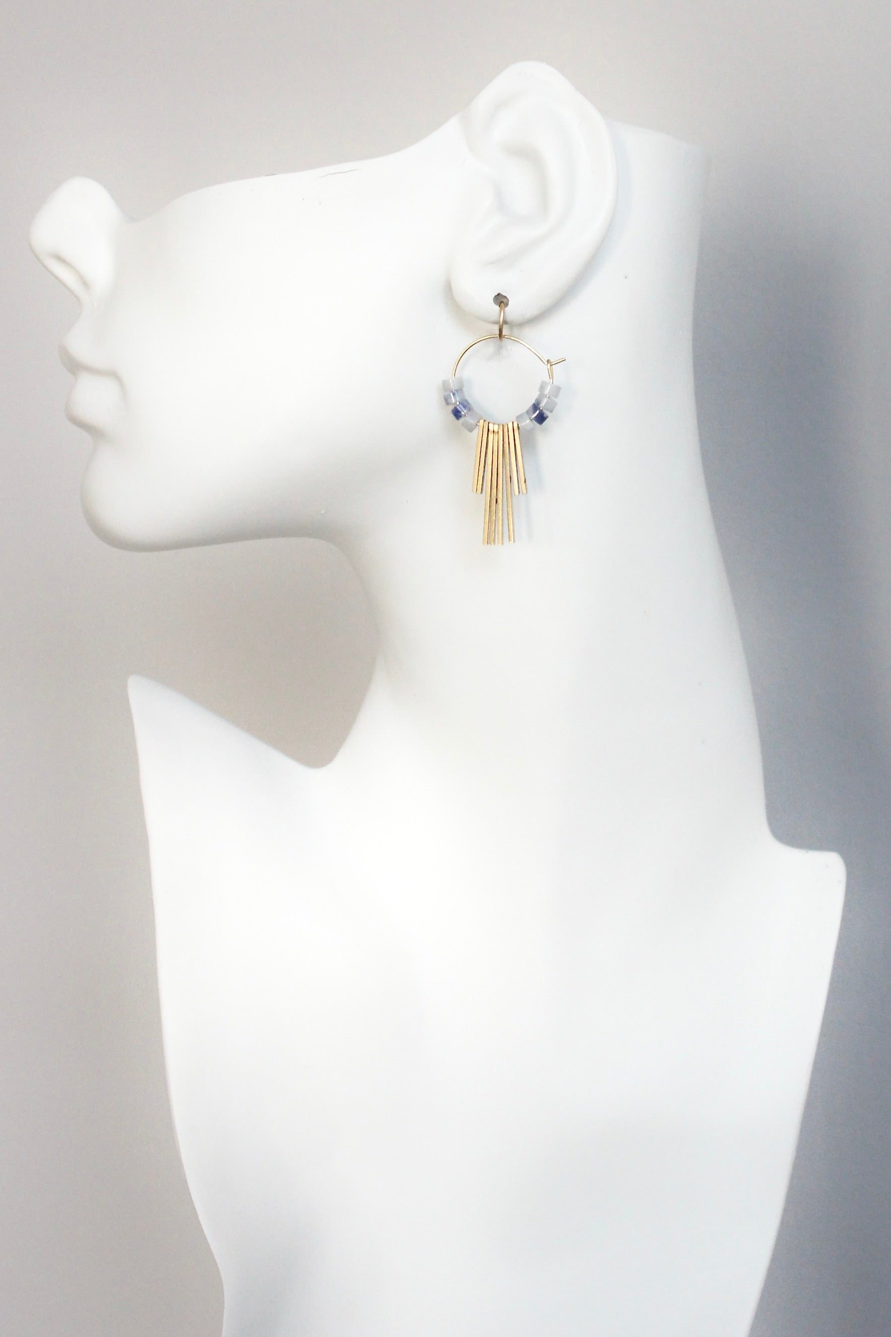 Mini hoop earrings with sodalite and brass. Each earring weighs .12 oz. and measures 1.625 inches in length from top to bottom.
