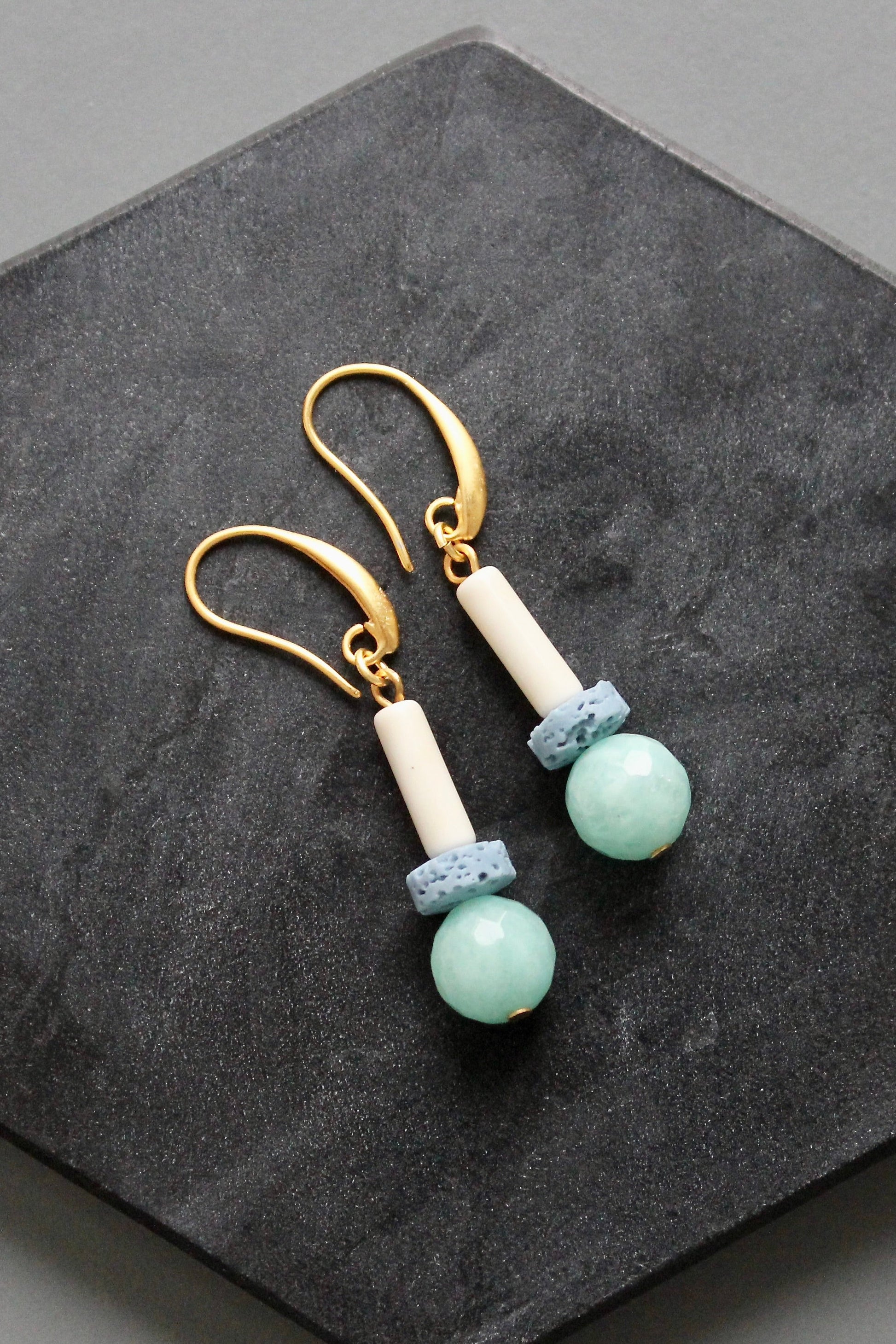 18k gold plated brass hooks with Czech glass, lava beads, and magnesite. Each earring weighs .10 oz. and measures 2 inches in length from top to bottom.