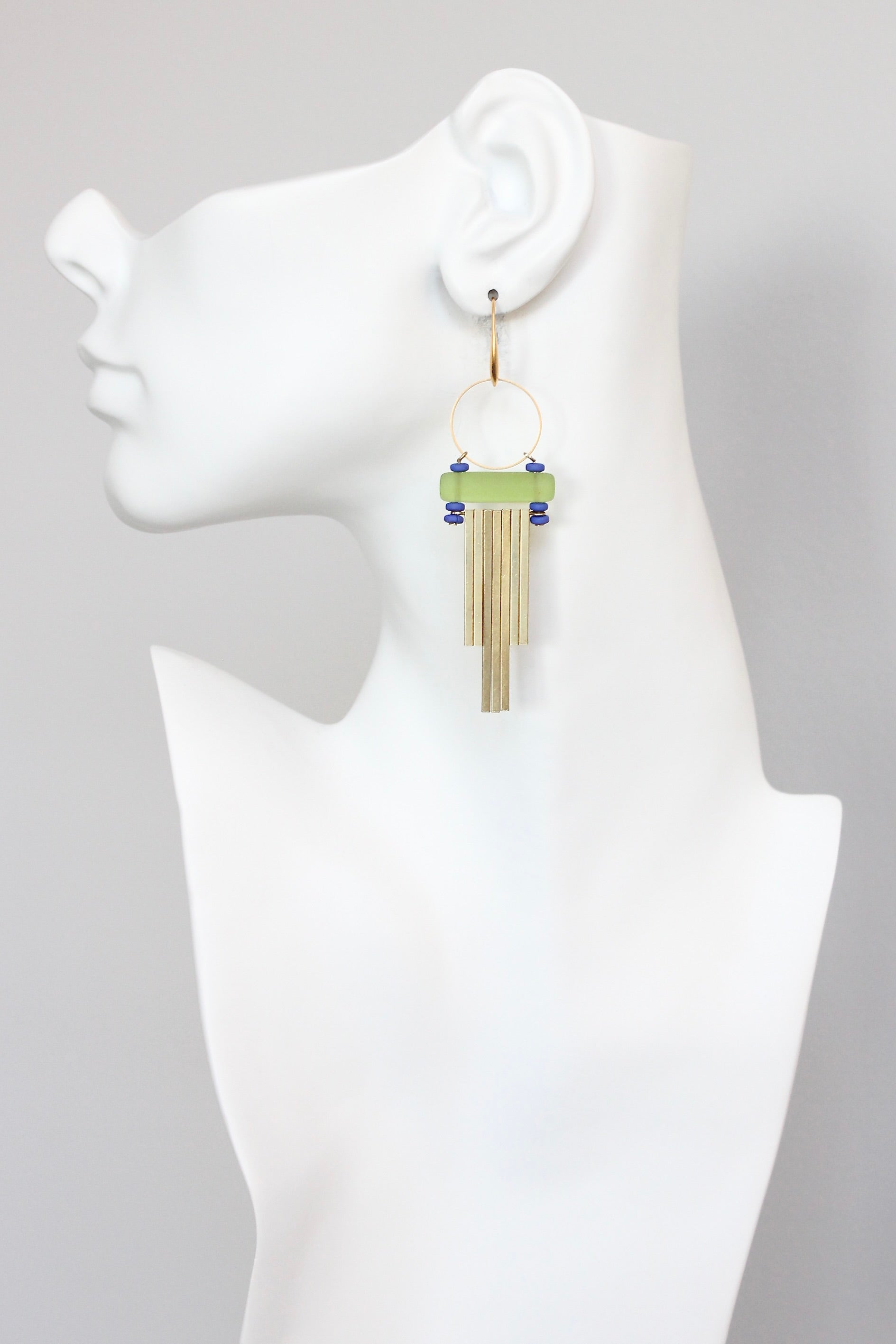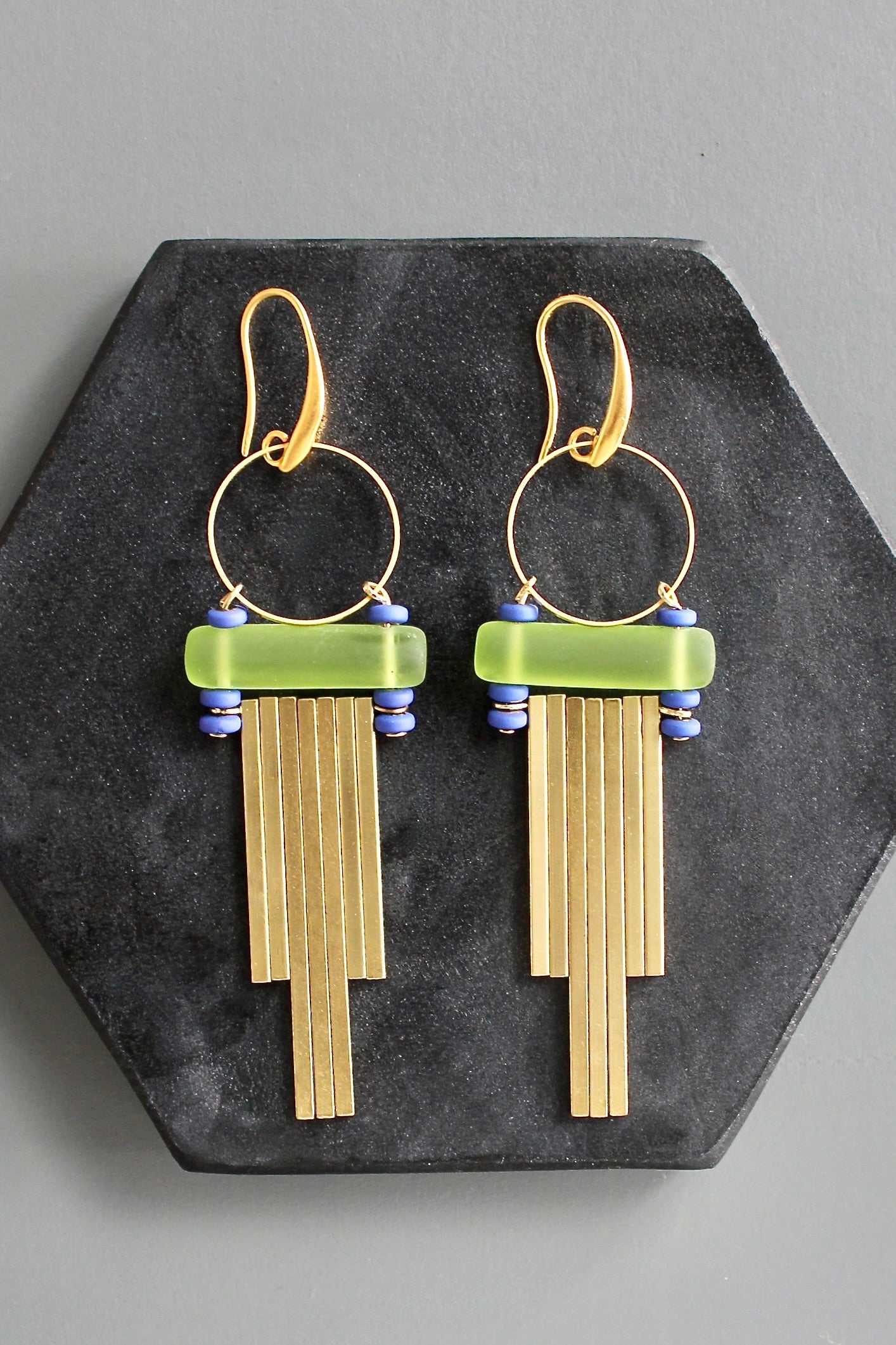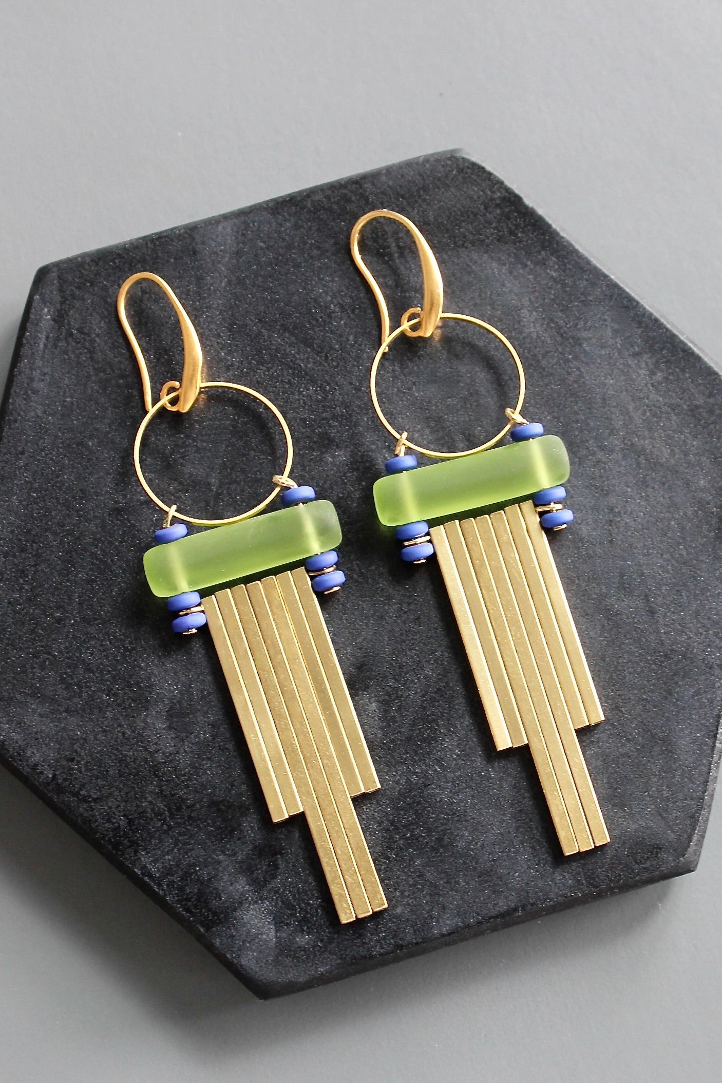18k gold plated brass hooks with Czech glass, cobalt plated hematite, and brass bars. Each earring weighs .43 oz. and measures 3.625 inches in length from top to bottom.