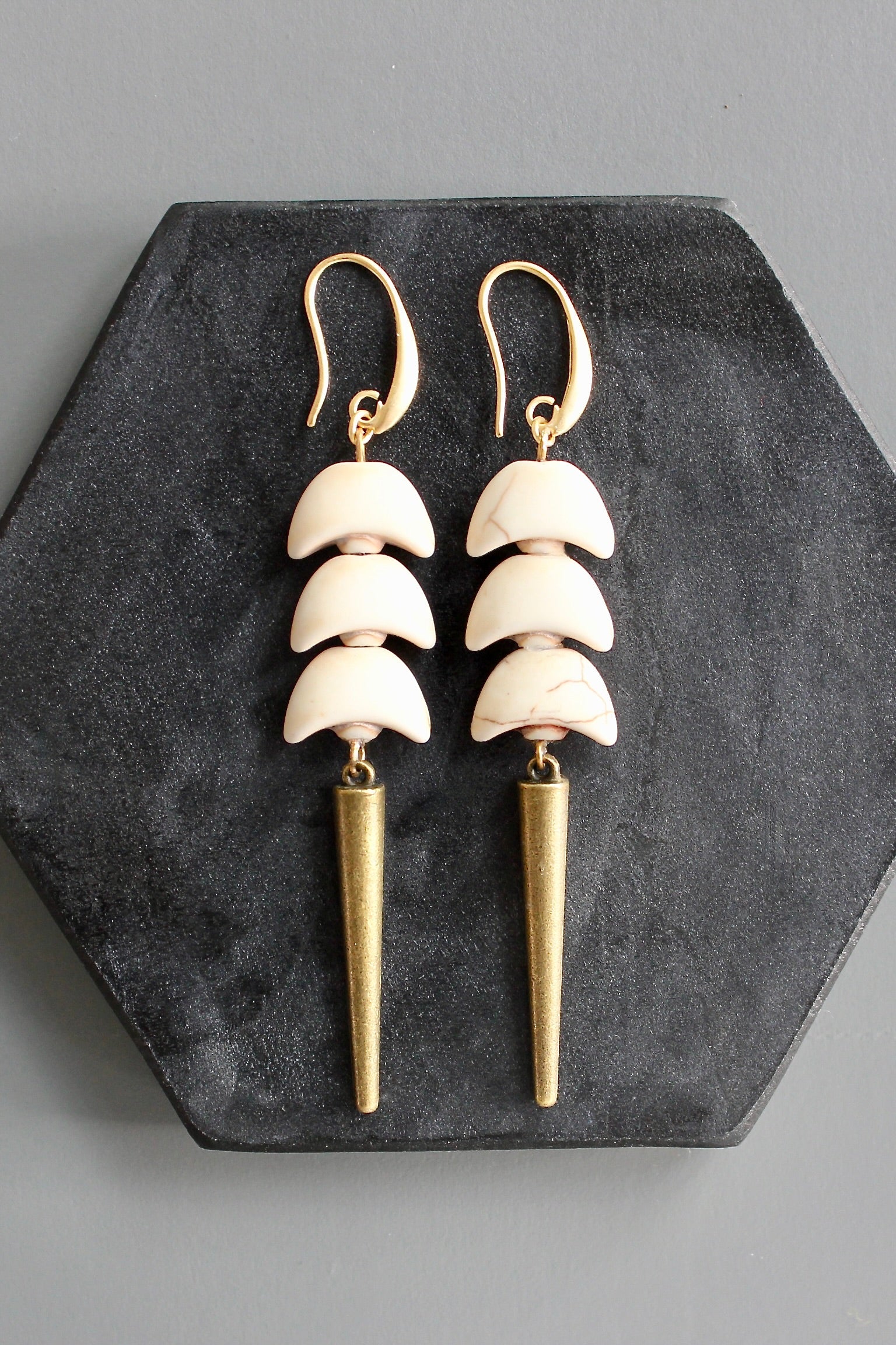 18k gold plated brass hooks with magnesite and spike drop. Each earring weighs .25 oz. and measures 3.625 inches in length from top to bottom.