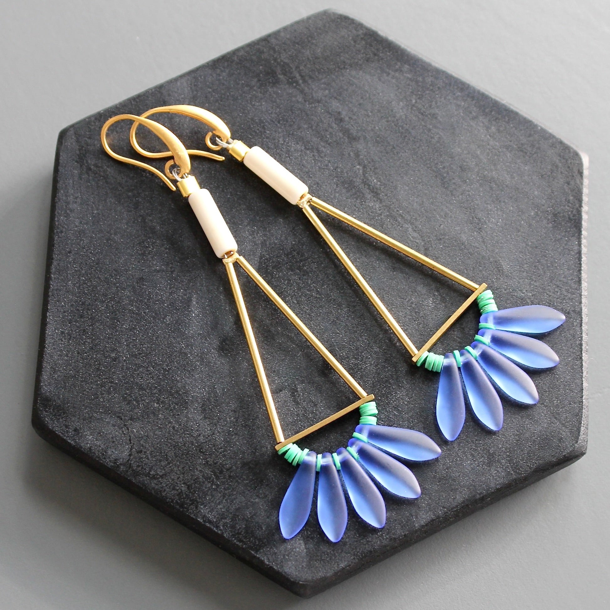 18k gold plated brass hooks with Czech glass, vulcanite, and magnesite. Each earring weighs .11 oz. and measures 3.75 inches in length from top to bottom.