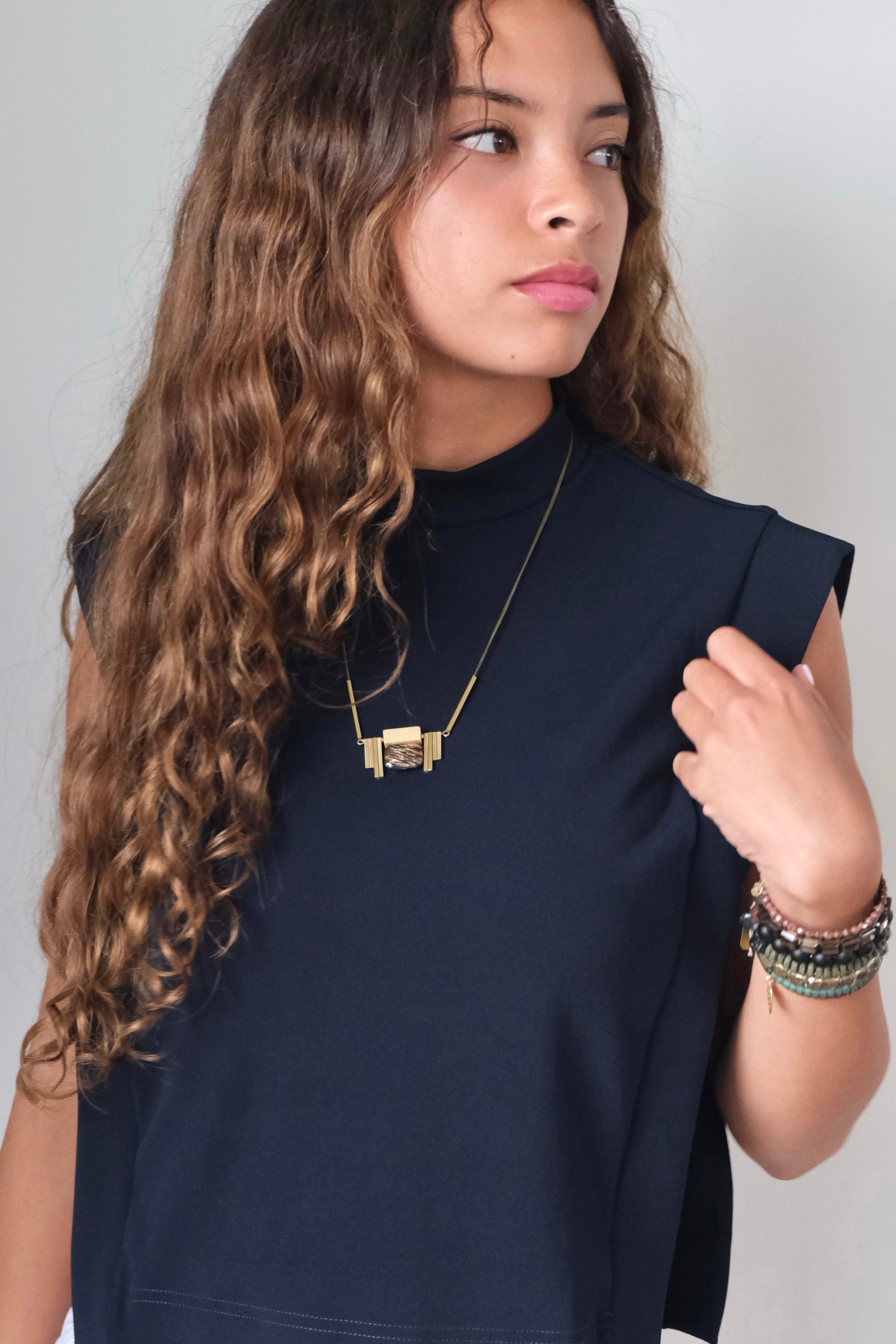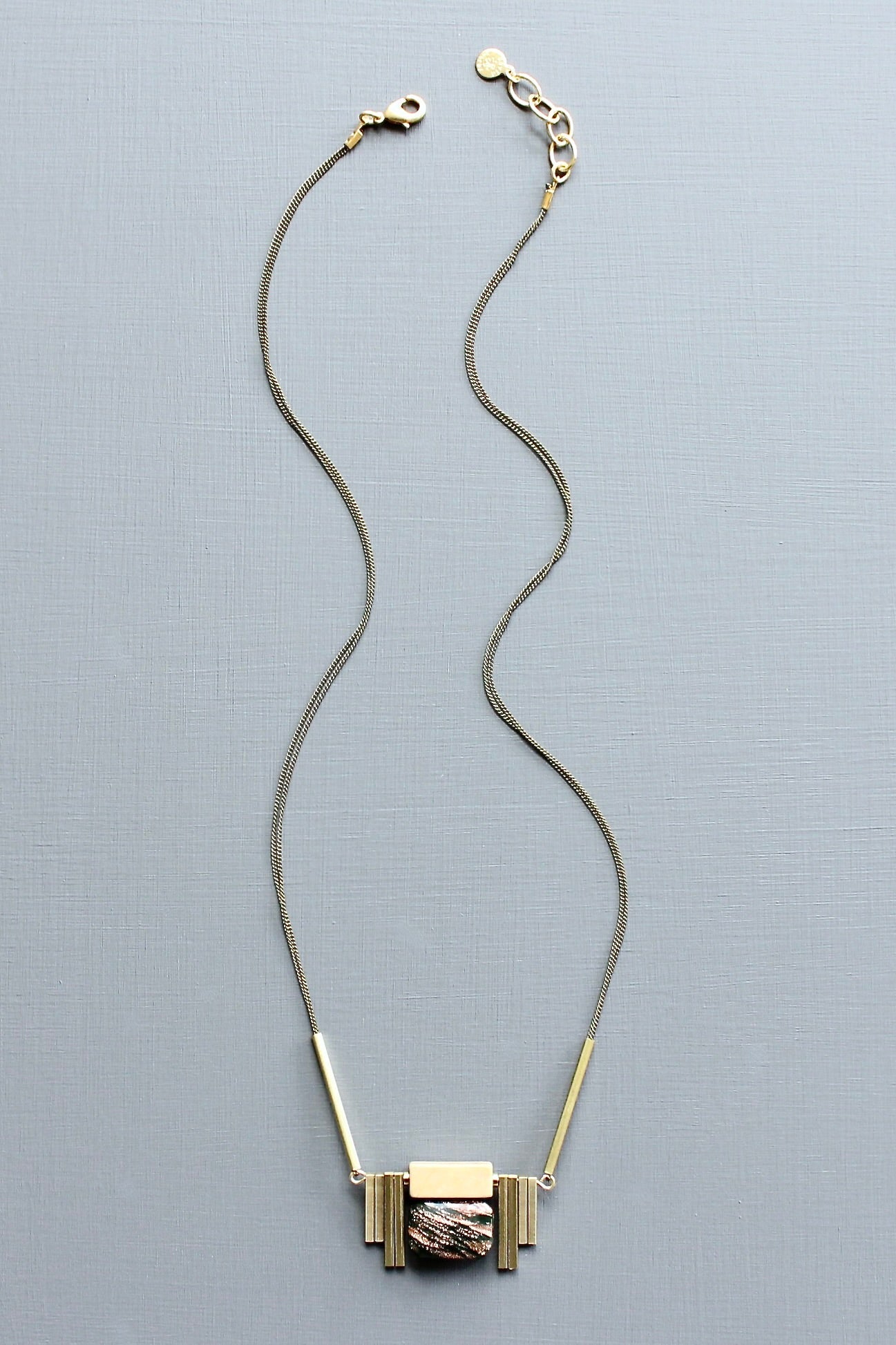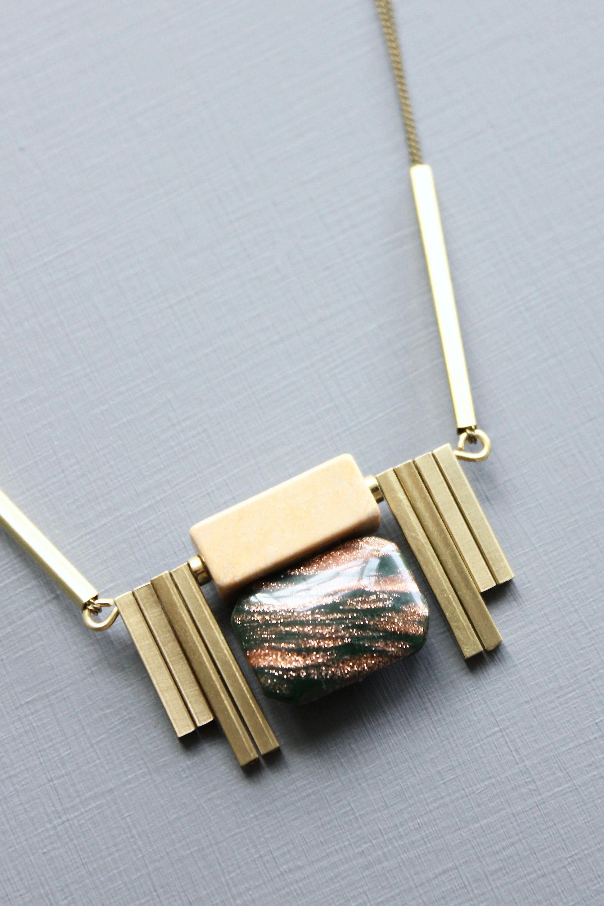 15” triple strand necklace with snake chain, vulcanite, brass, Dalmatian jasper, and dyed jade beads. 2 inch extender.
