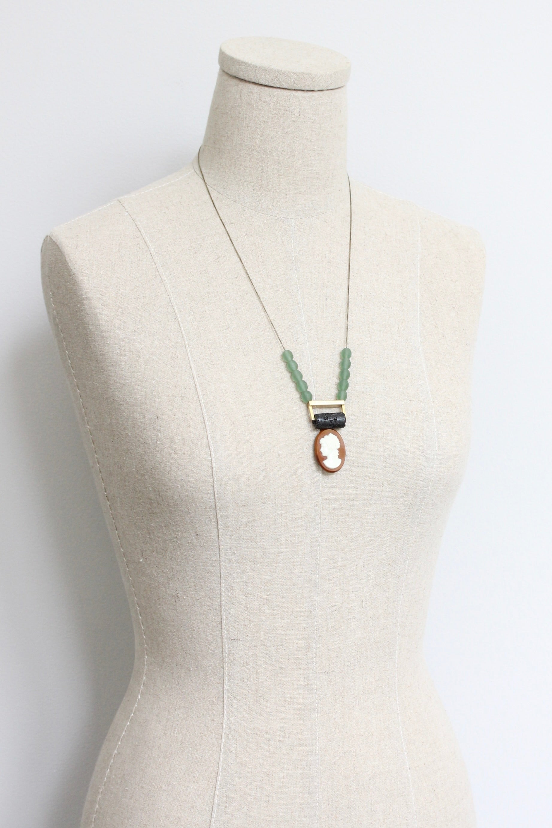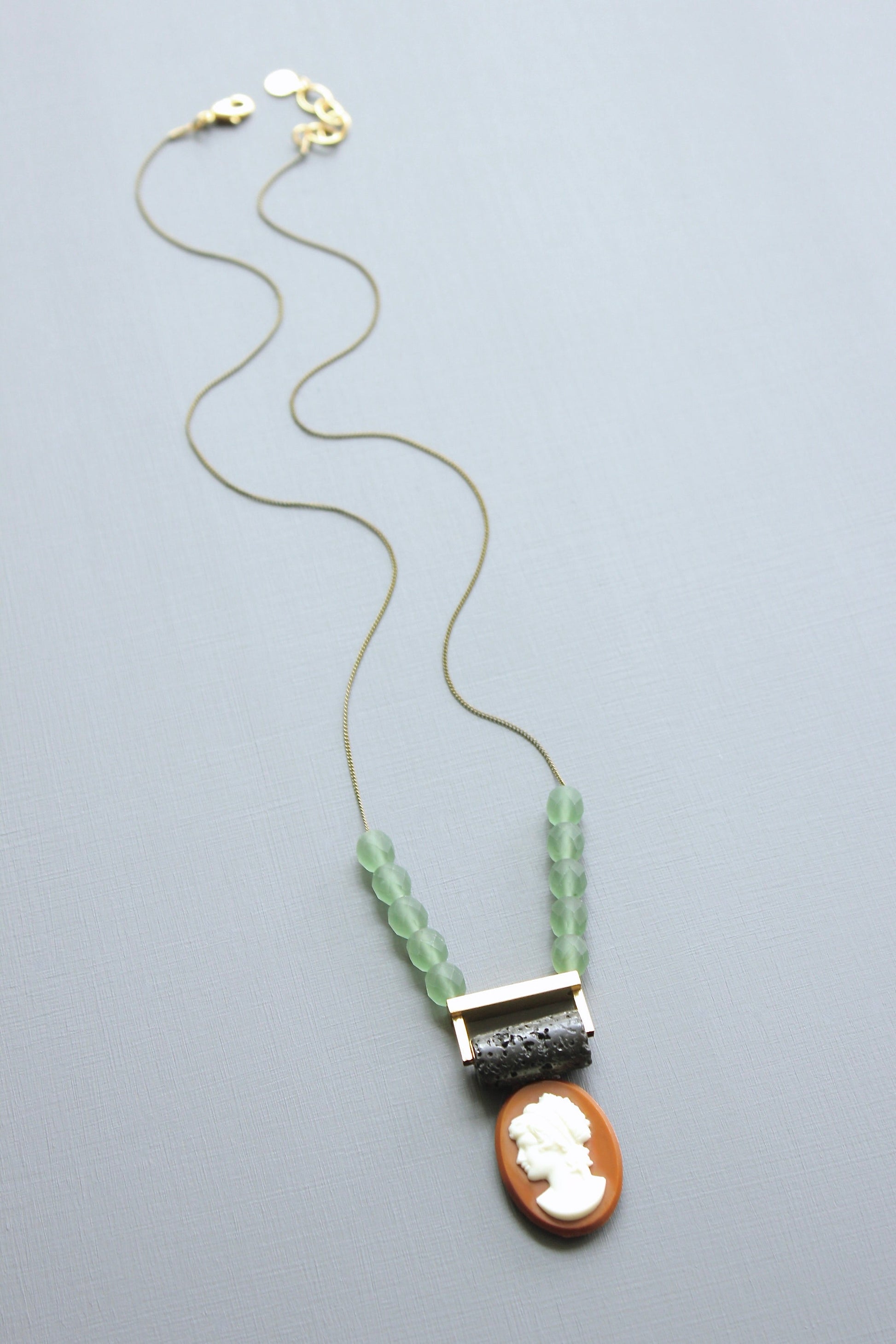 23” necklace with oxidized brass chain, vintage glass cameo, and lava bead pendant. 1 inch extender.
