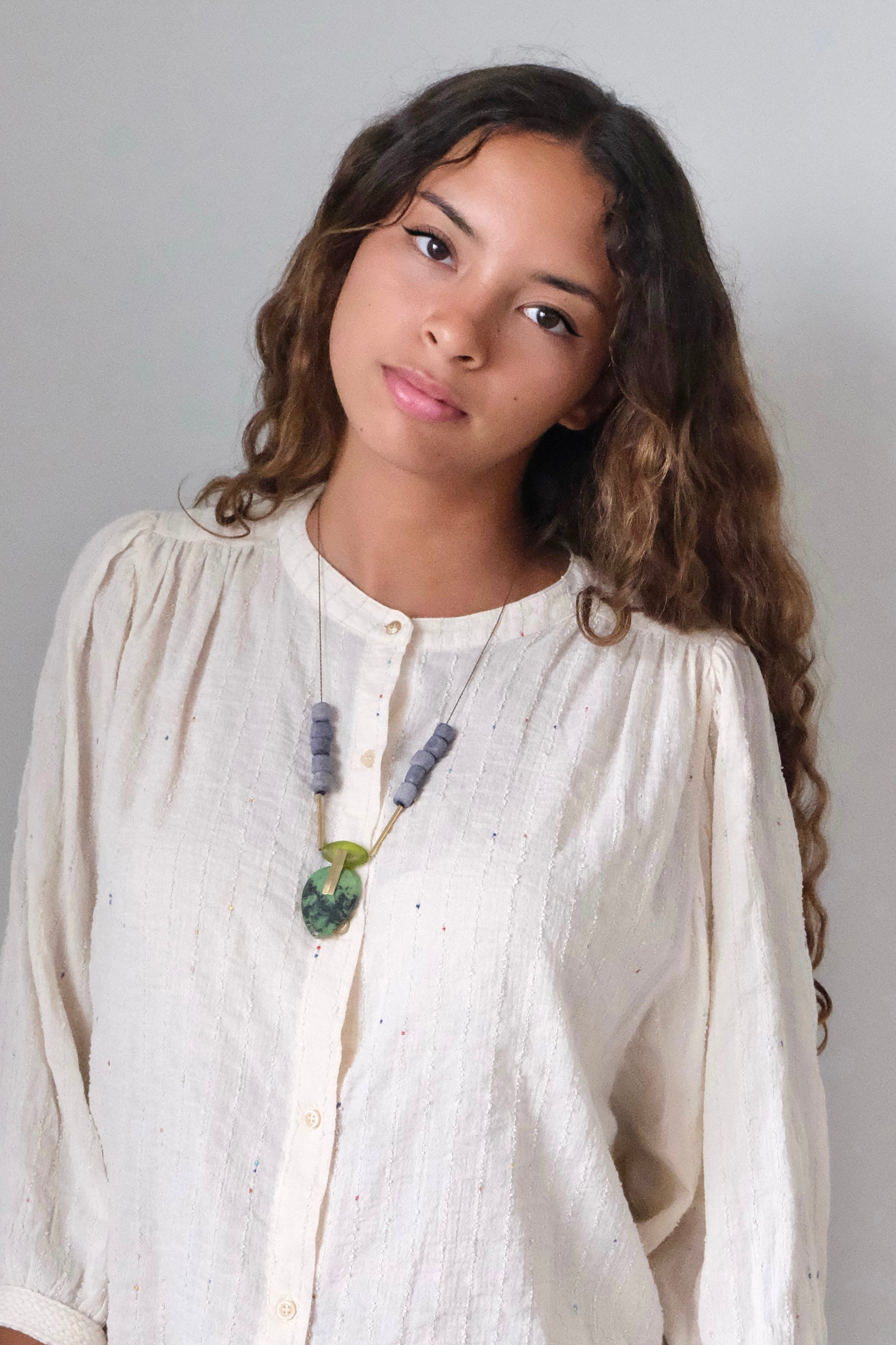 24” necklace with oxidized brass chain, glass, and green jasper. 1 inch extender.