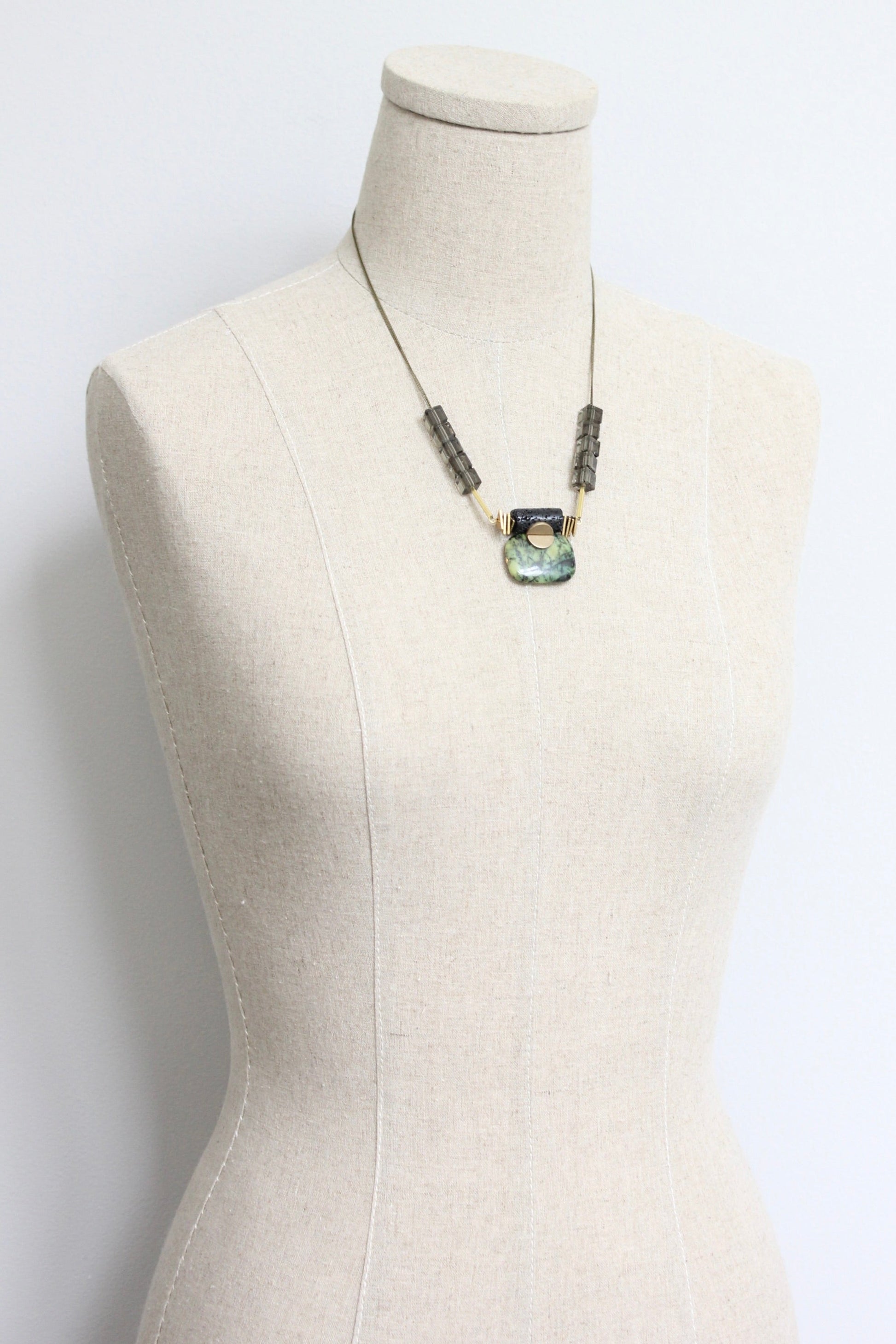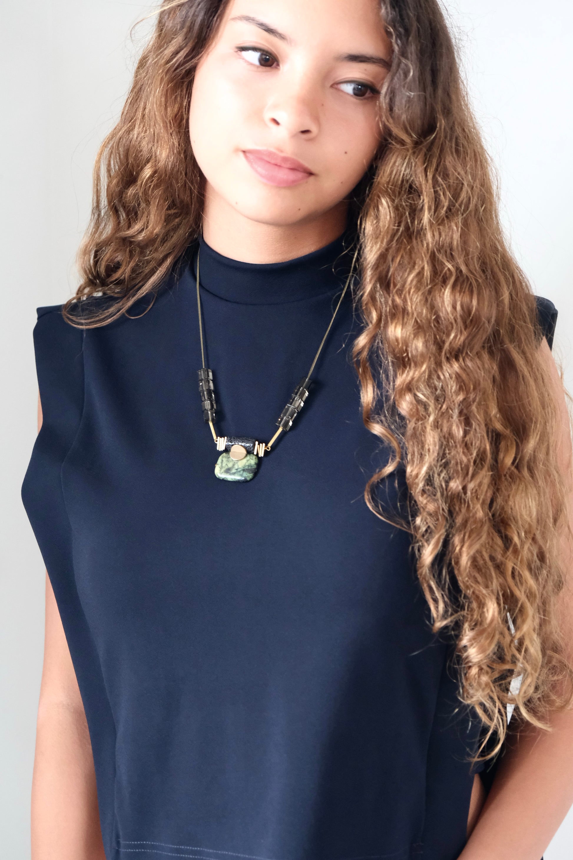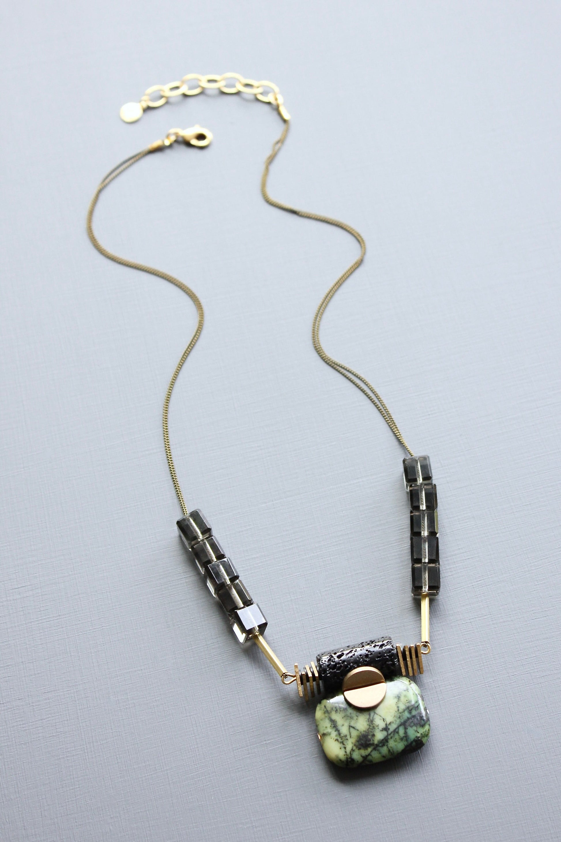 19” necklace with oxidized brass chain, green jasper, and lava pendant. 2 inch extender.
