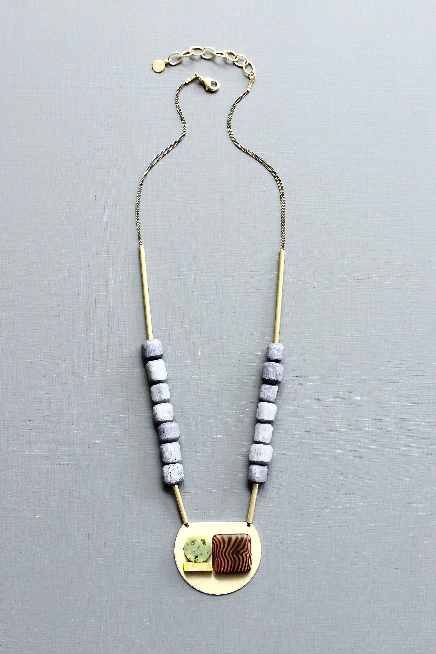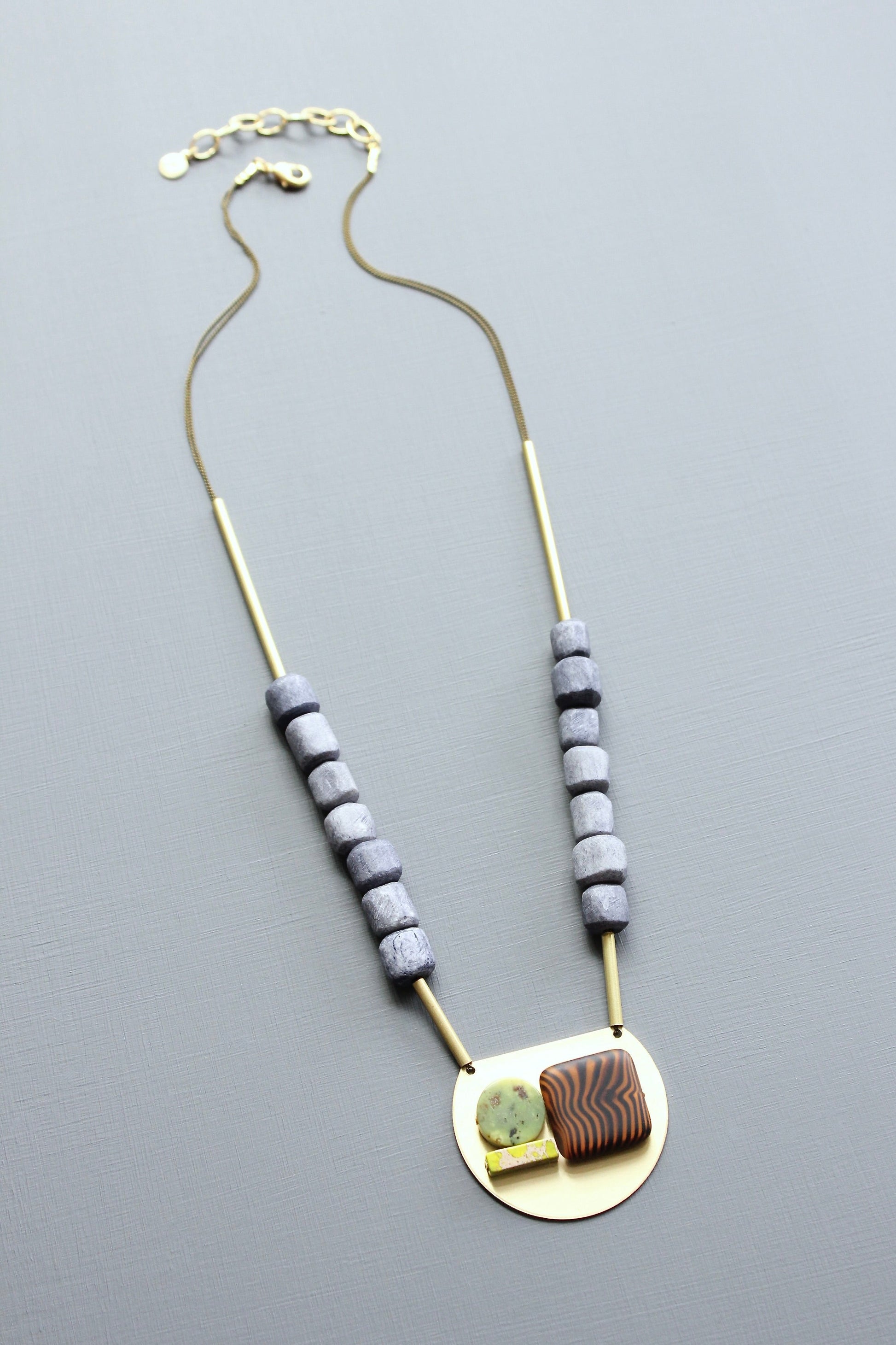 21” necklace with oxidized brass chain, wood, jasper, and glass. 2 inch extender.