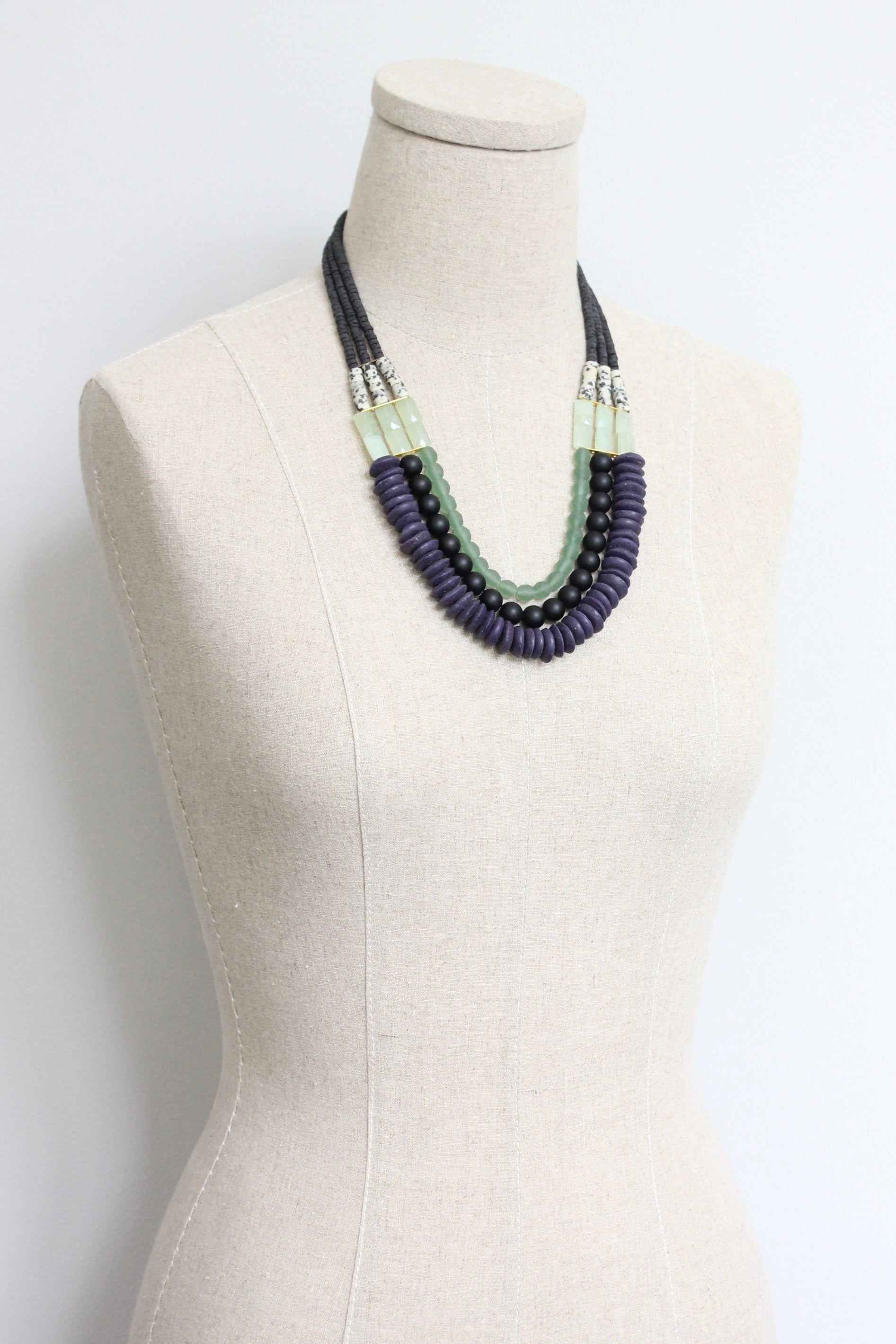 21” triple strand necklace with purple Ghana glass, Czech glass, jade, Dalmatian jasper, and lava beads. 3 inch extender.