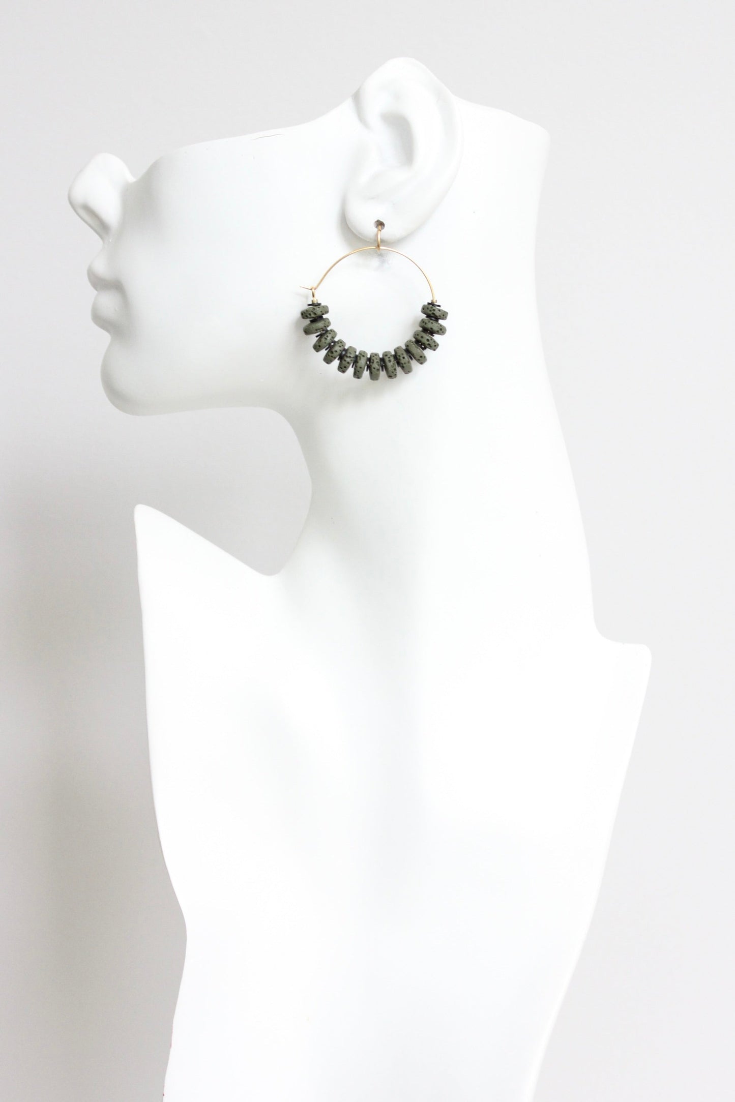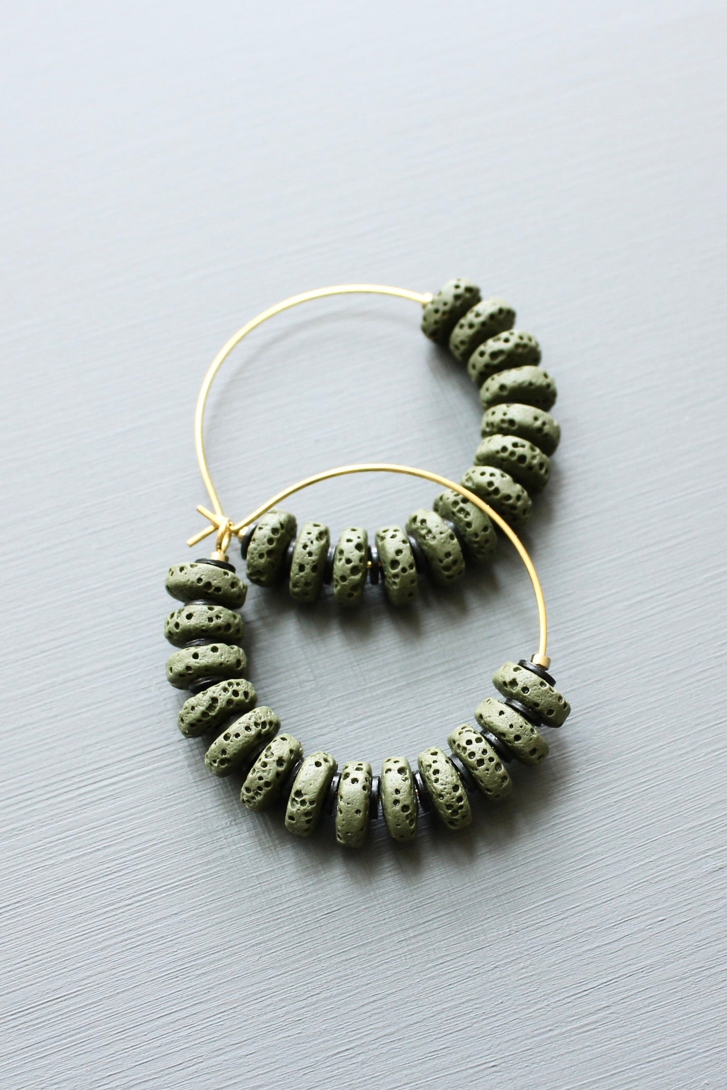 Gold plated hoop earrings with moss lava beads and vulcanite. Each earring measures 1.5 inches.