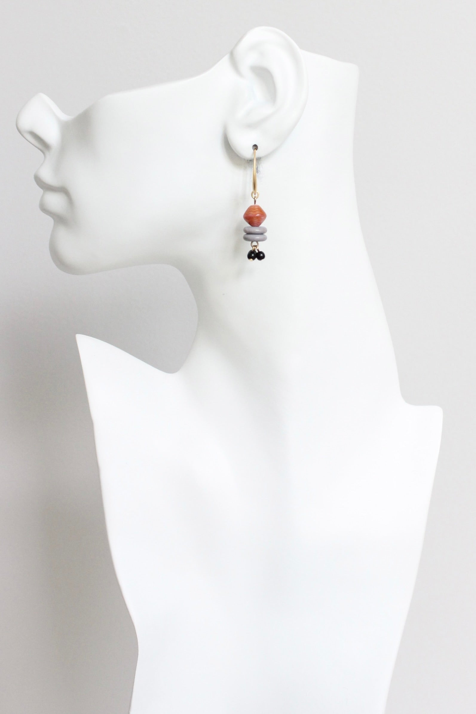 Gold plated brass hooks with vintage caramel glass, magnesite, and jet glass cluster. Each earring measures 1.875 inches.