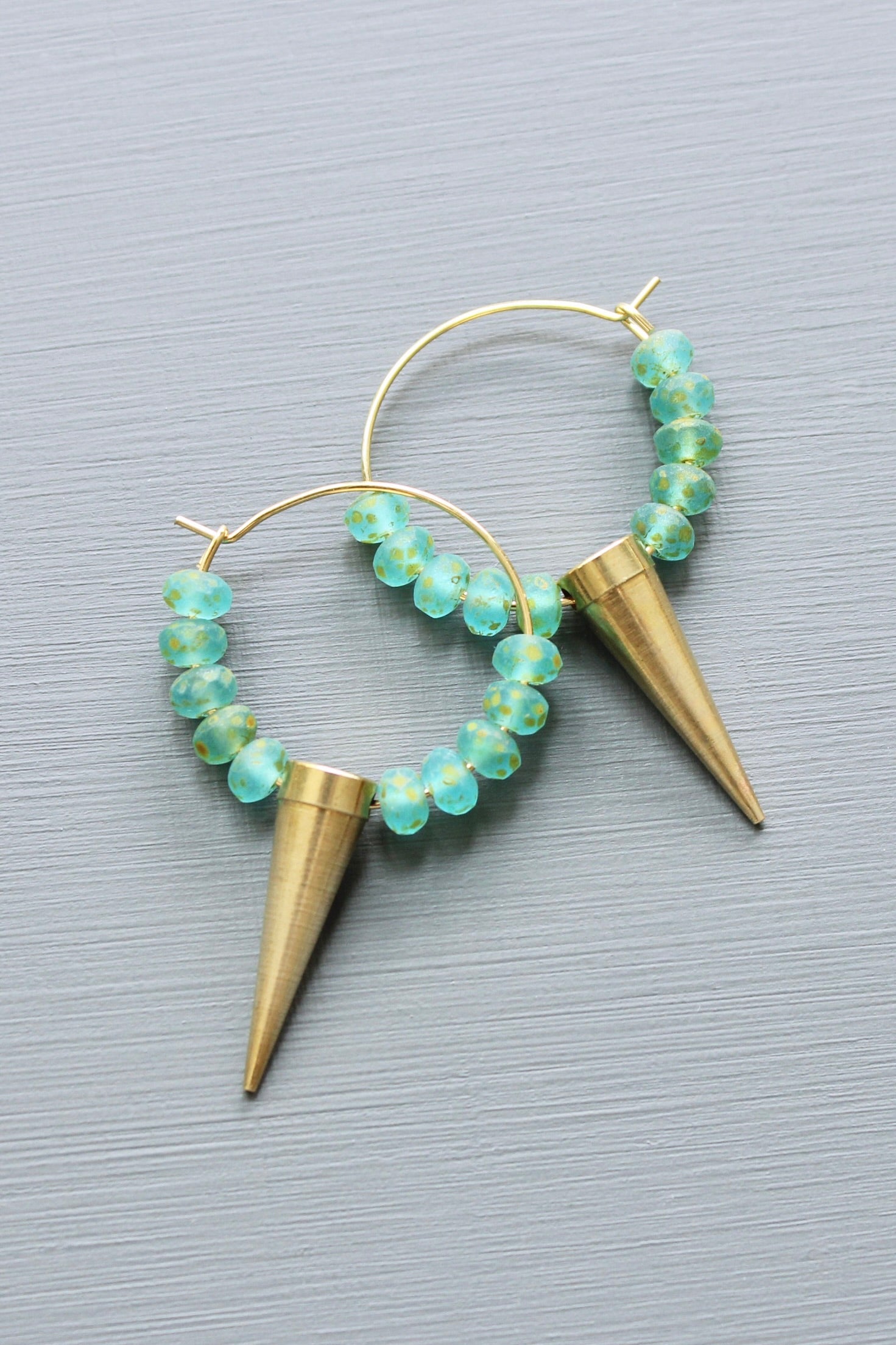 Gold plated small hoop earrings with aqua glass and brass spike. Each earring measures 2 inches.