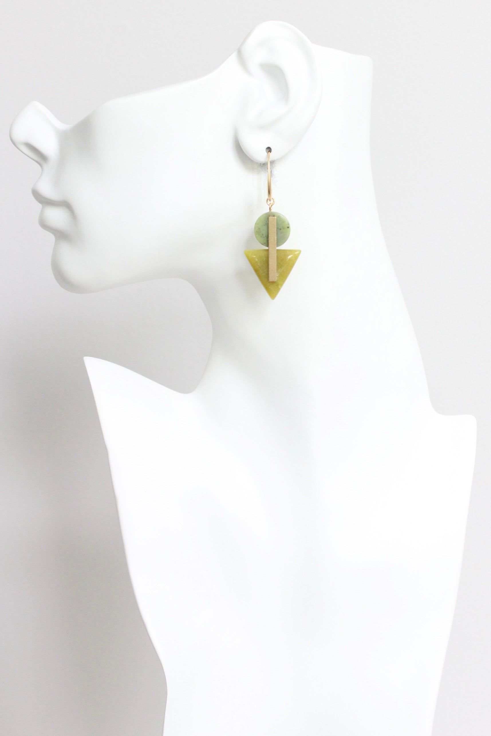 Gold plated brass hook earrings, green jasper, and green jade. Each earring measures 2.25inches and weighs ounces.