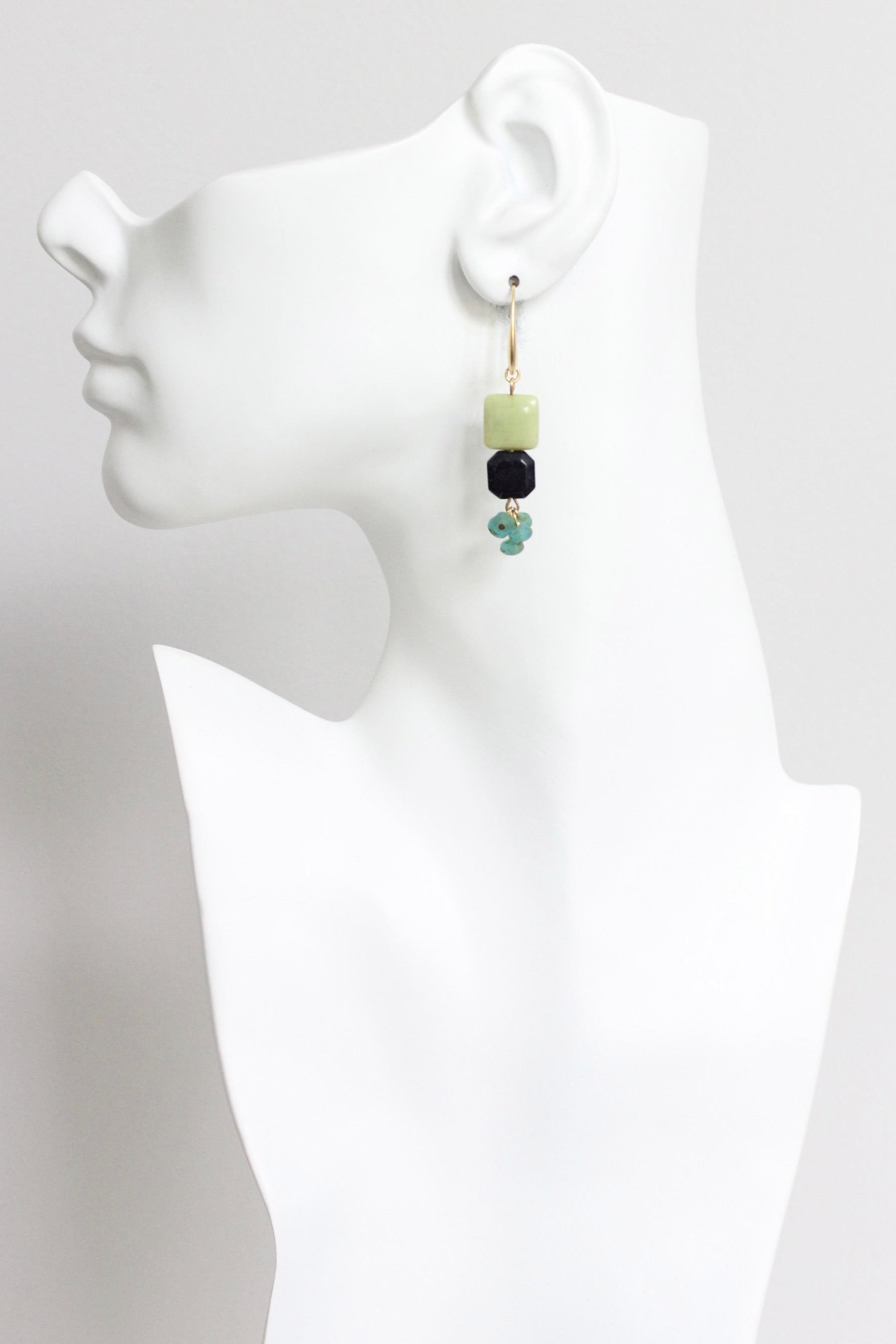 Gold plated brass hook earrings with green jasper, blue goldstone, and aqua glass. Each earring measures 2.375 inches.