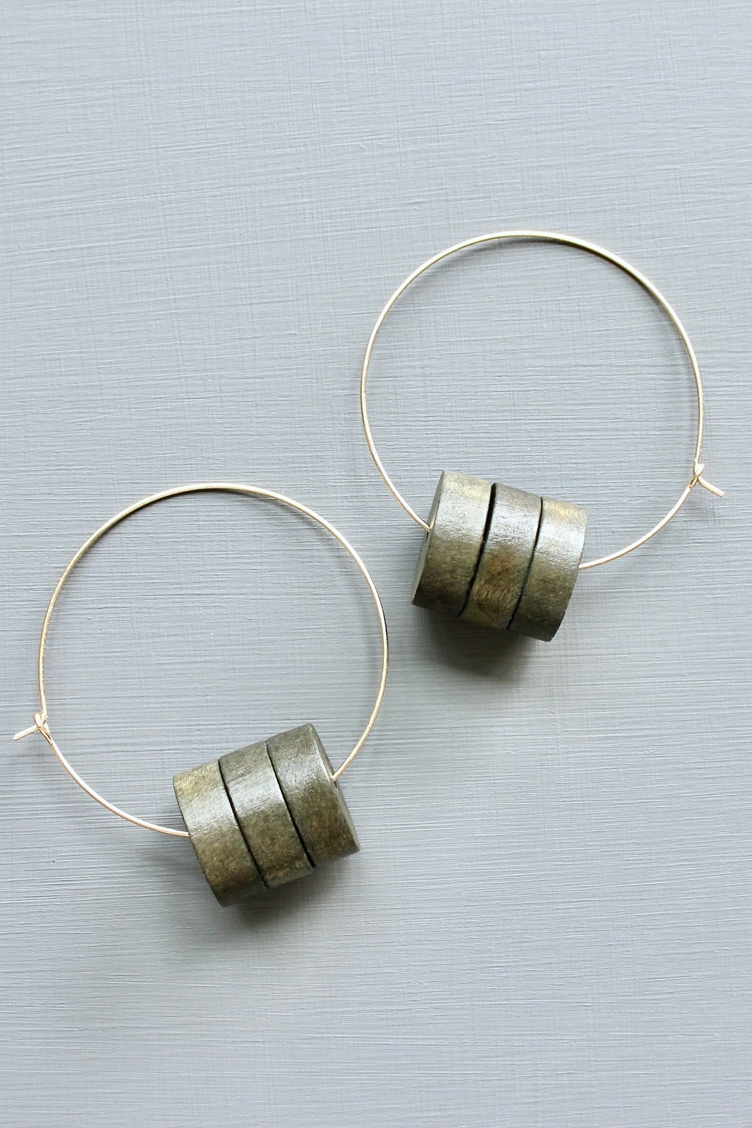 Gold plated brass hook earrings with wood discs. Each earring measures 2.375 inches.