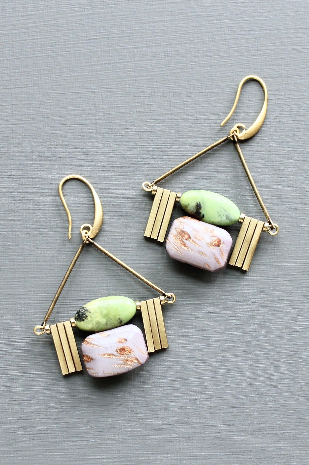 Gold plated brass hook earrings with green jasper and vintage lavender glass. Each earring measures 2.375 inches.