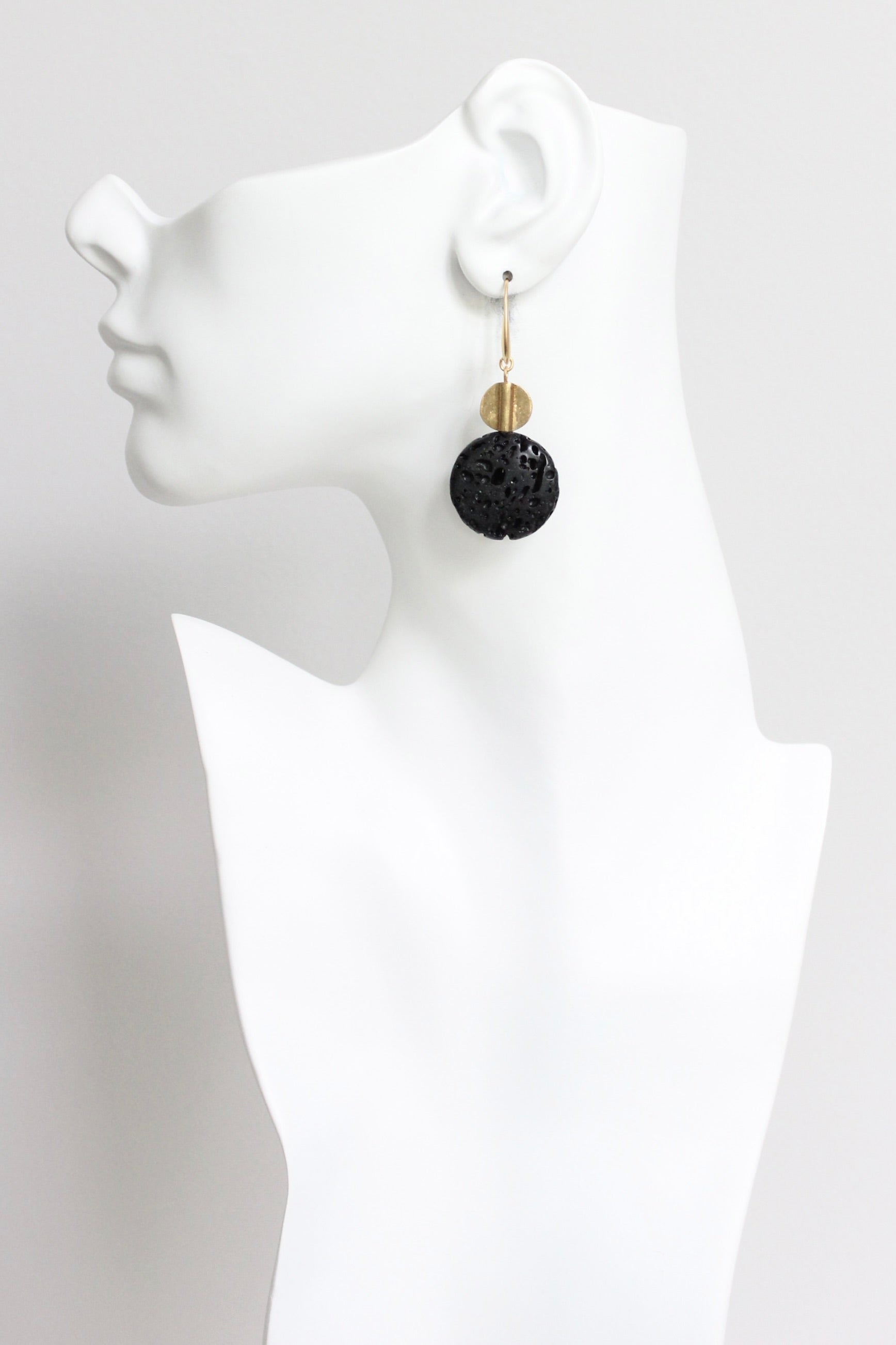 Gold plated brass hook earrings with black lava beads. Each earring measures 2.375 inches.