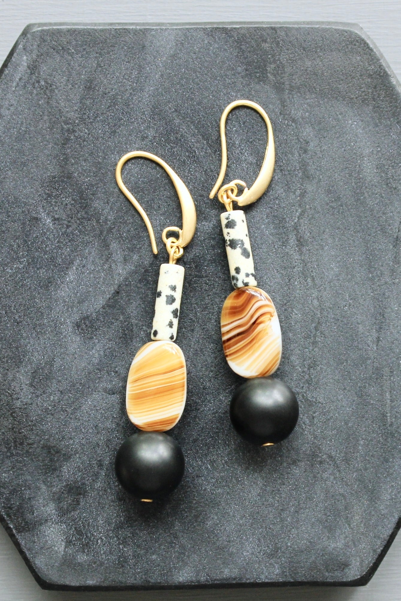 Gold plated brass hook earrings with Dalmatian jasper, vintage matrix, and jet glass. Each earring measures 2.625 inches.
