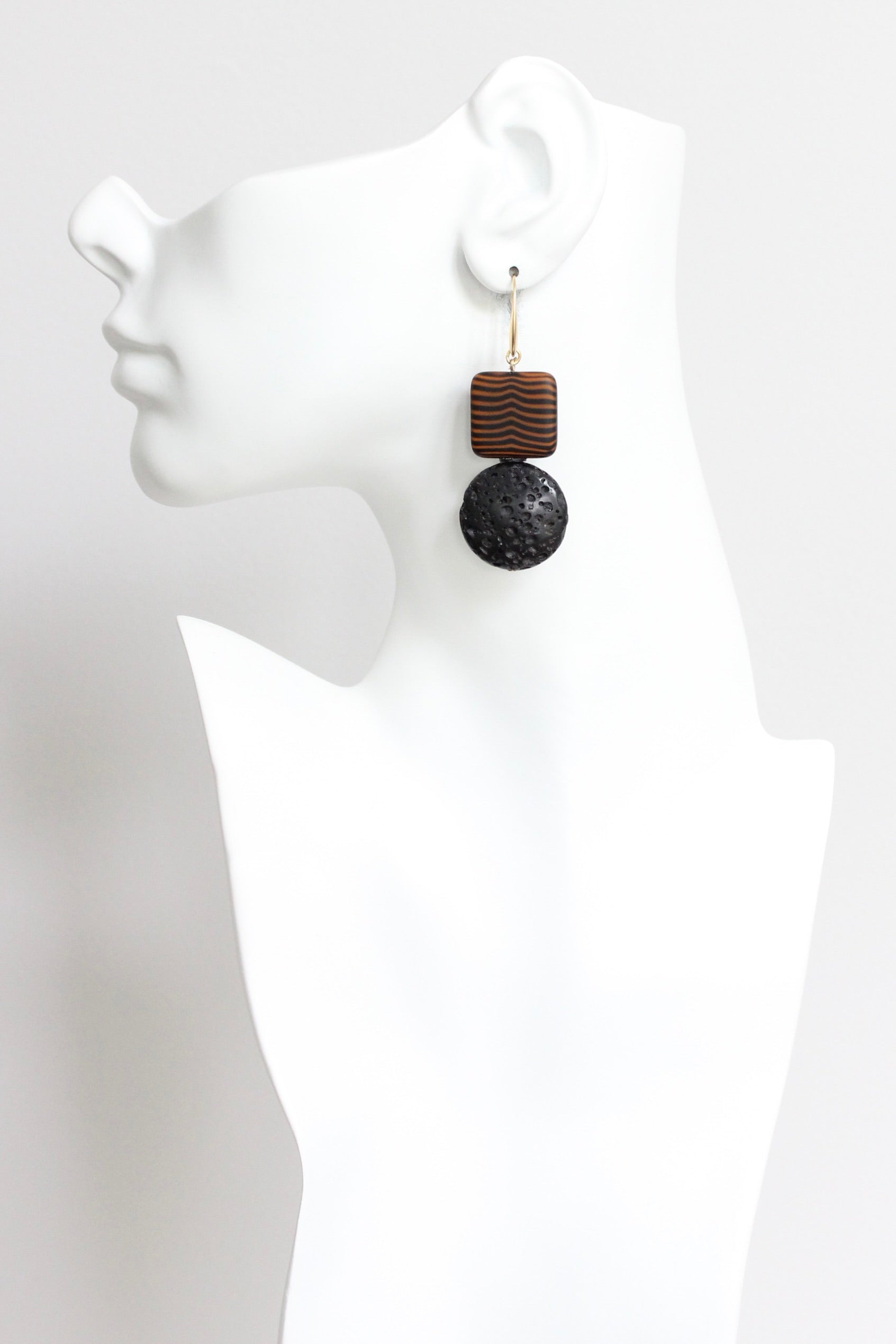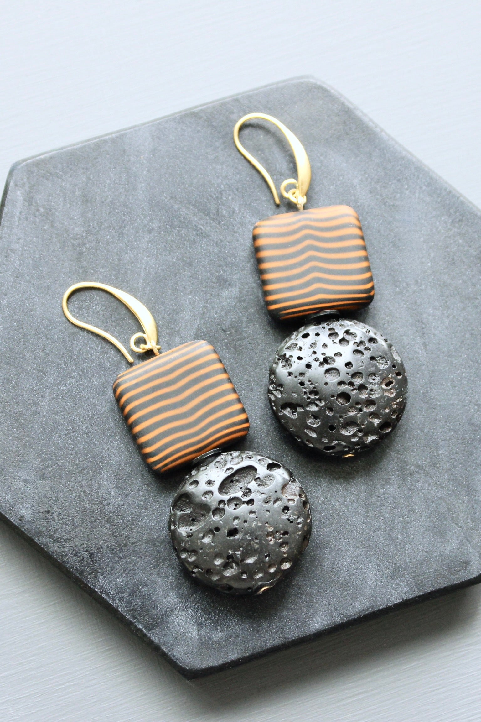 Gold plated brass hook earrings with black lava beads and striped glass. Each earring measures 2.625 inches.