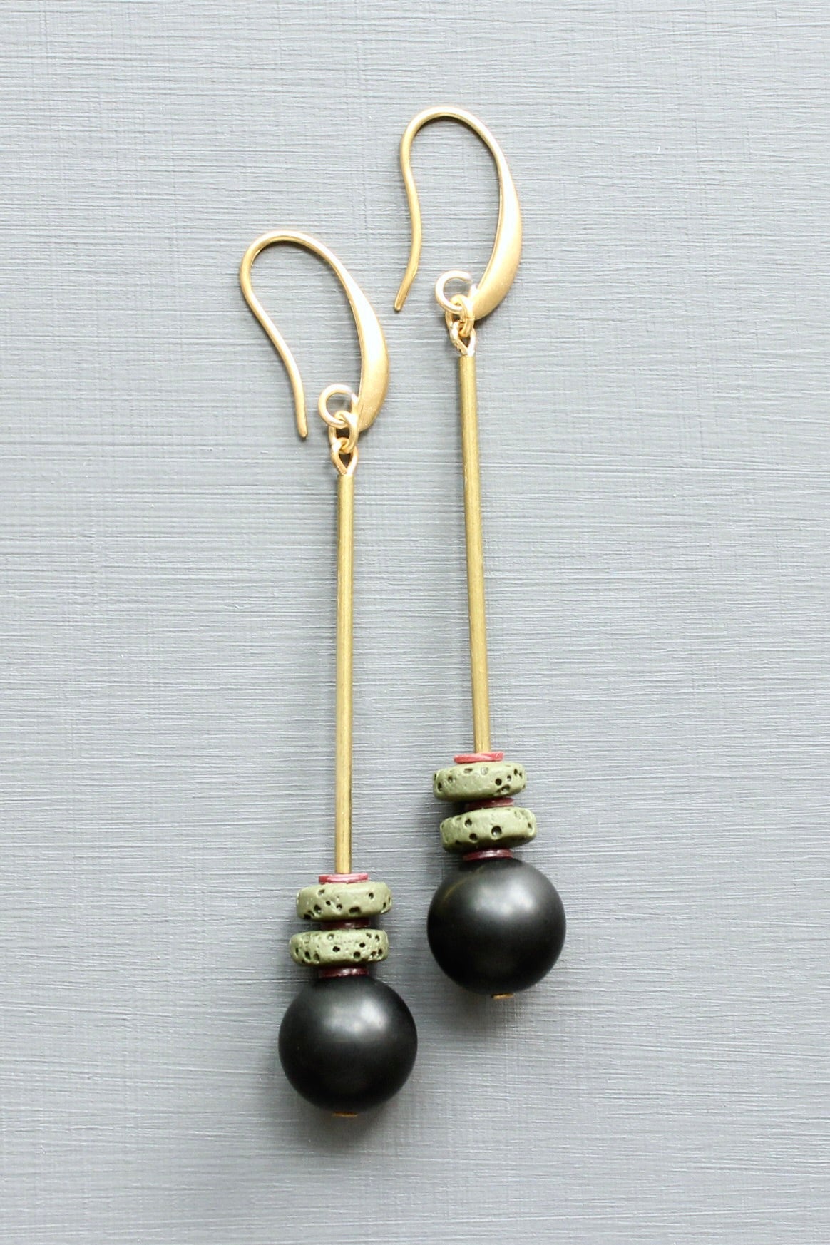 Gold plated brass hook earrings with moss lava beads and jet glass. Each earring measures 3.125 inches.