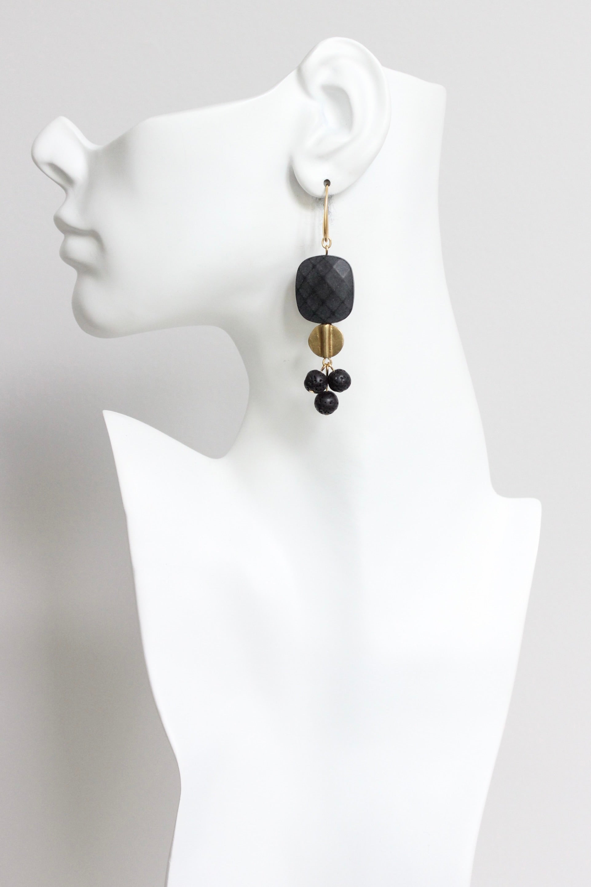 Gold plated brass hook earrings with black acrylic and lava beads. Each earring measures 3.125 inches.