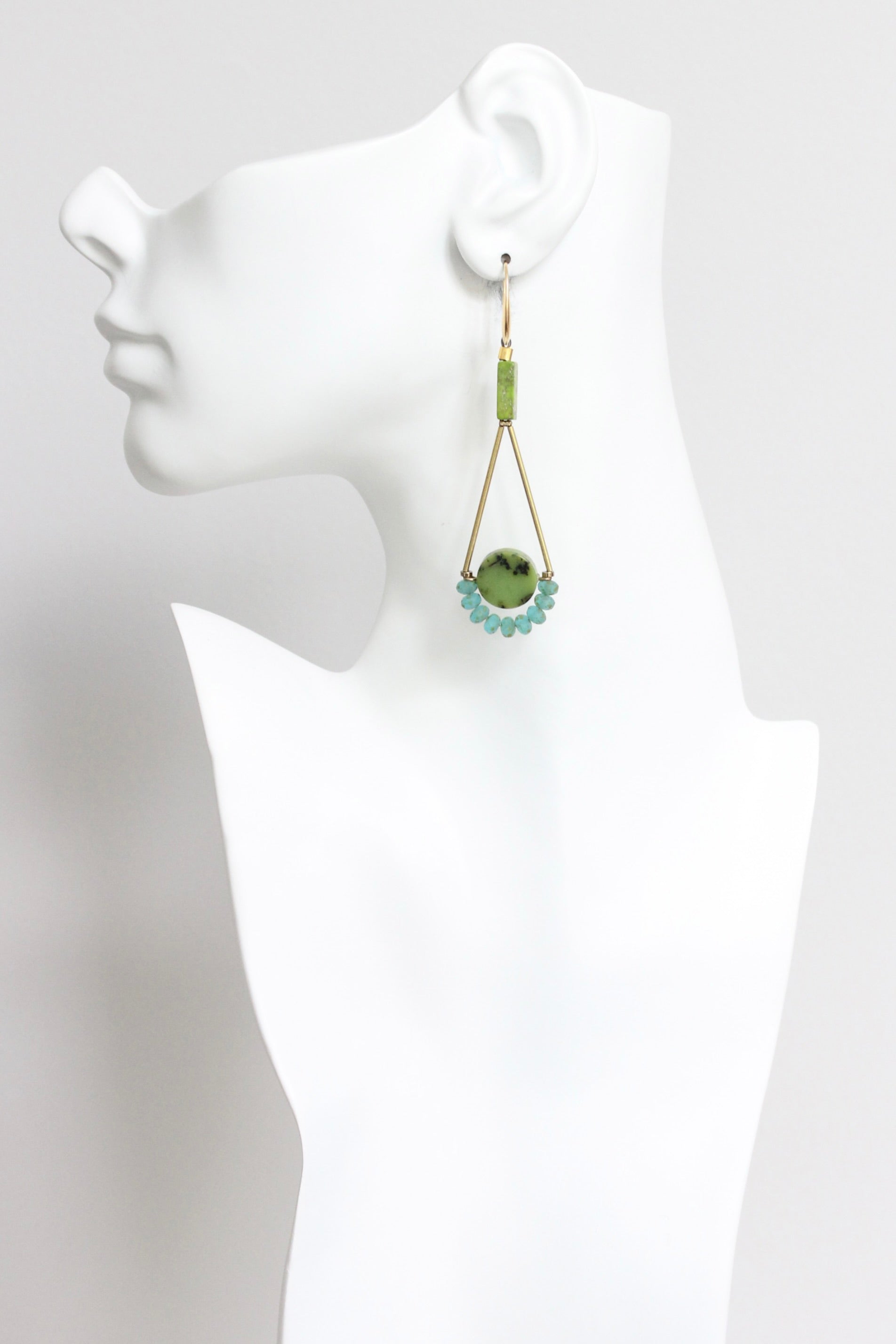 Gold plated brass hook earrings with green jasper and aqua glass. Each earring measures 3.5 inches.