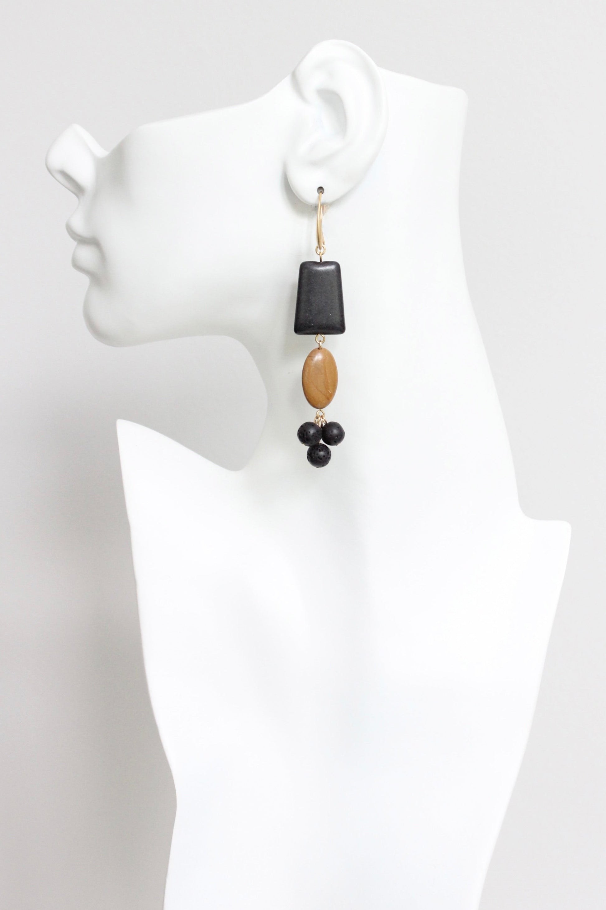 Gold plated brass hook earrings with magnesite, jasper, and lava beads. Each earring measures 3.625 inches.