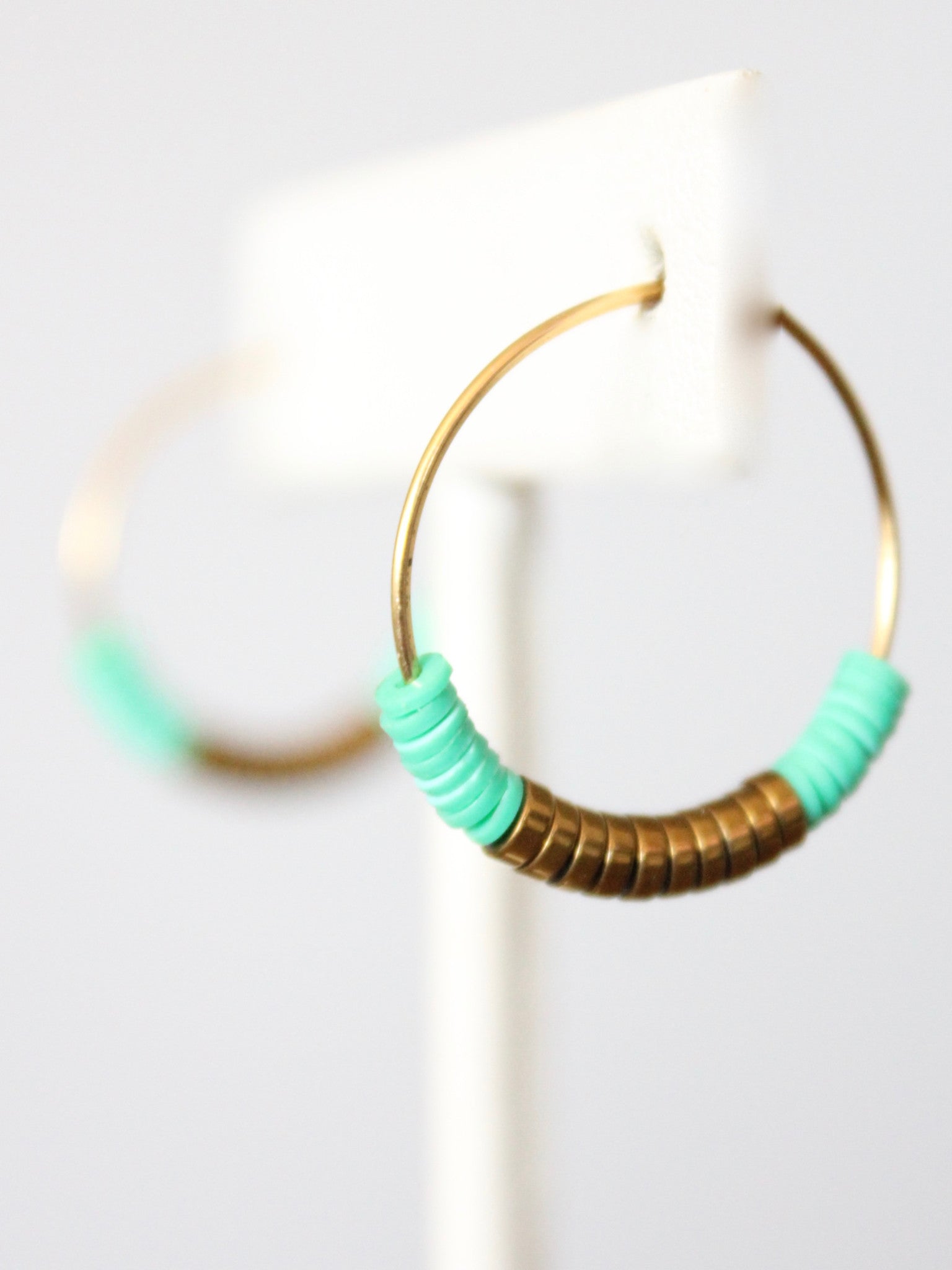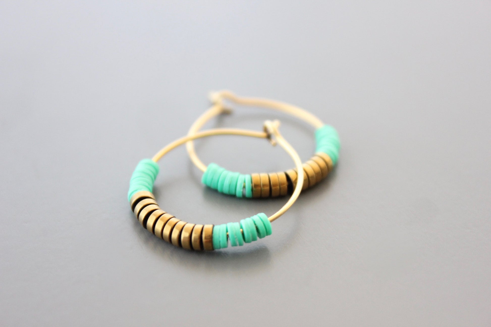 18k gold plated hoop earrings with vulcanite and plated hematite beads. 1” drop.