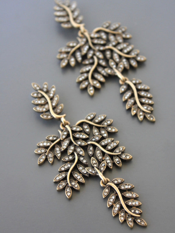 Antique gold plated post earrings with glass rhinestones. 3.25” drop.