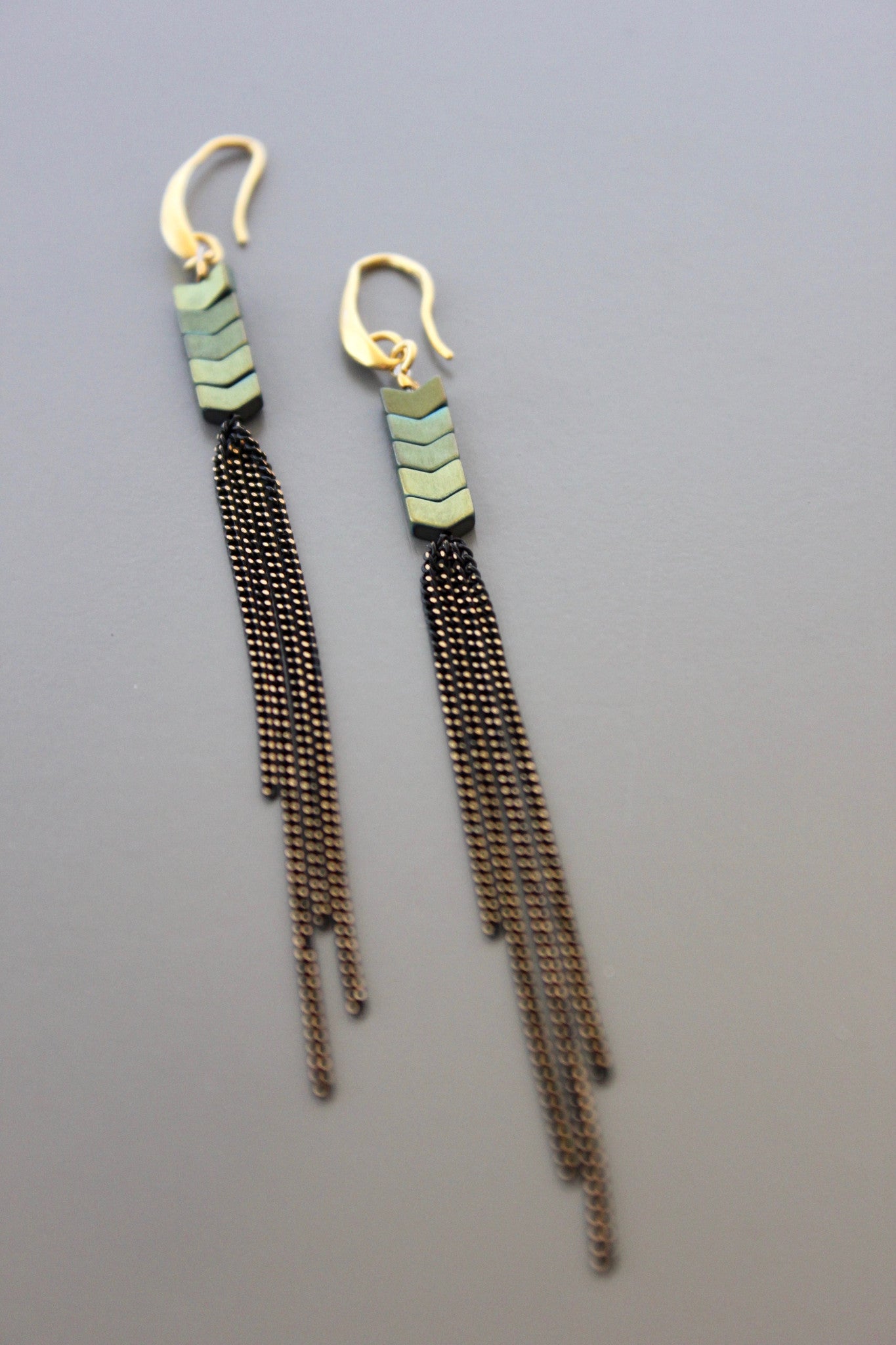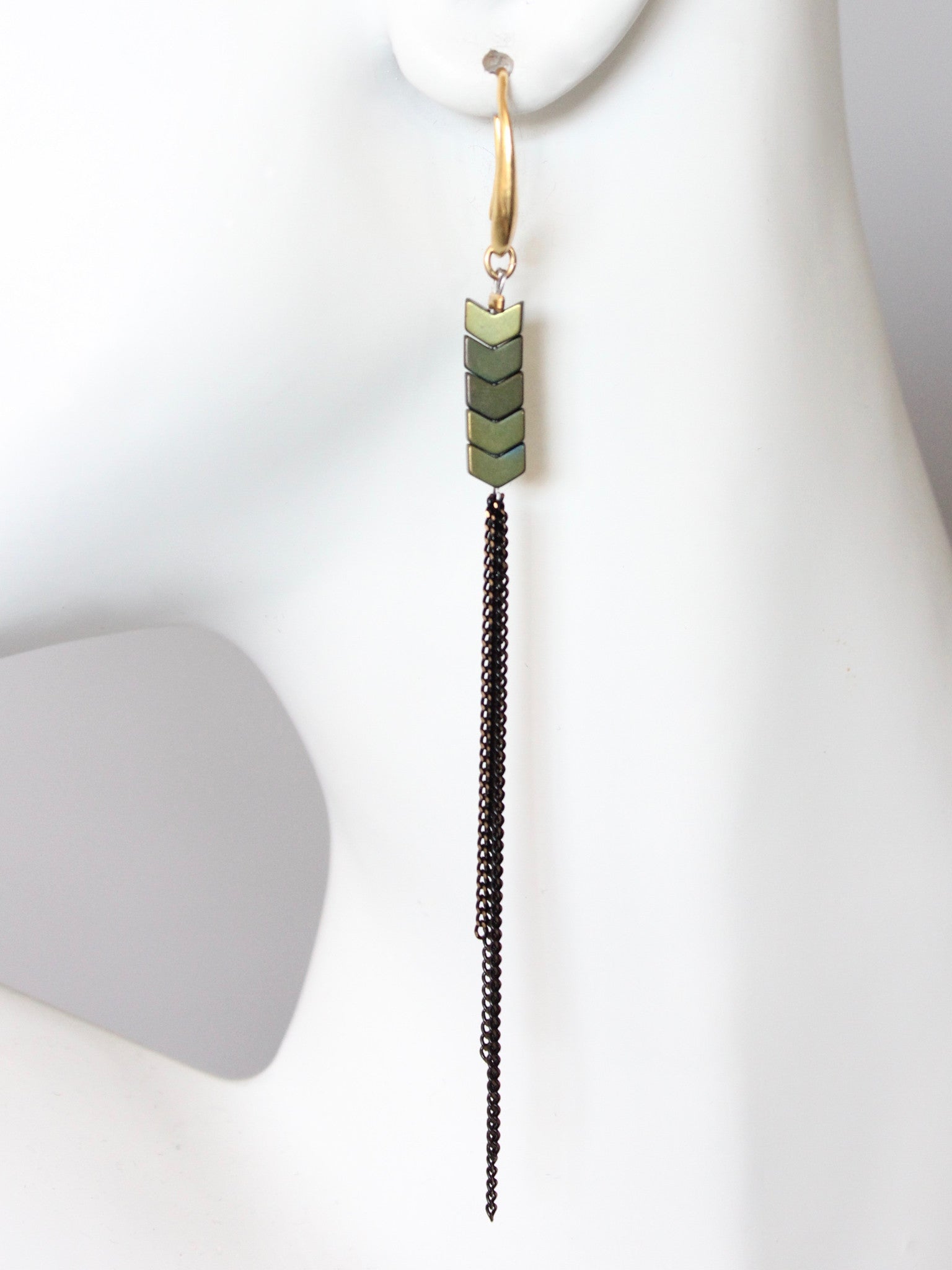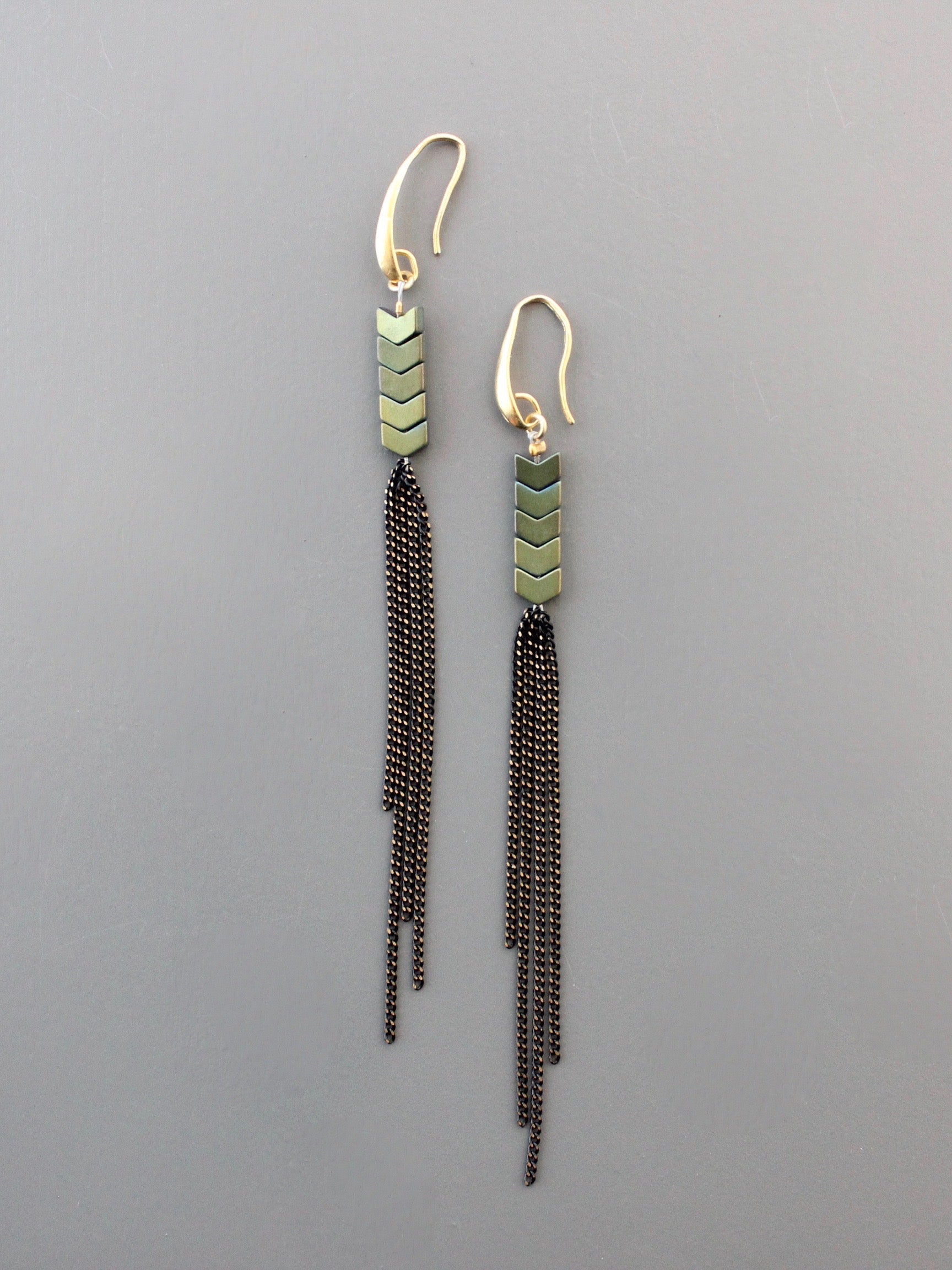 18K gold plated French hook earrings with black plated brass chain and plated hematite beads. 4.75” drop.