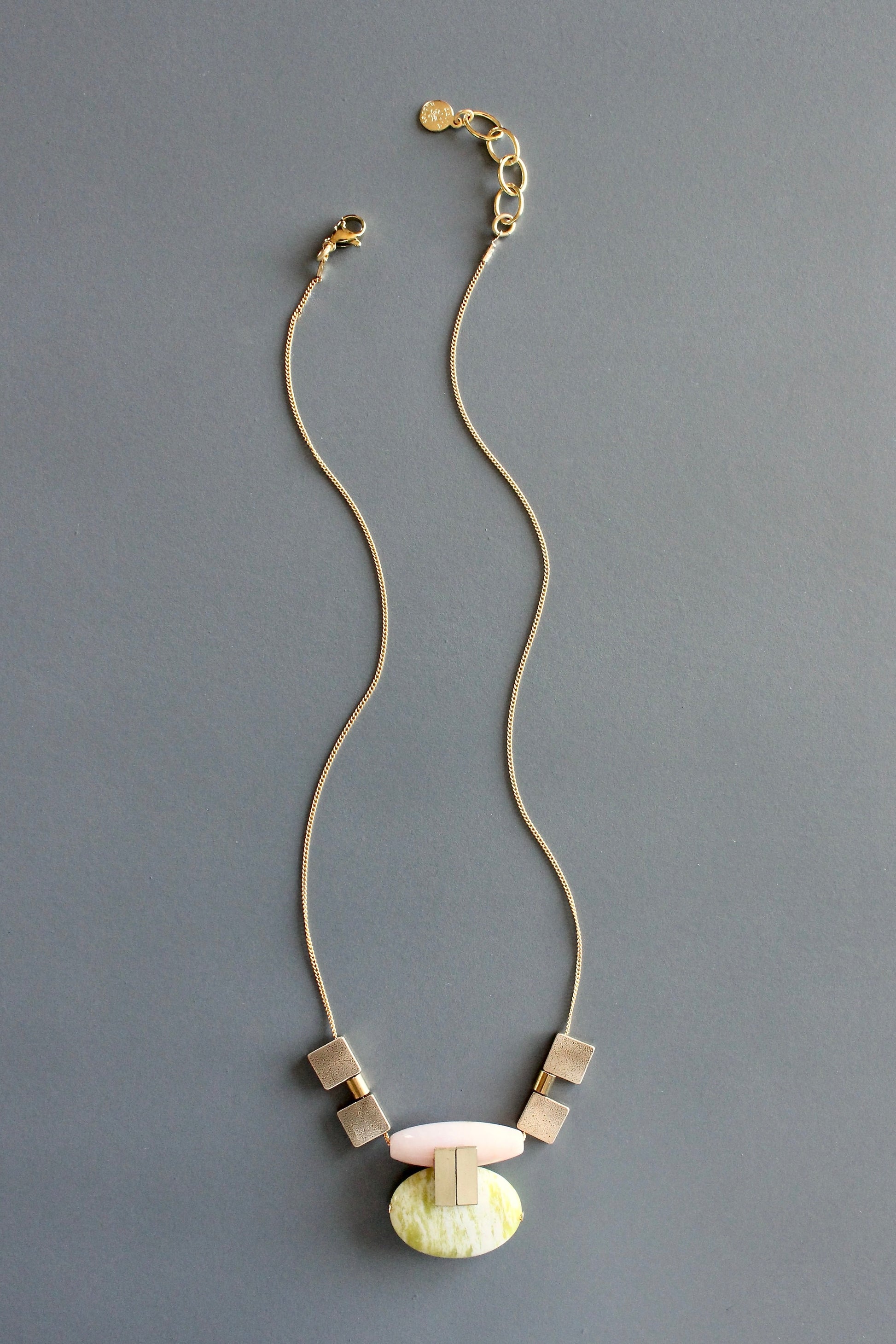 Mixed blush and yellow jade stone beads with brass square accents on gold tone plated chain. Measures 16 inches long. 1 inch extender.