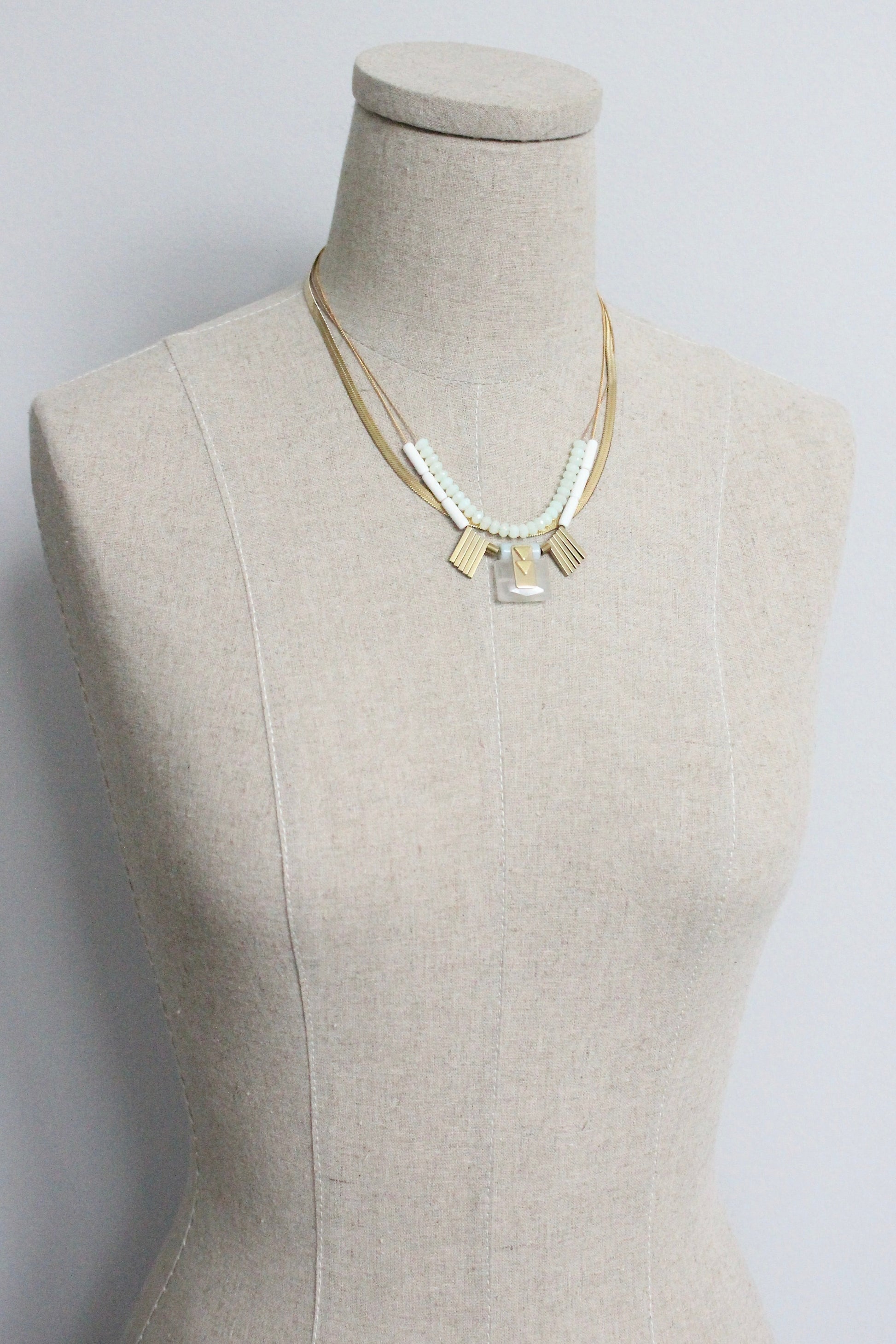 White glass beads with brass fringe accents and pale blue chalcedony charm on gold tone plated snake chains. Measures 17 inches long. 1 inch extender.